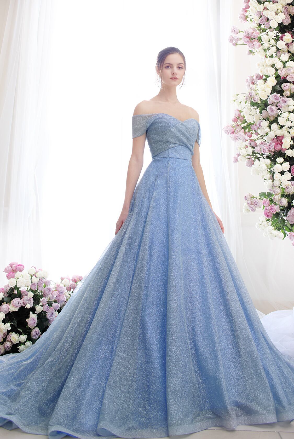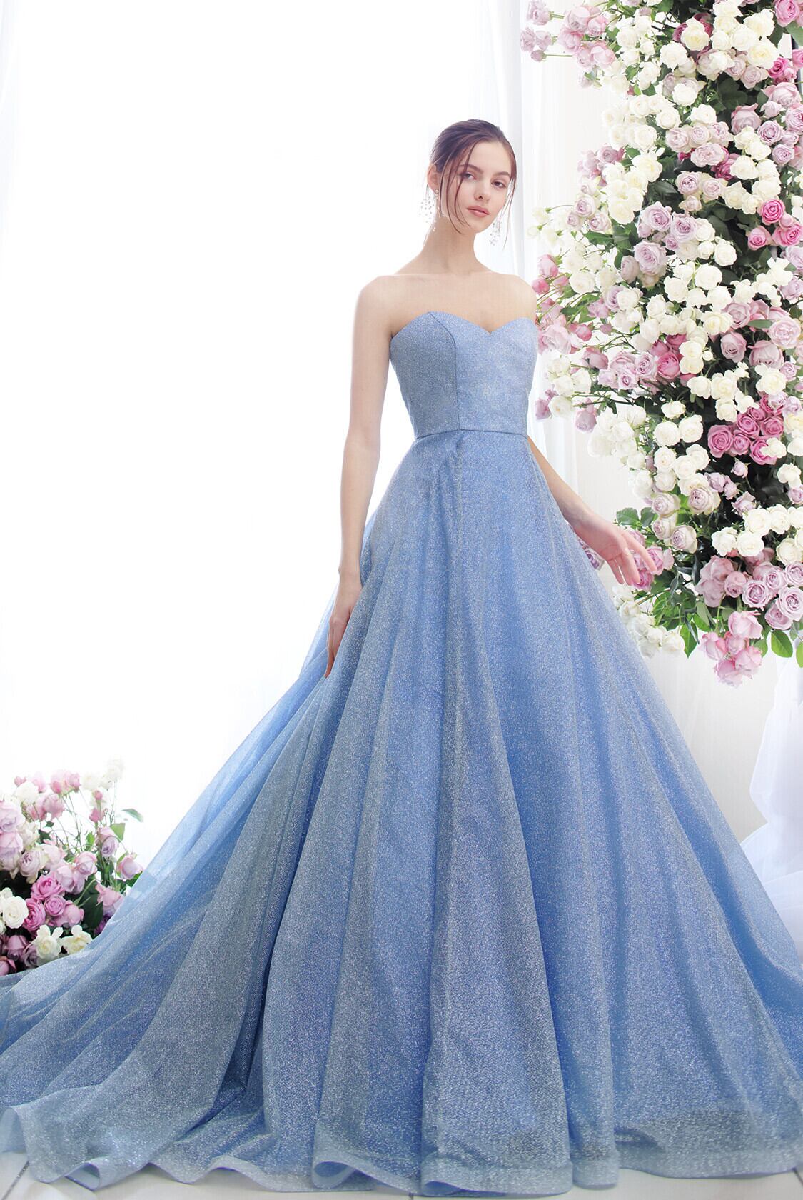高品質!送料無料!カラードレス ブルー/青 2WAY パーティードレス ベアトップ トップス キラキラグリッターチュール エレガント トレーン オーダーメイド 花嫁 結婚式/前撮り | David1021k Dress(ダヴィドレス)