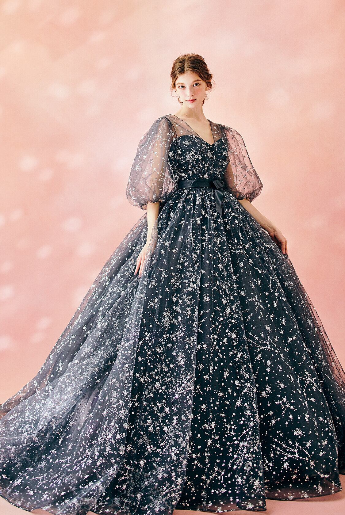 高品質!送料無料!カラードレス ブラック/黒 パフスリーブ パーティードレス キラキラグリッターチュール エレガント トレーン プリンセスライン オーダーメイド 花嫁 結婚式/前撮り