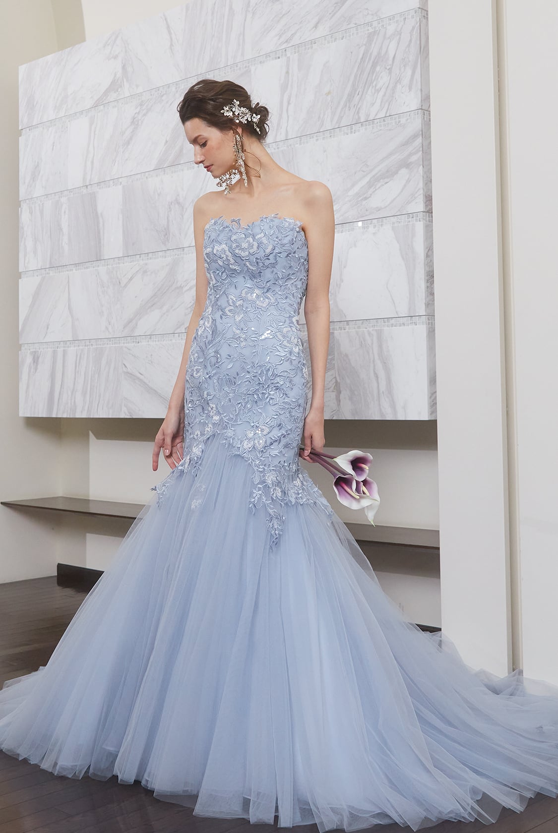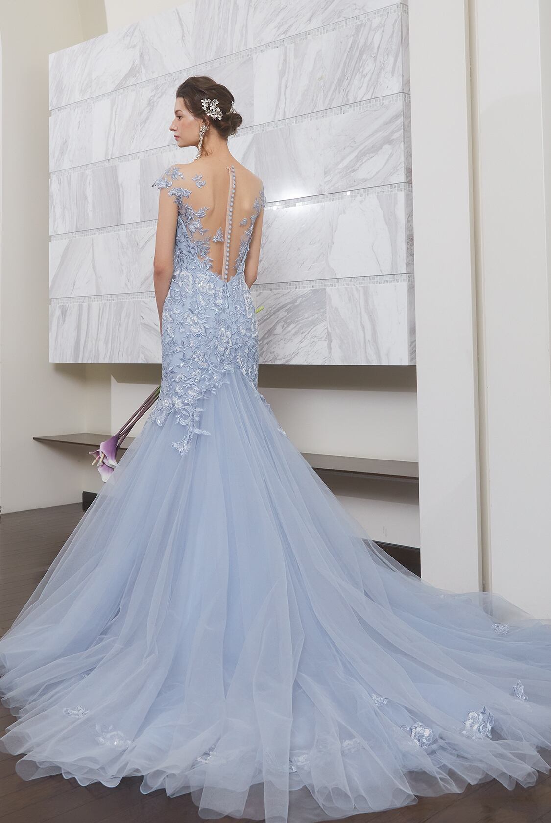 豪華!送料無料!2WAYカラードレス ブルー/青 マーメイドライン 花モチーフ刺繡 上品レースボレロ 優雅なシルエット トレーン オーダードレス ハンドメイド 花嫁/挙式/前撮り/結婚式/披露宴 | David1021k Dress(ダヴィドレス)