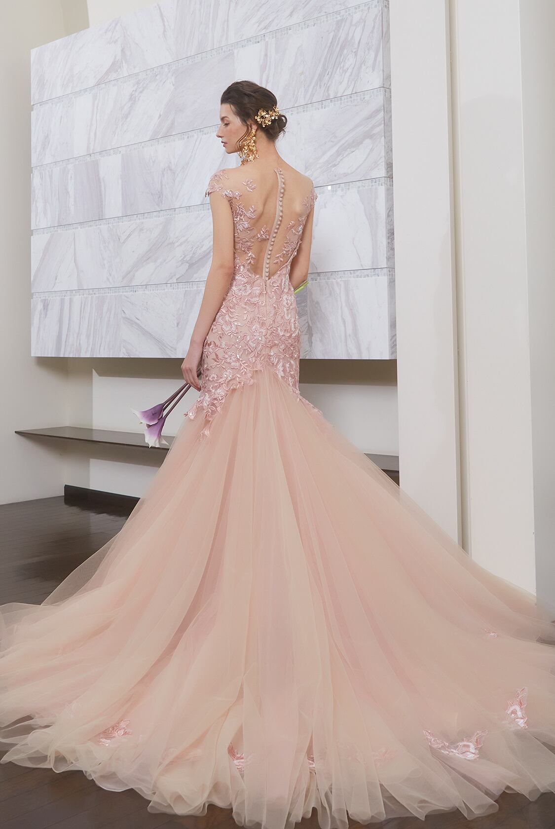 豪華!送料無料!2WAYカラードレス ピンク マーメイドライン 花モチーフ刺繡 上品レースボレロ 優雅なシルエット トレーン オーダードレス ハンドメイド 花嫁/挙式/前撮り/結婚式/披露宴 | David1021k Dress(ダヴィドレス)