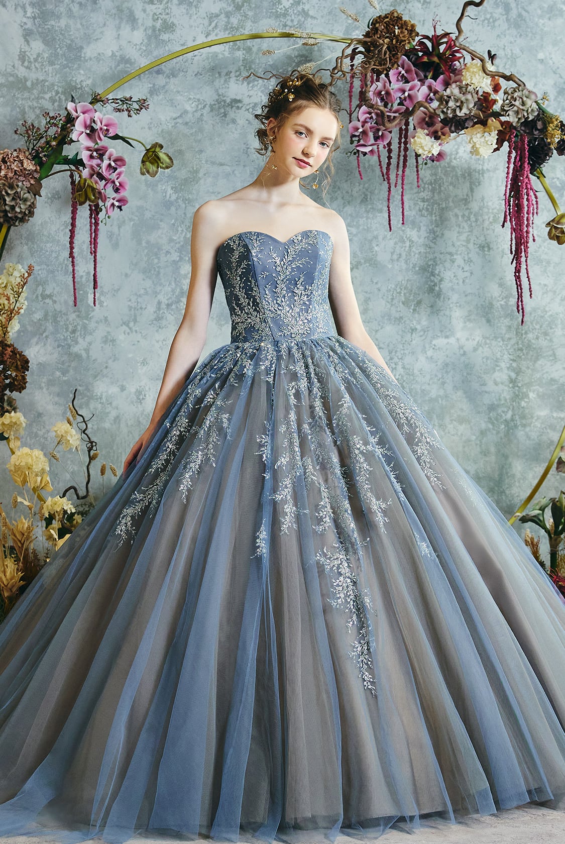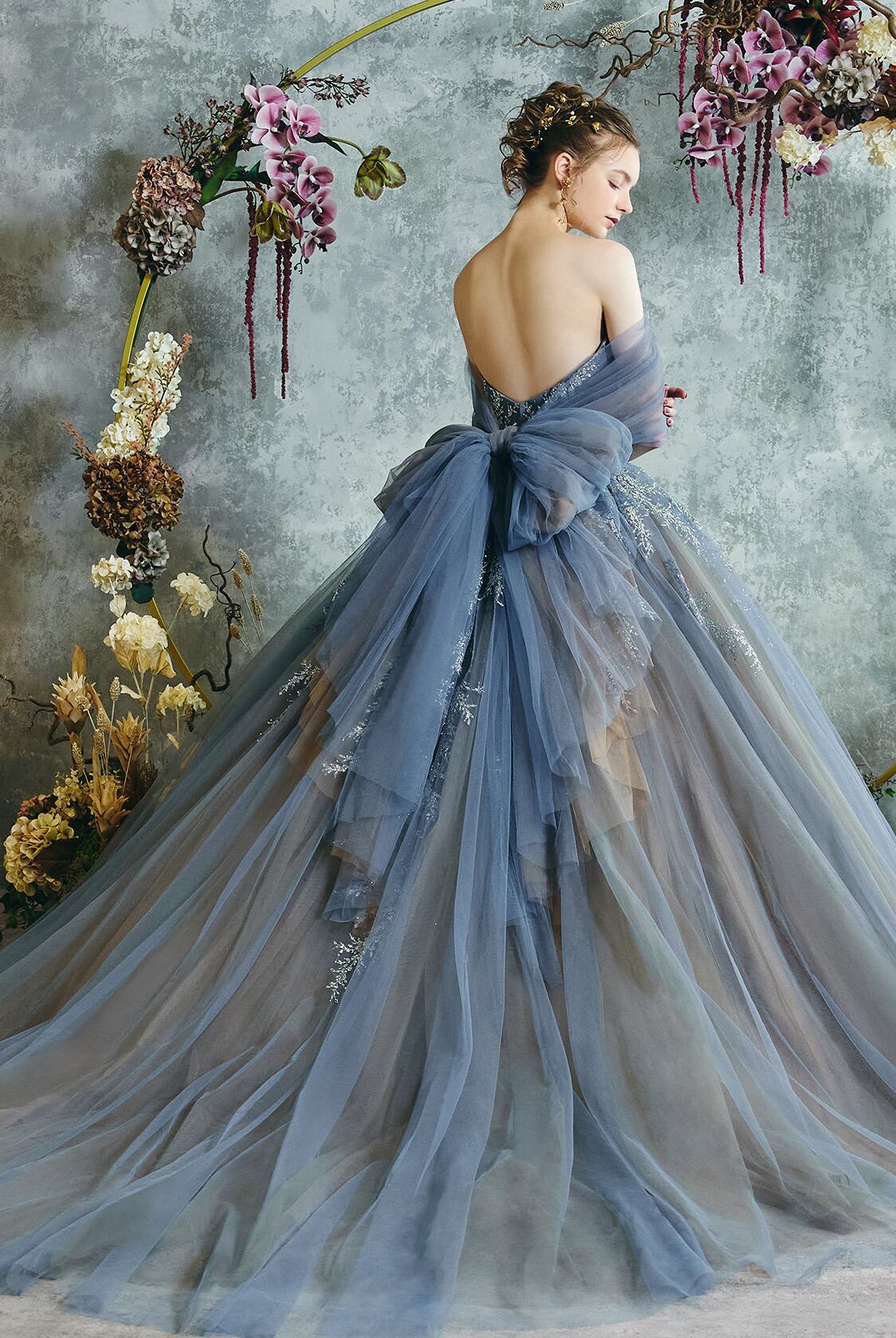 高品質!送料無料!カラードレス ブルー/青 オフショル バックリボン 上品レース パーティードレス グラデーション ソフトチュール エレガント トレーン オーダーメイド 花嫁 結婚式/前撮り | David1021k Dress(ダヴィドレス)