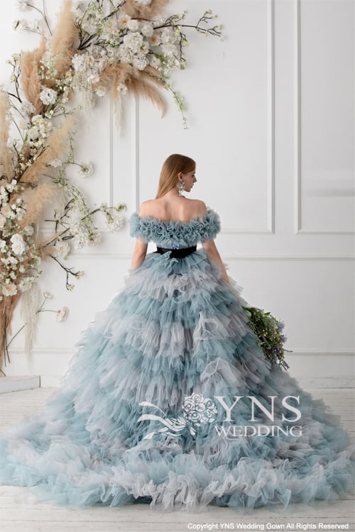 高品質!送料無料!カラードレス ブルー/青 オフショルダー グラデーション パーティードレス 柔らかく重ねたチュールスカート もこもこ ボリューミー エレガント トレーン 花嫁 結婚式/前撮り