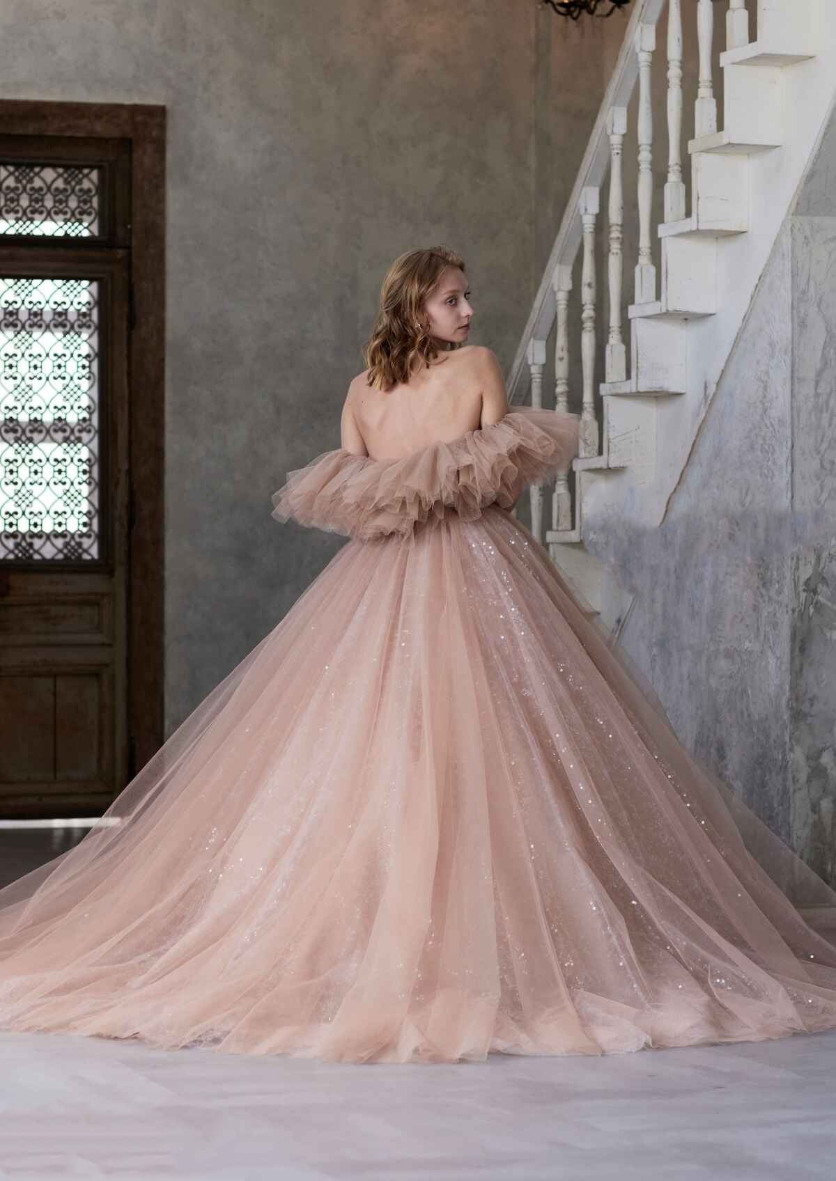 高品質!送料無料!2WAYカラードレス ベージュ色 オフショルダー キラキラグリッターチュール パーティードレス エレガント トレーン オーダーメイド 花嫁 結婚式/前撮り | David1021k Dress(ダヴィドレス)