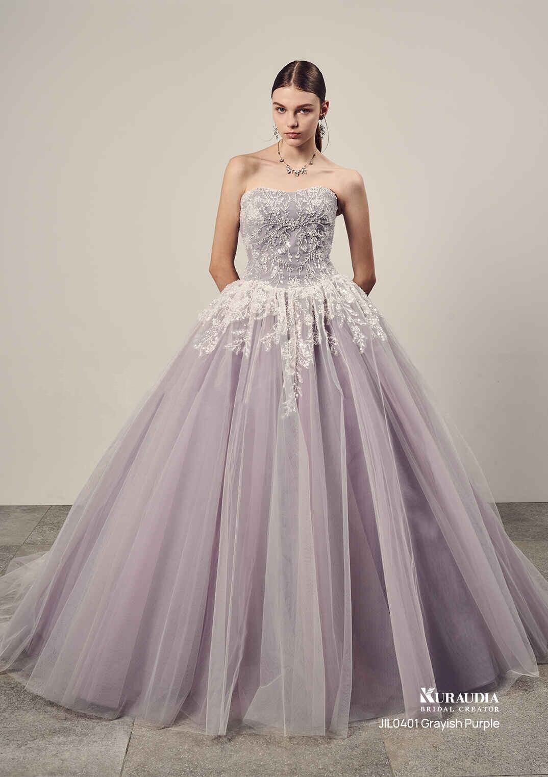 高品質!送料無料!カラードレス パープル/紫 ラベンダー色 上品レース パーティードレス 花モチーフ刺繡 ソフトチュール エレガント トレーン オーダーメイド 花嫁 結婚式/前撮り | David1021k Dress(ダヴィドレス)