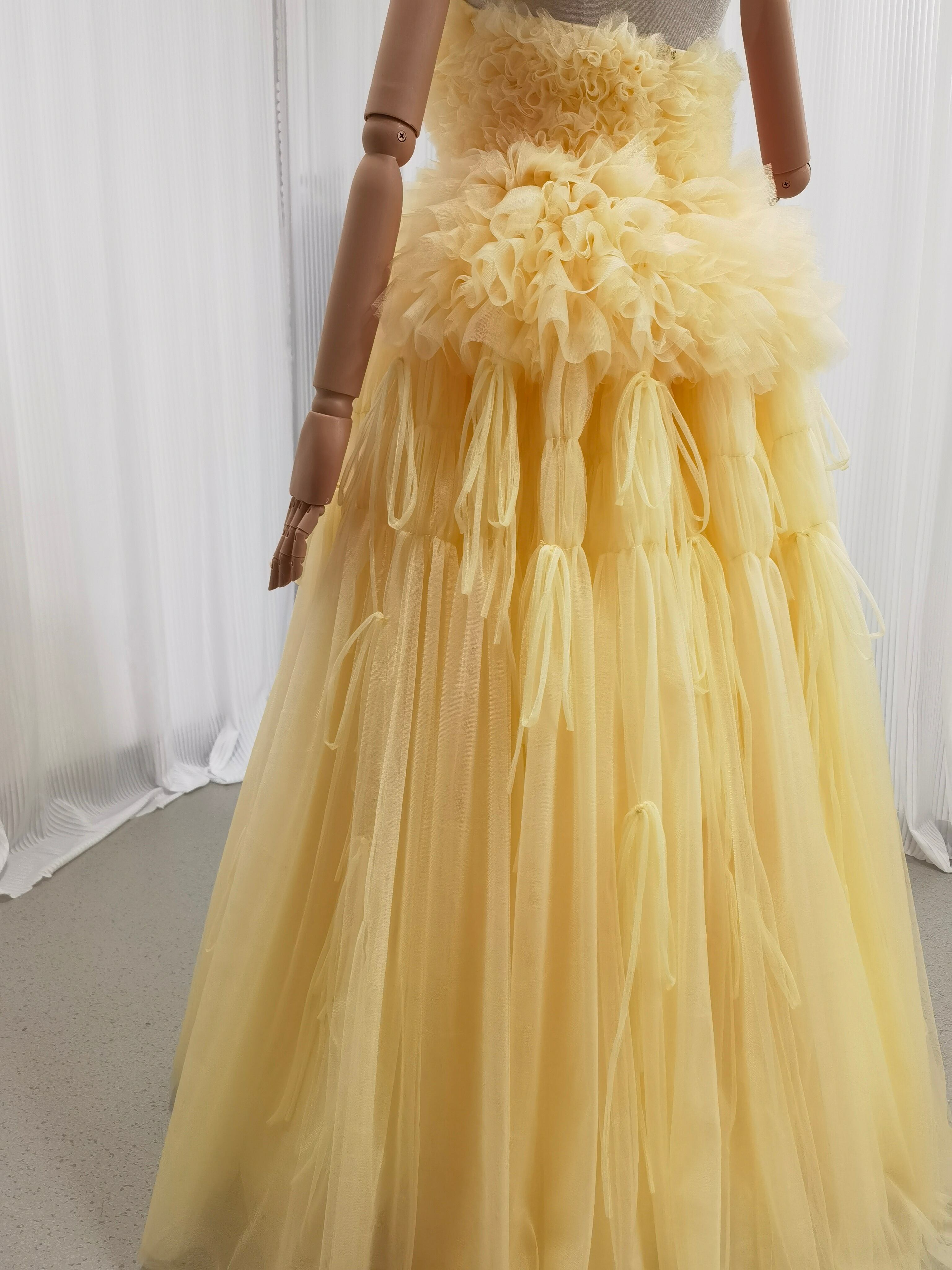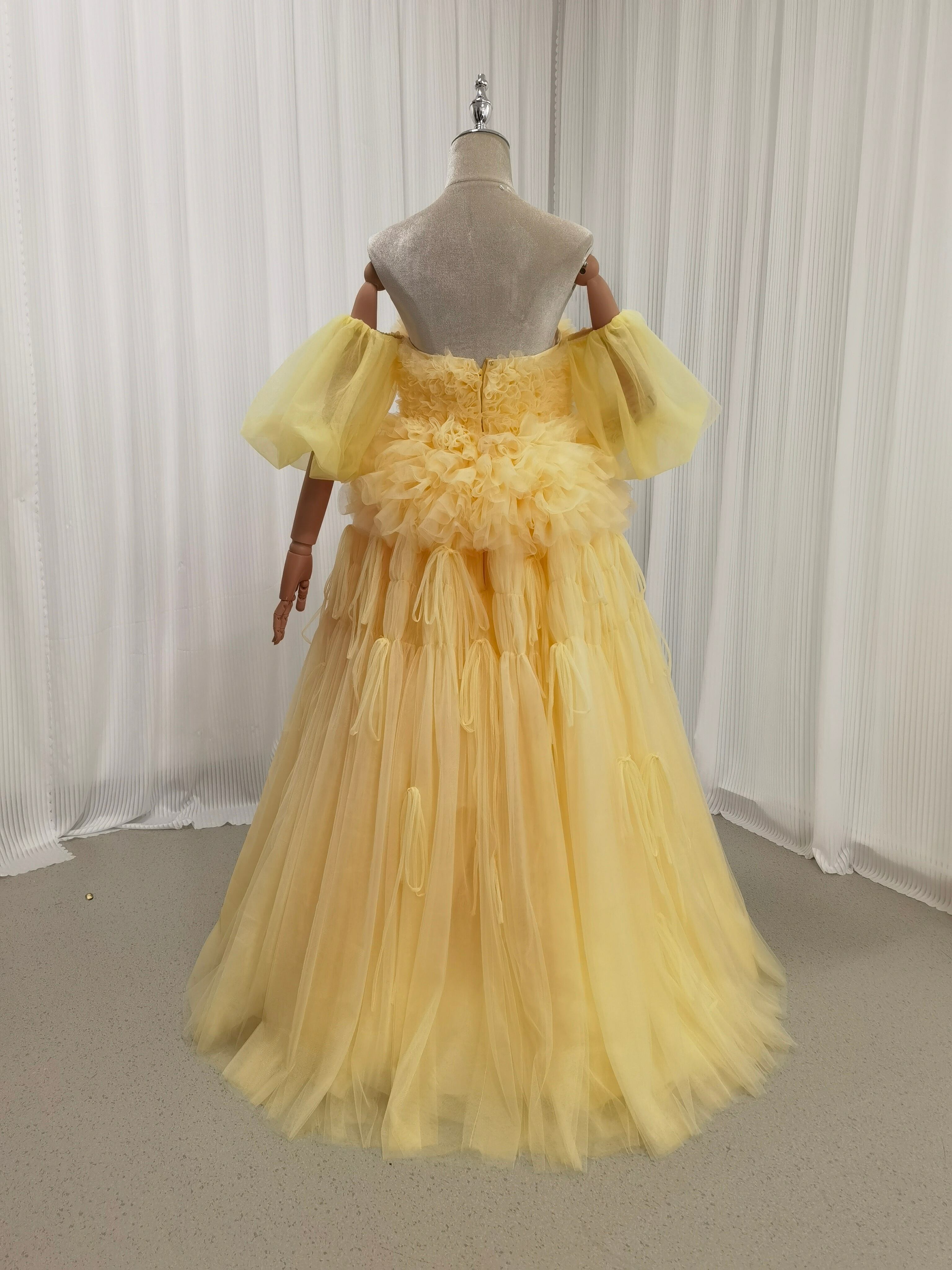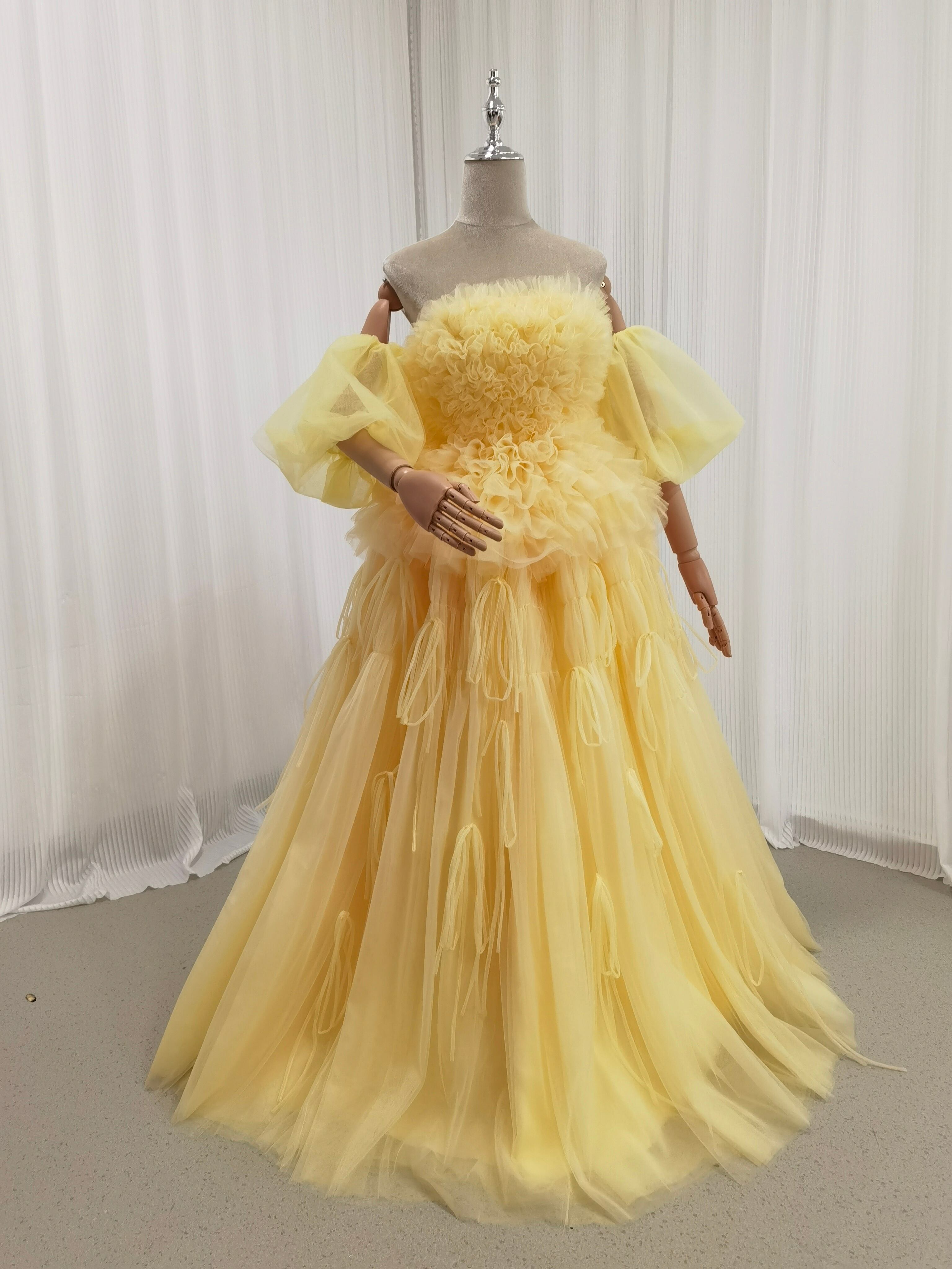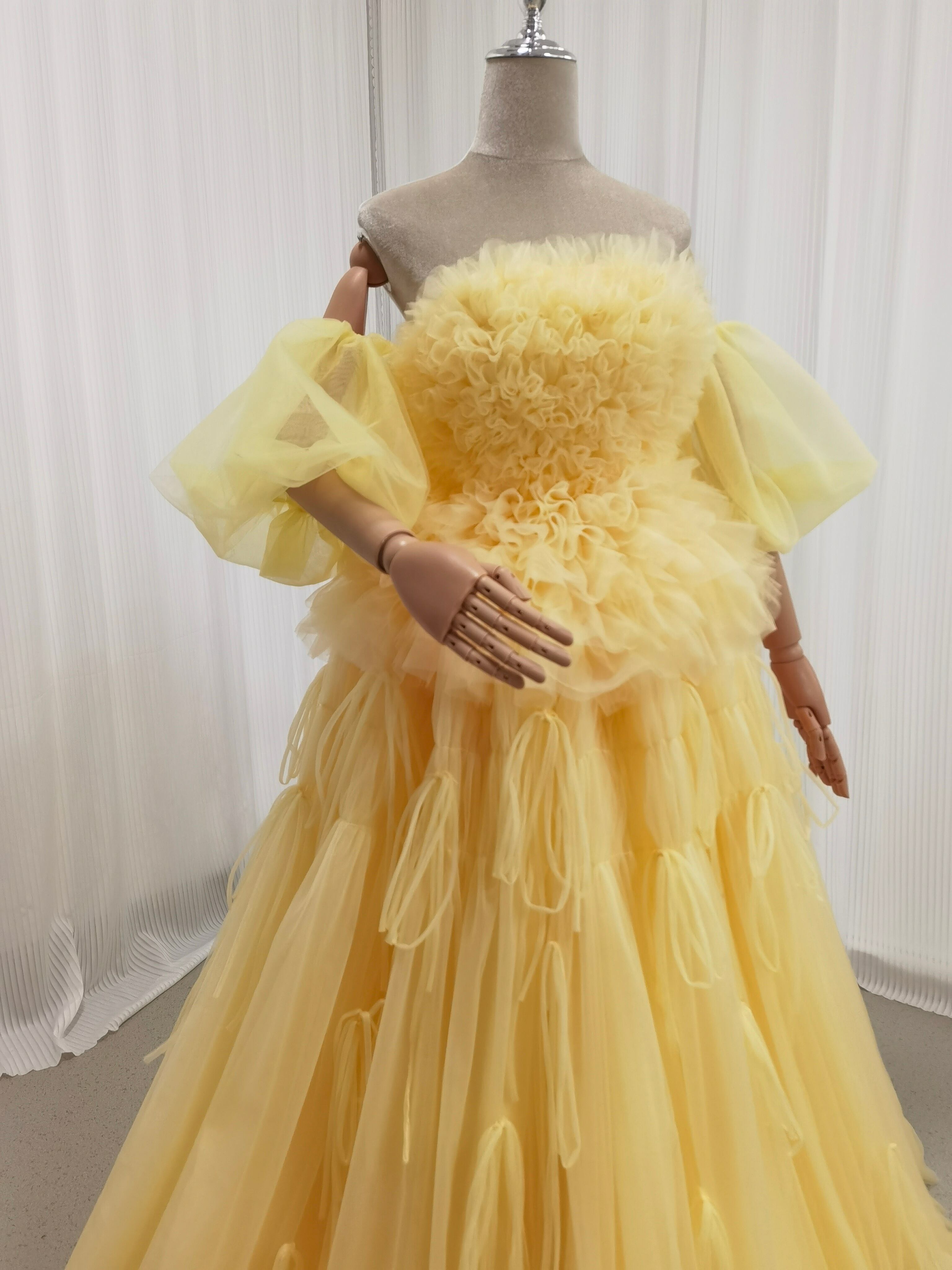 豪華!送料無料!パステルイエロー カラードレス ベアトップ 取り外し袖 ソフトチュール花嫁/挙式/前撮り/結婚式/披露宴