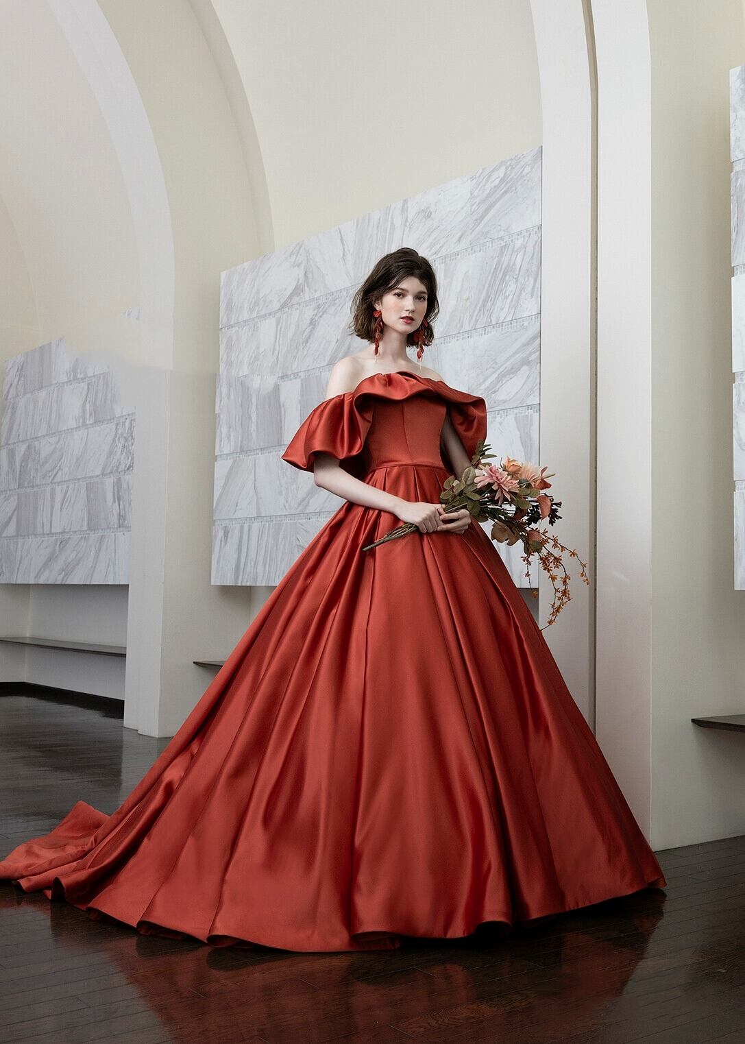 高品質!送料無料!カラードレス オフショルダー テラコッタ色 画像通りの仕上がり Aライン プリンセスライン エレガント 細見えシルエット オーダードレス ハンドメイド 花嫁/挙式/前撮り/結婚式 | David1021k Dress(ダヴィドレス)