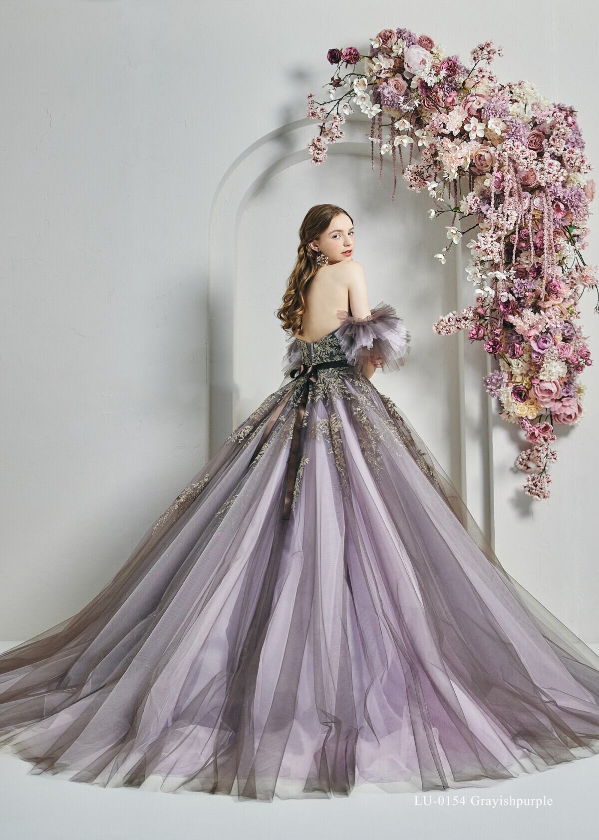 高品質!送料無料!カラードレス パープル/紫色 グラデーション 付け袖 上品レース ソフトチュール パーティードレス エレガント トレーン オーダーメイド 花嫁 結婚式/前撮り | David1021k Dress(ダヴィドレス)