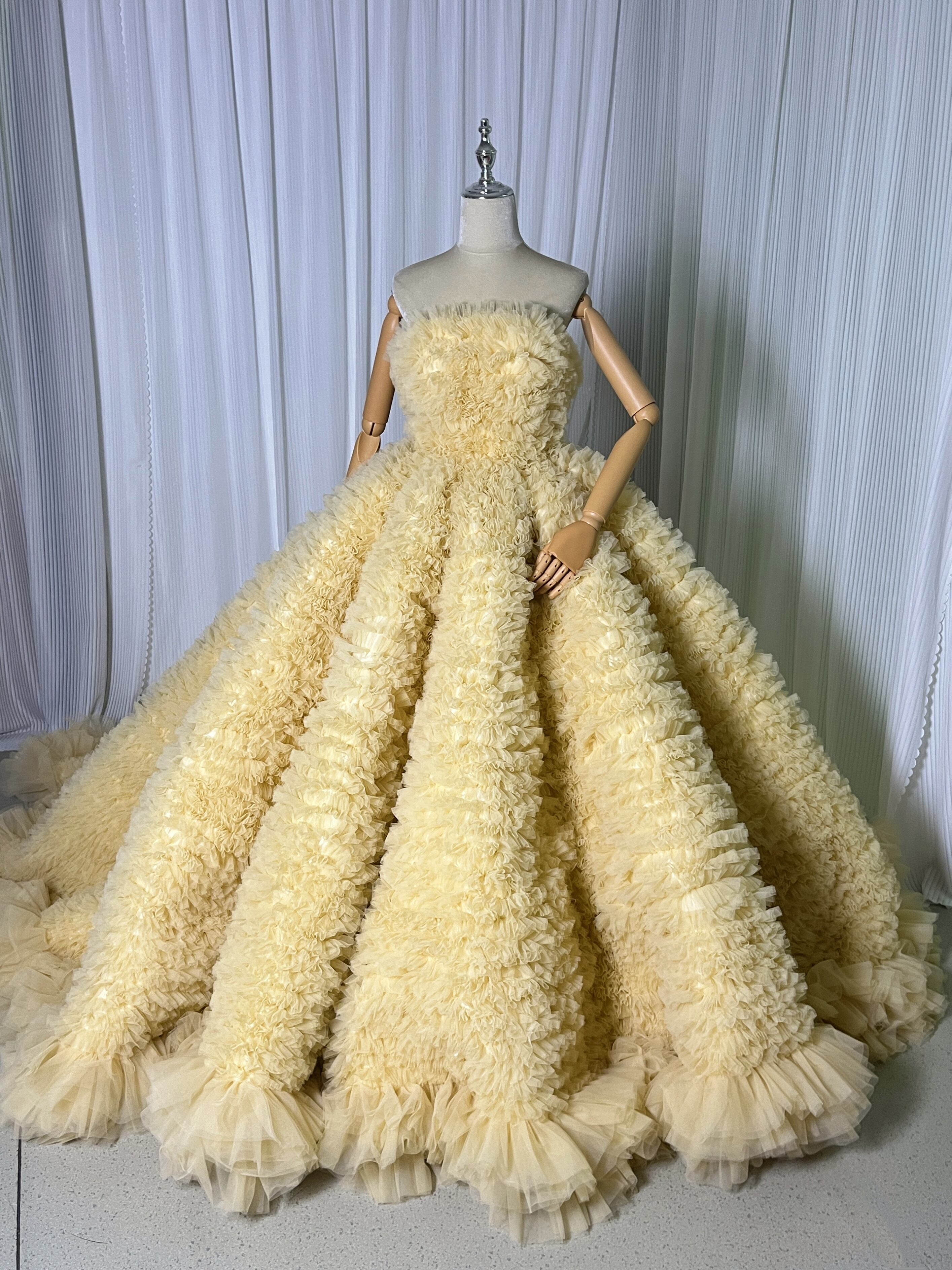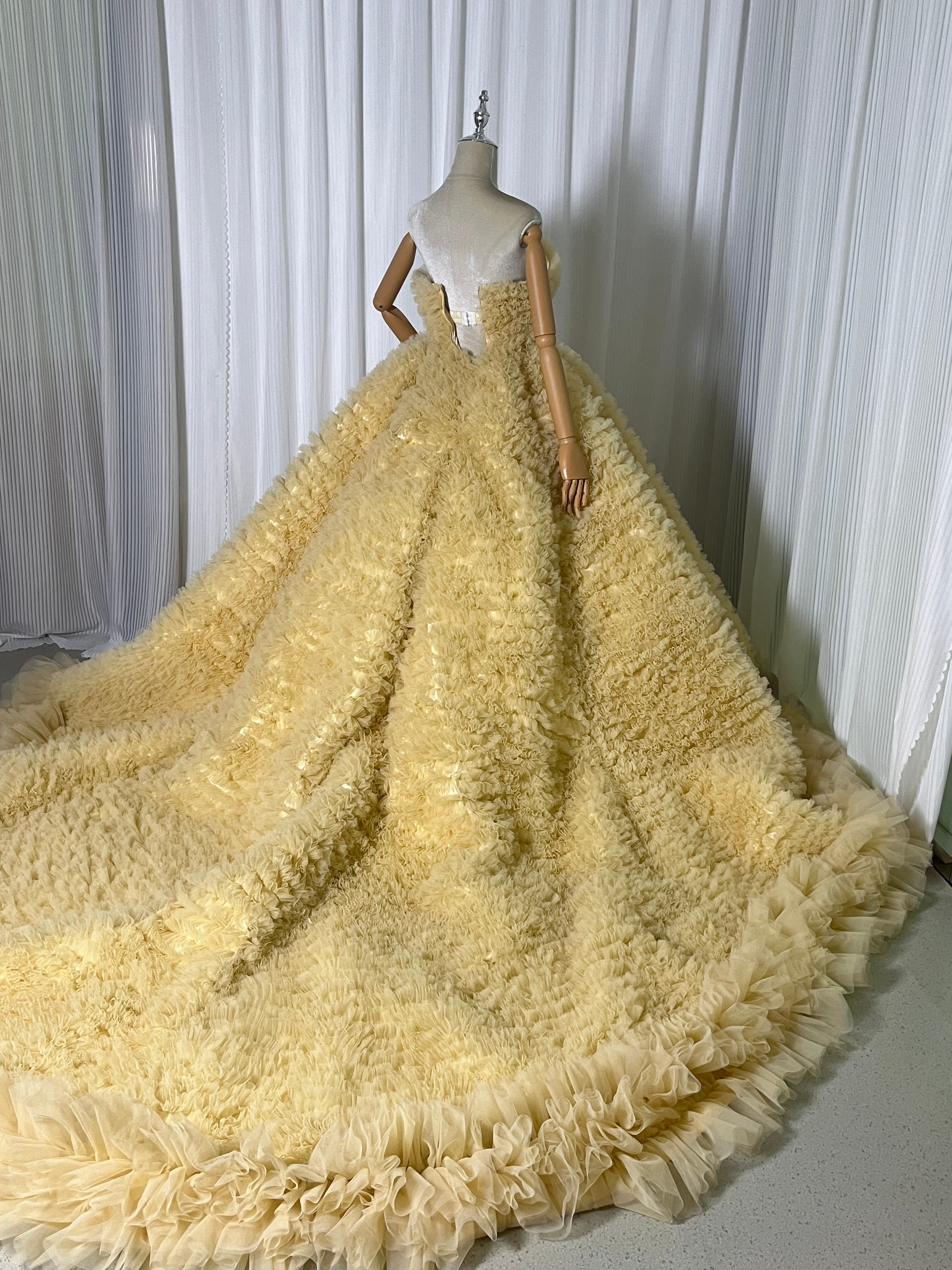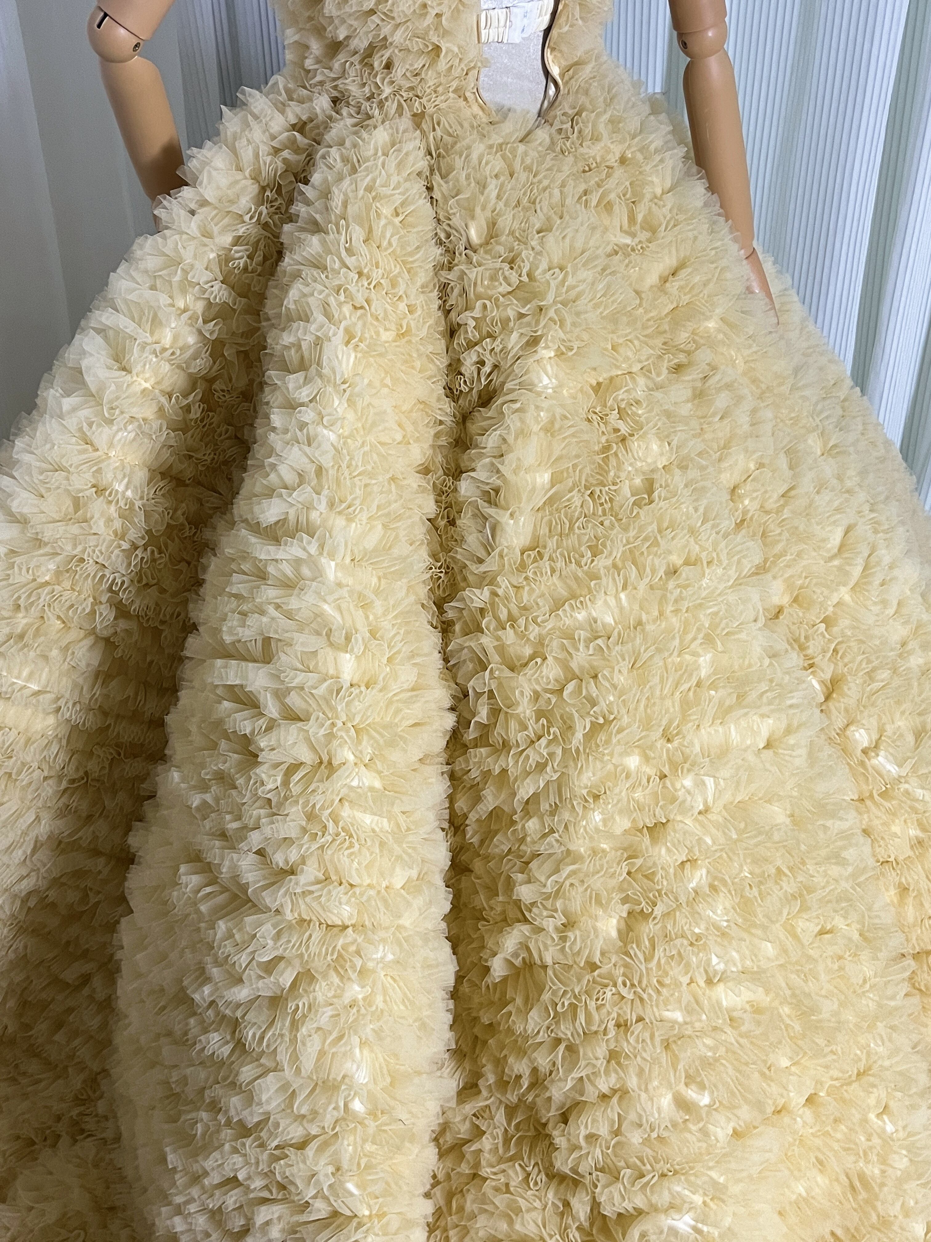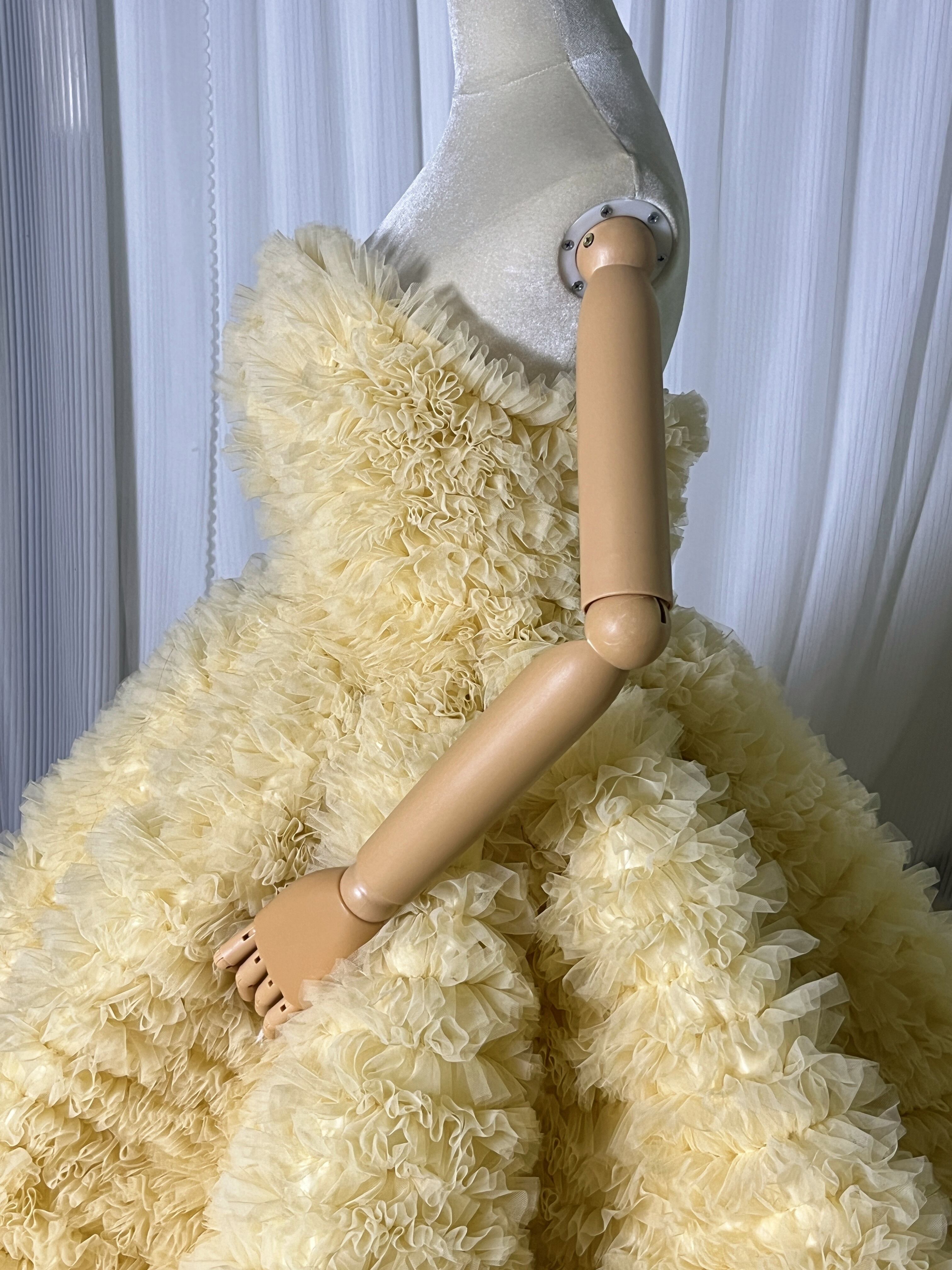 豪華!送料無料!パステルイエロー カラードレス ベアトップソフトチュール柔らかく重ねたチュールスカートボリュームドレス 花嫁/挙式/前撮り/結婚式/披露宴