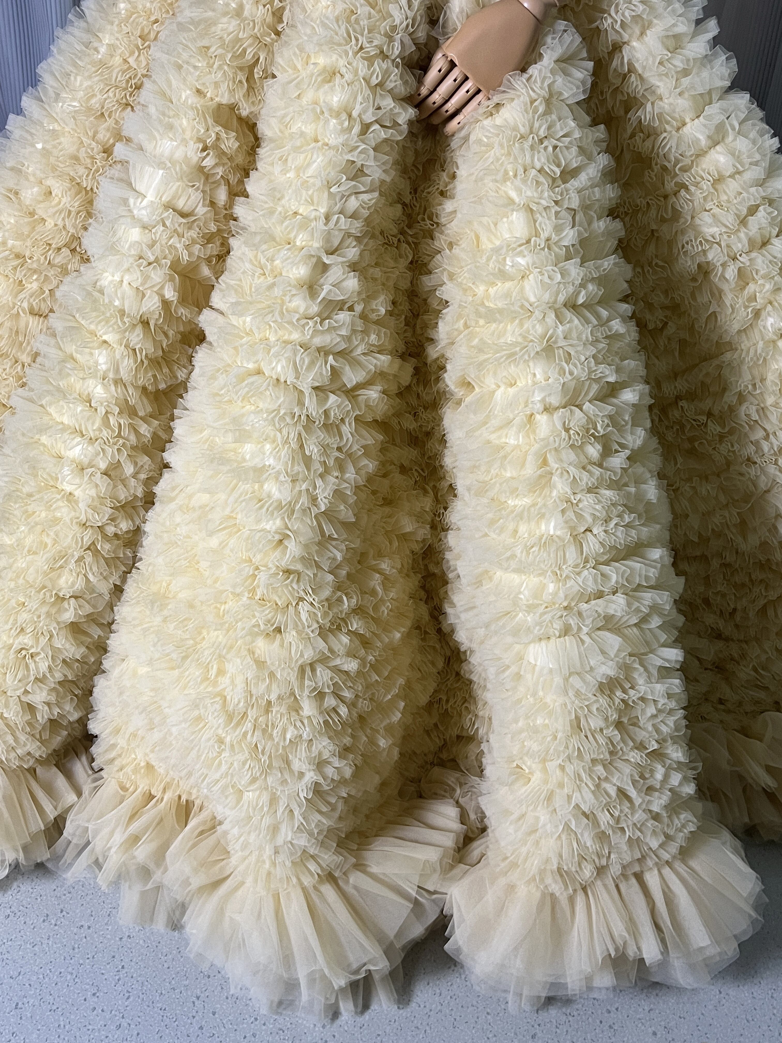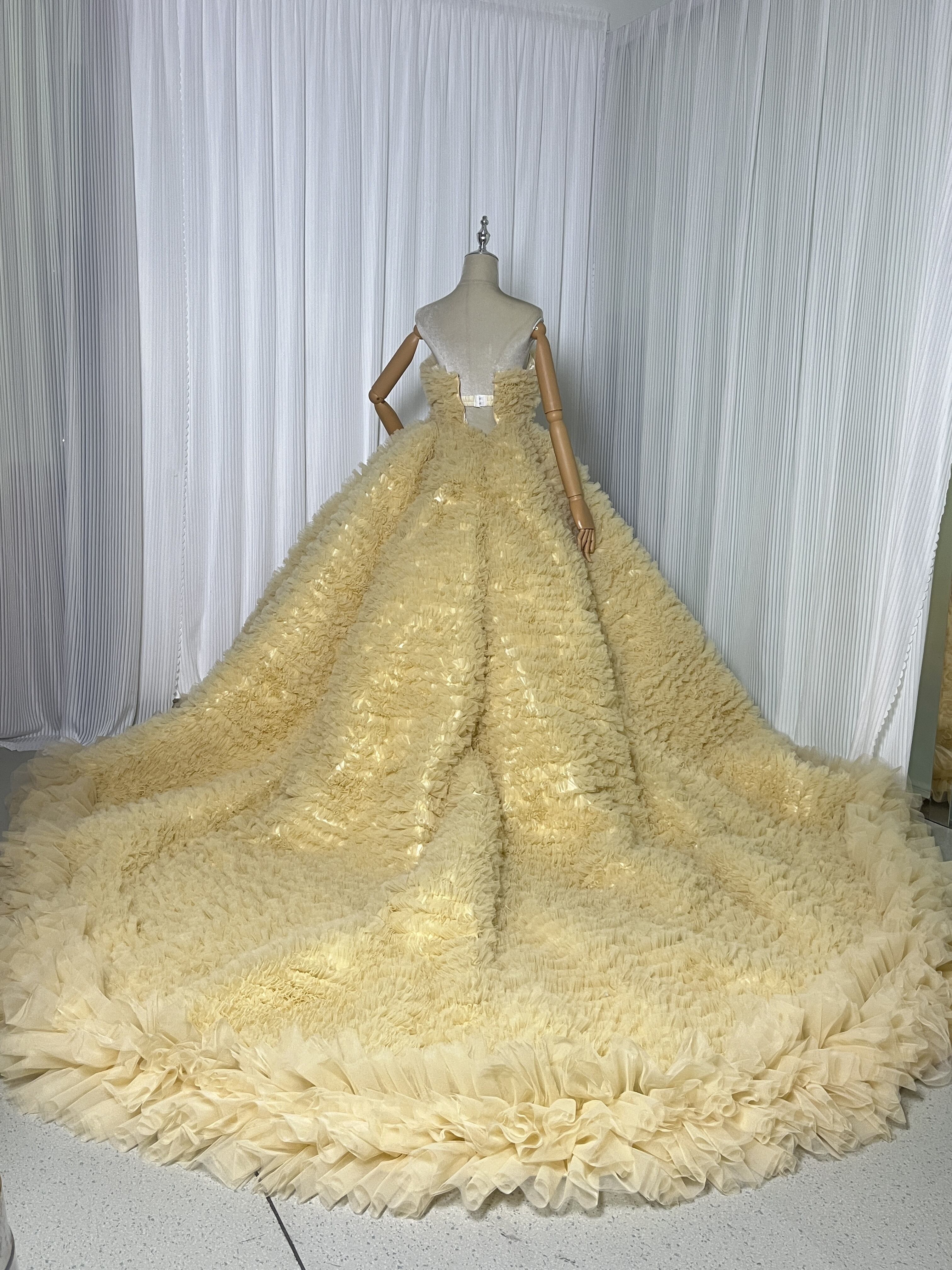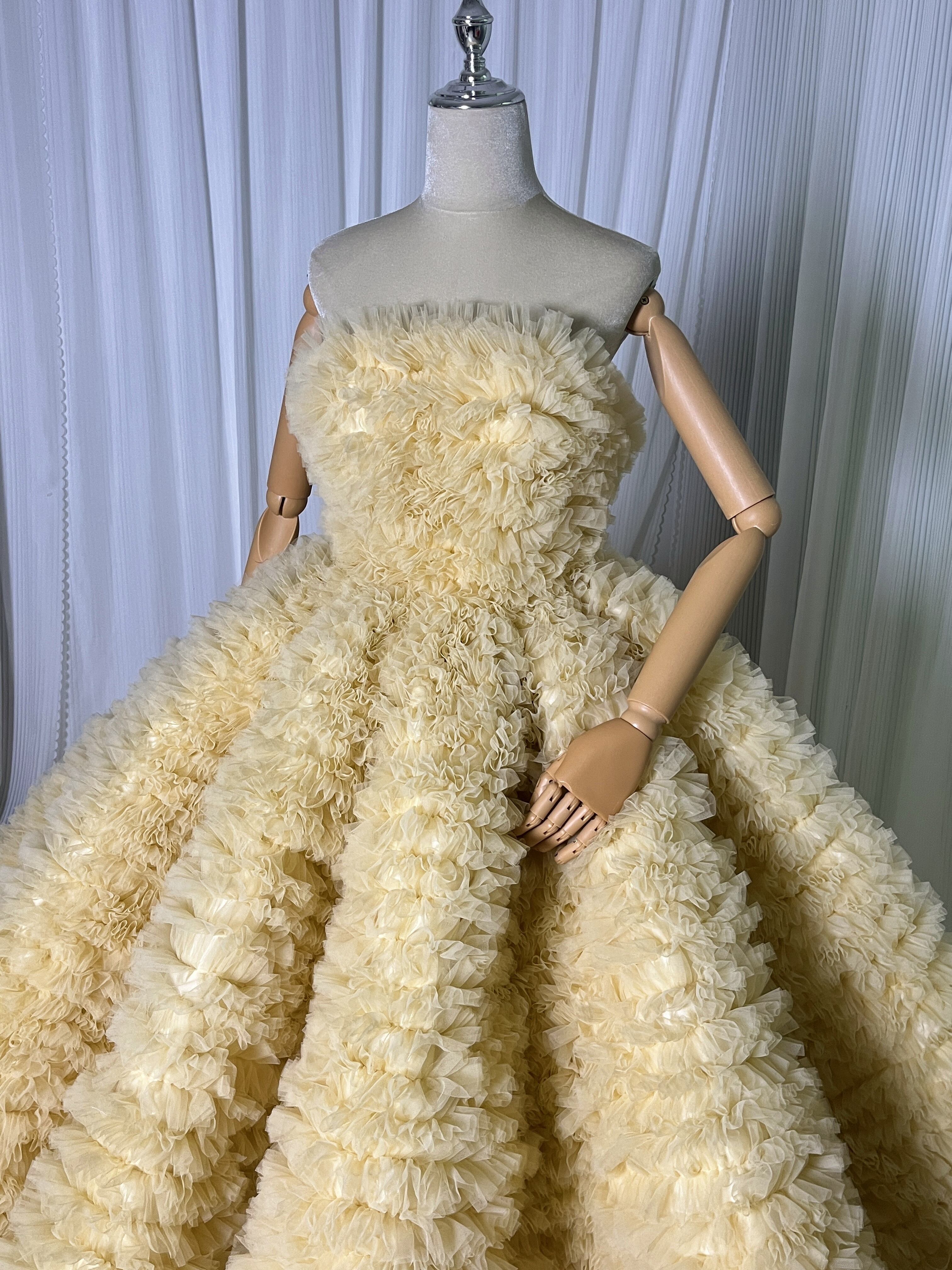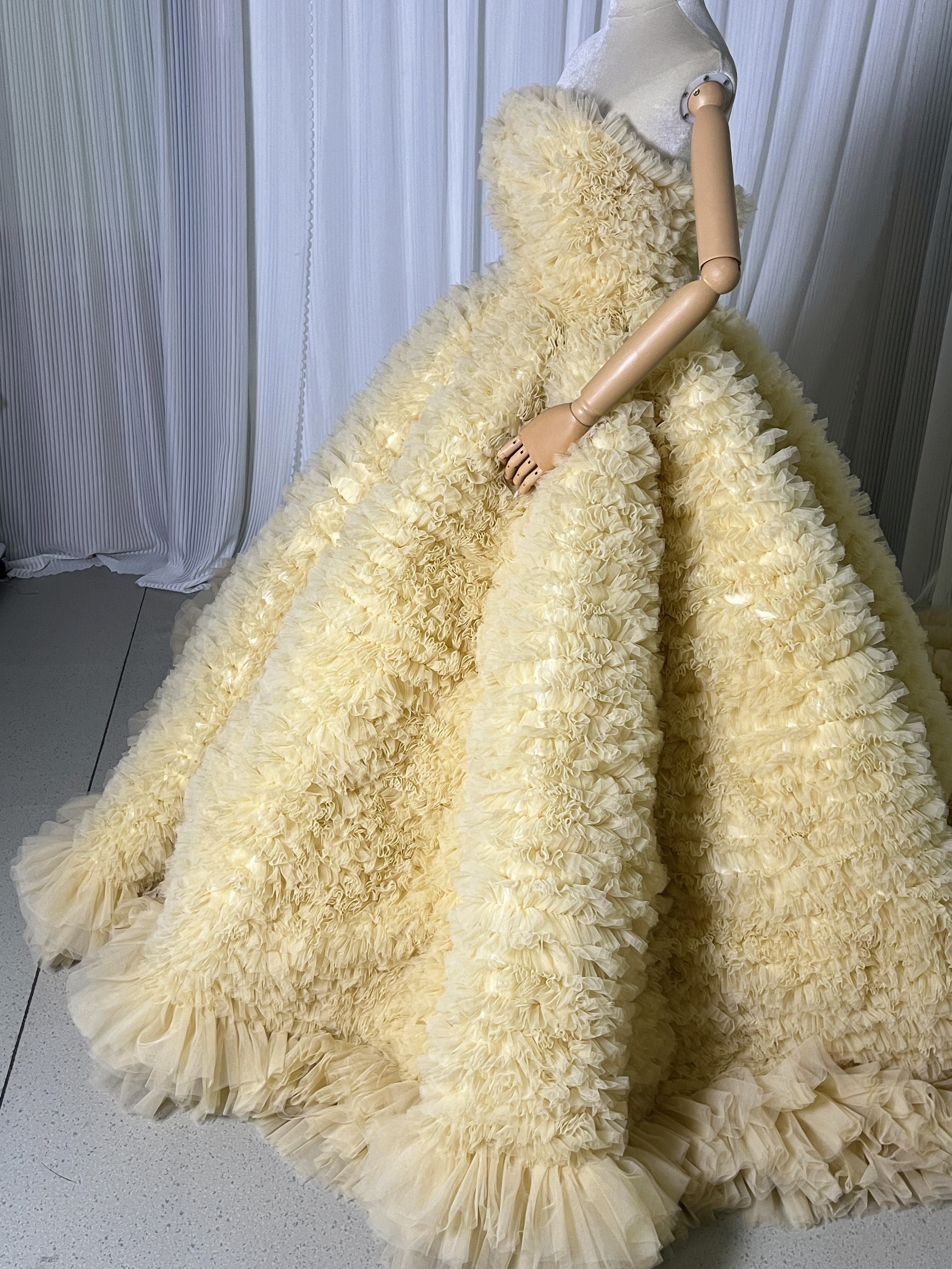 豪華!送料無料!パステルイエロー カラードレス ベアトップソフトチュール柔らかく重ねたチュールスカートボリュームドレス 花嫁/挙式/前撮り/結婚式/披露宴