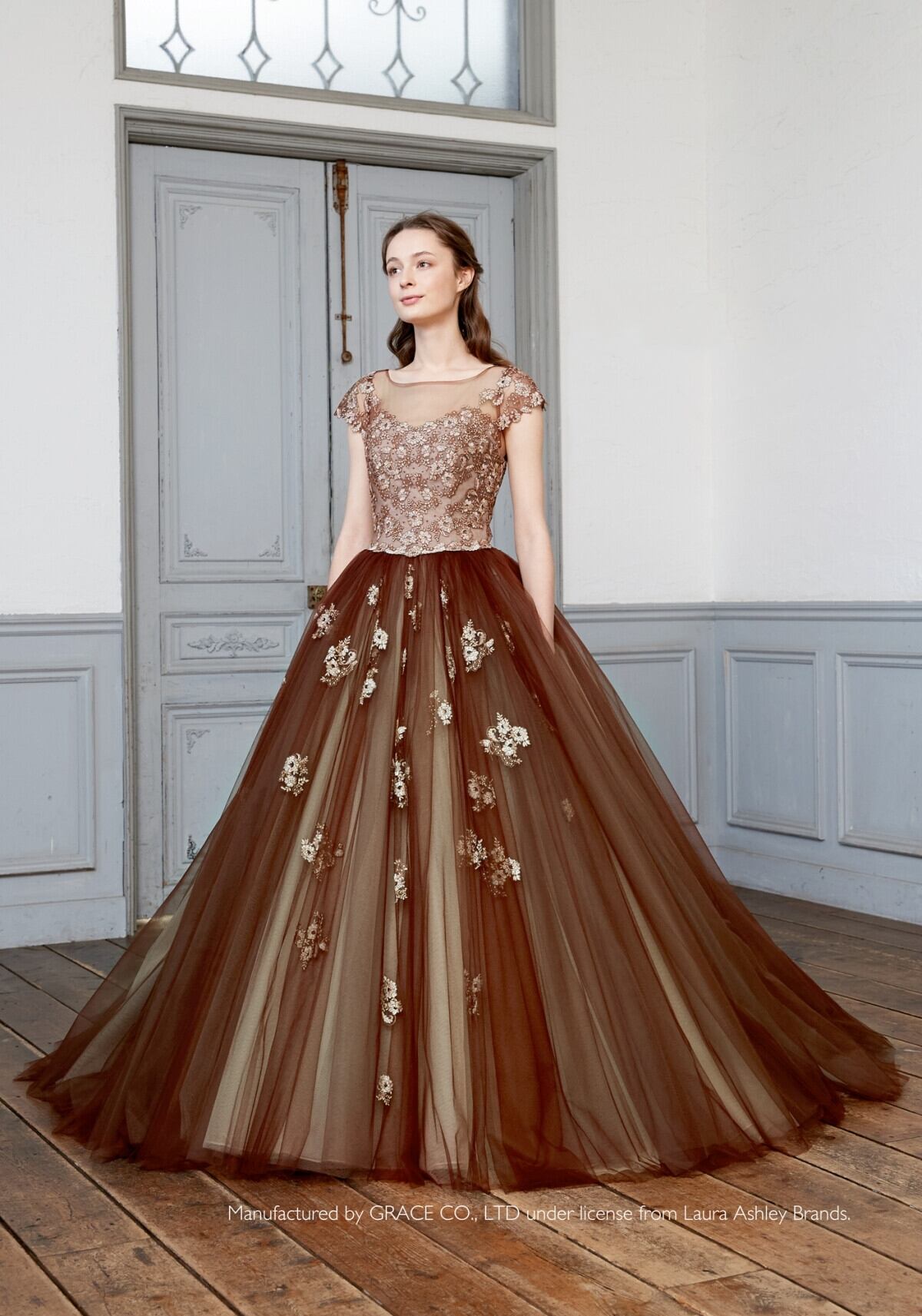 高品質!オーダーメイド!カラードレス パーティードレス 茶色 ブラウン コーヒー色 花モチーフ刺繡 Aライン エレガント ソフトチュール お色直し ステージ演出 演奏ドレス 花嫁/挙式/前撮り/結婚式 | David1021k Dress(ダヴィドレス)