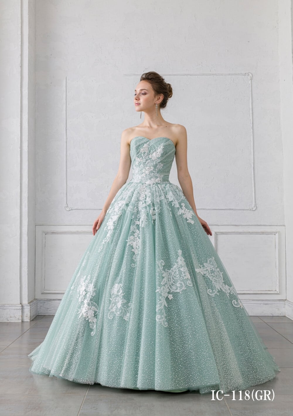 高品質!オーダーメイド!カラードレス パーティードレス 水色 ブルーグリーン キラキラグリッターチュール 花モチーフ刺繡 Aライン エレガント ベアトップ ステージ演出 演奏ドレス 花嫁/挙式/前撮り/結婚式 | David1021k Dress(ダヴィドレス)