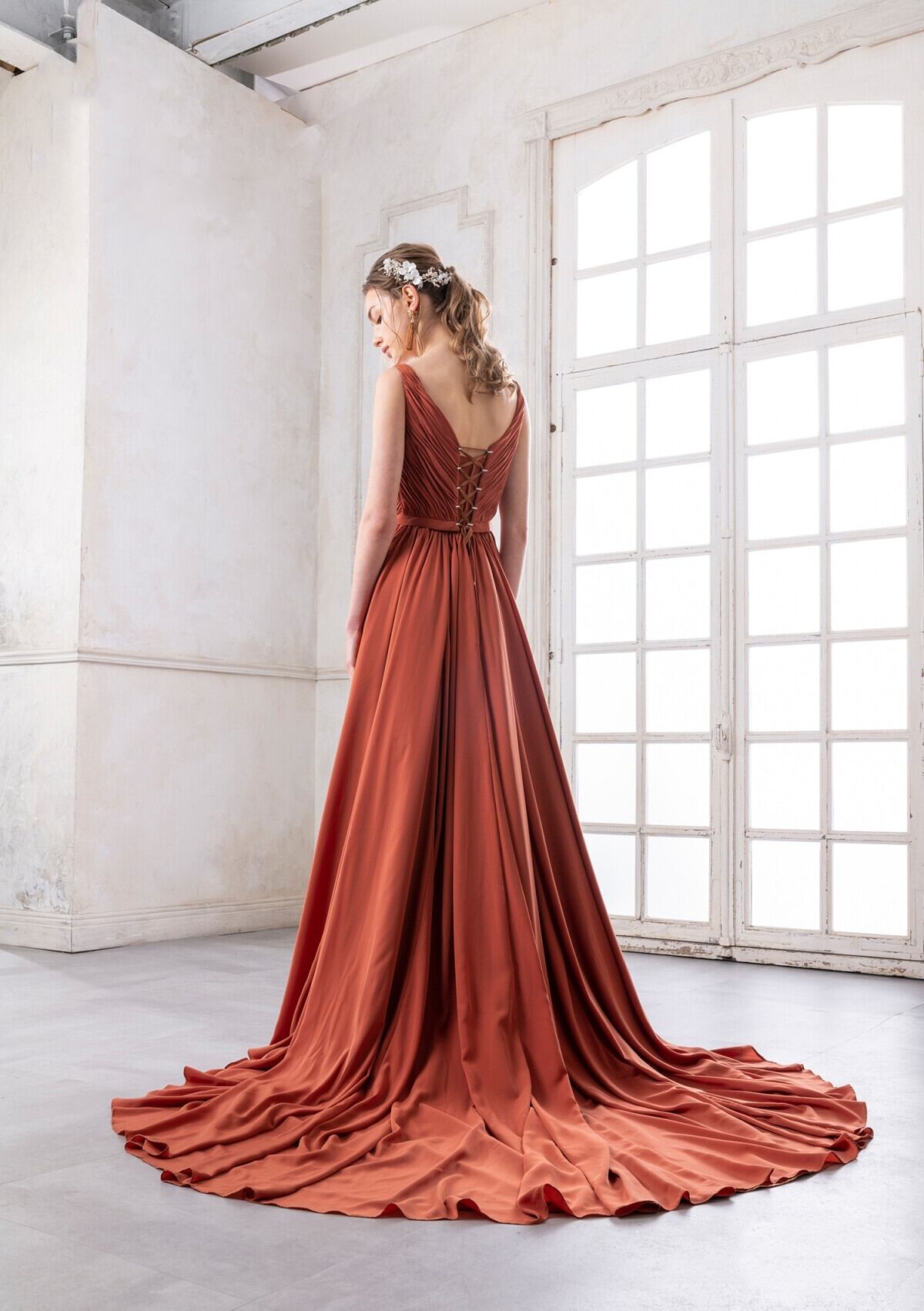 高品質!オーダーメイド!カラードレス テラコッタ色 パーティードレス Aライン エレガント ビーチウエディング ダンスドレス 演奏ドレス 花嫁/挙式/前撮り/結婚式 | David1021k Dress(ダヴィドレス)