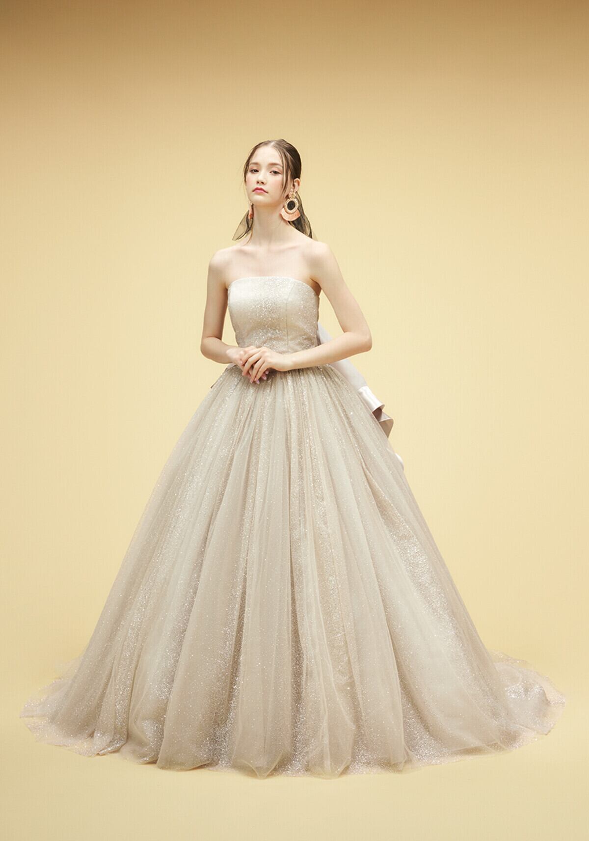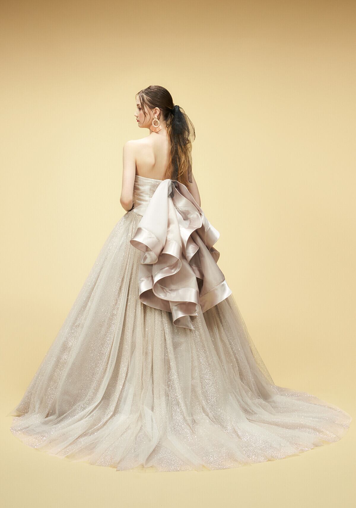 高品質!オーダーメイド!ベージュ色カラードレス パーティードレス 取り外しバックリボン キラキラグリッターチュール エレガント ステージ演出 演奏ドレス 花嫁/挙式/前撮り/結婚式 | David1021k Dress(ダヴィドレス)