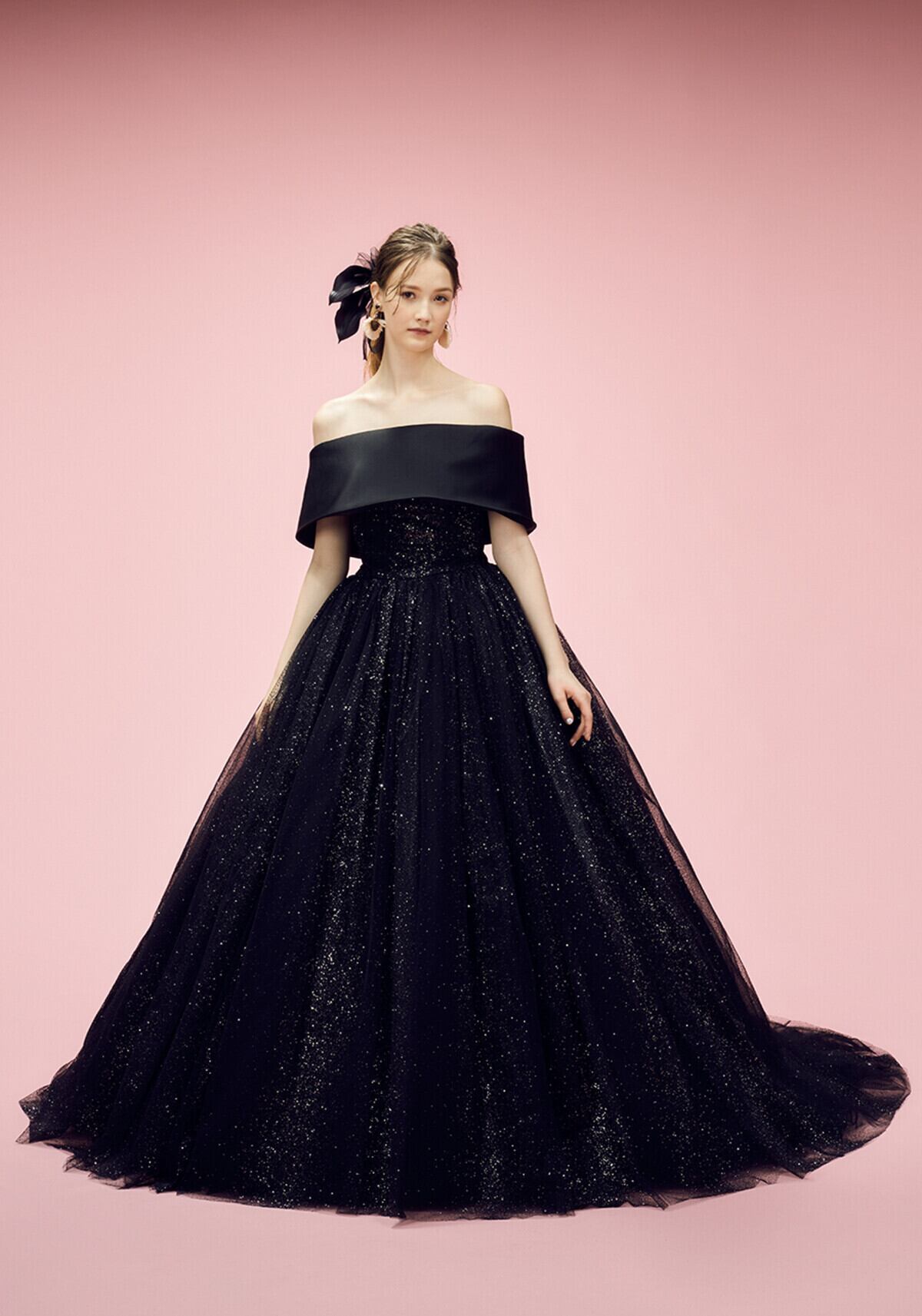 高品質!オーダーメイド!ブラック/黒 カラードレス パーティードレス ロールカラー オフショルダー キラキラグリッターチュール エレガント 歌手 ステージ演出 演奏ドレス 花嫁/挙式/前撮り/結婚式 | David1021k Dress(ダヴィドレス)