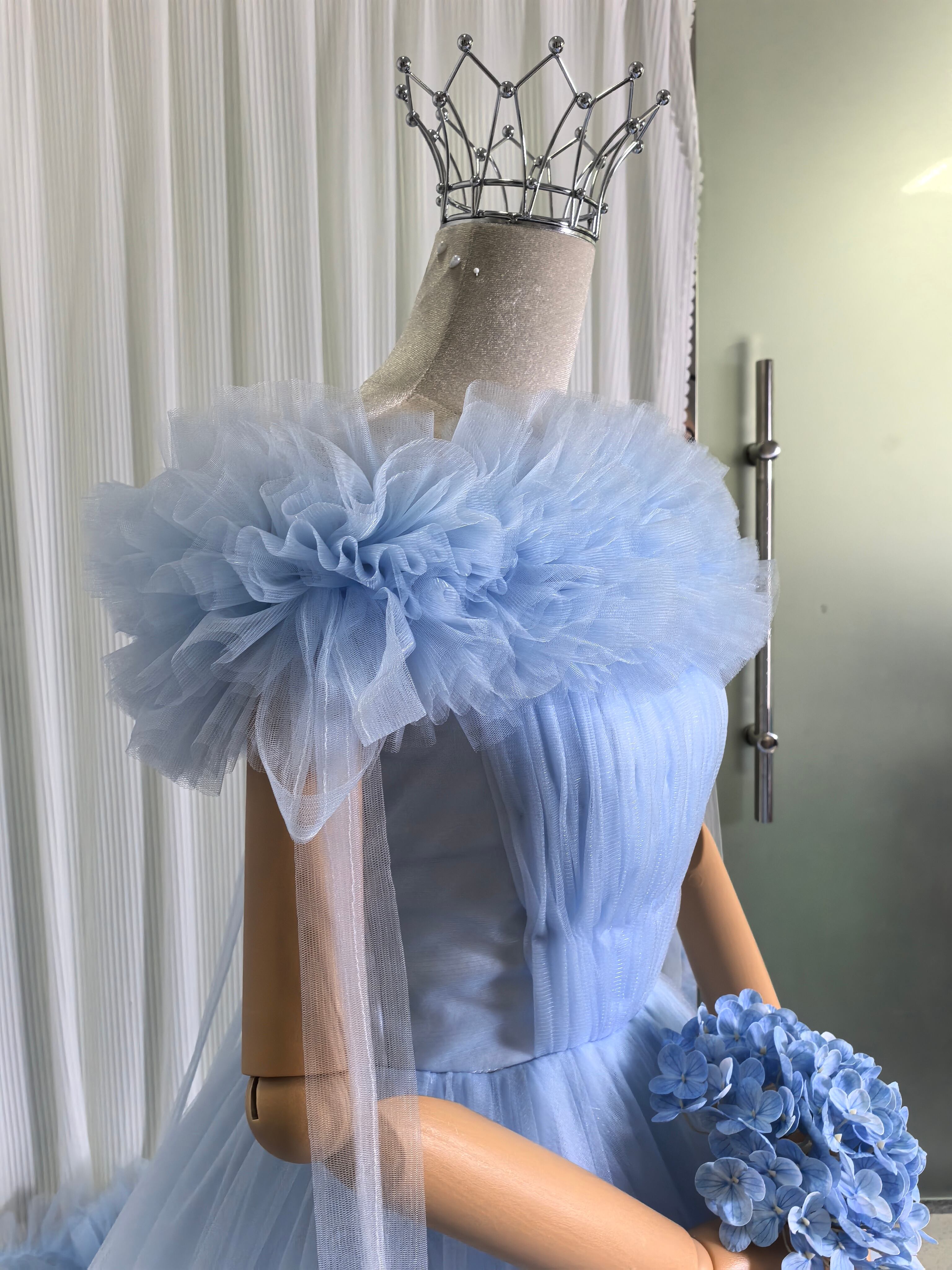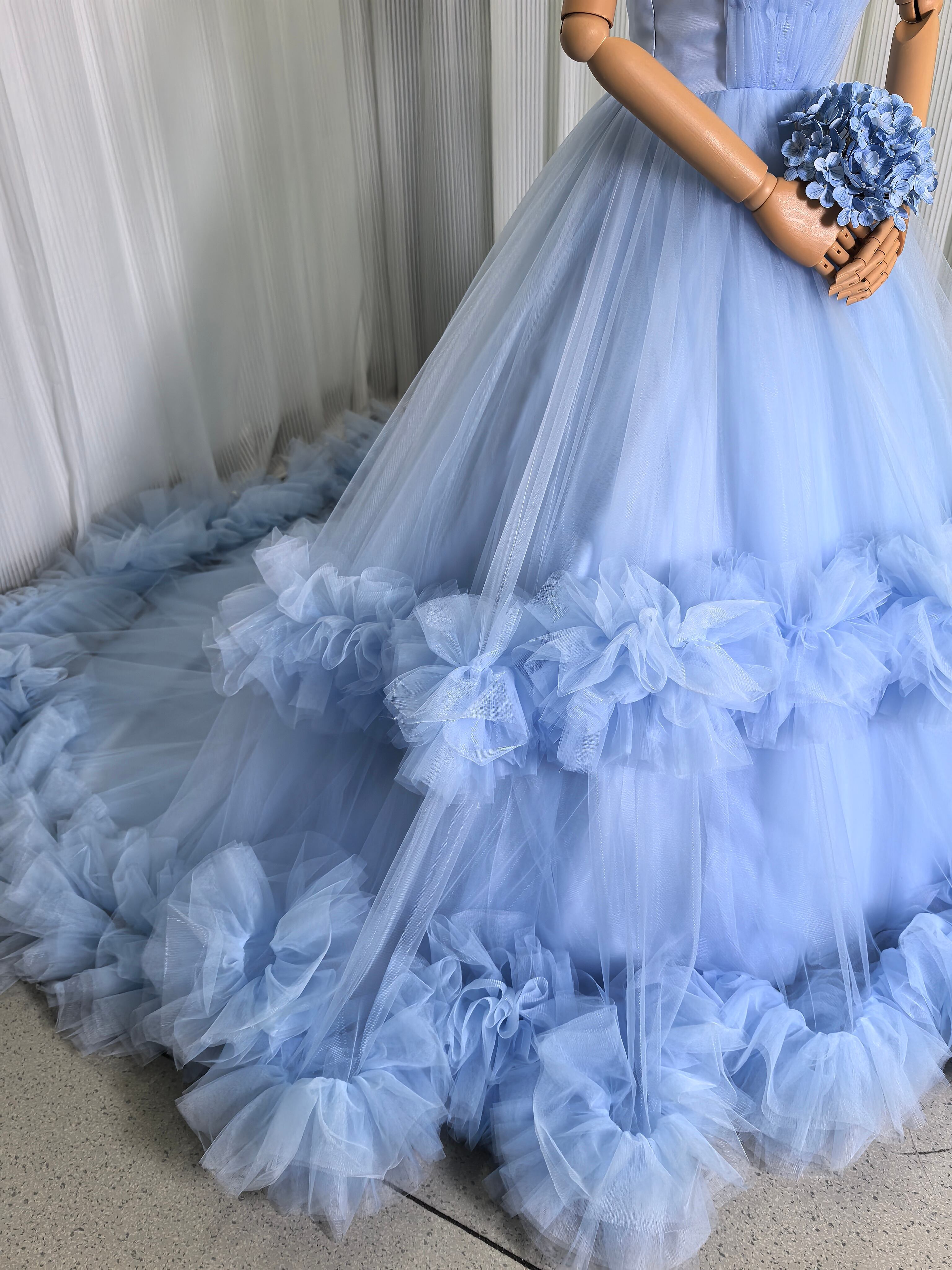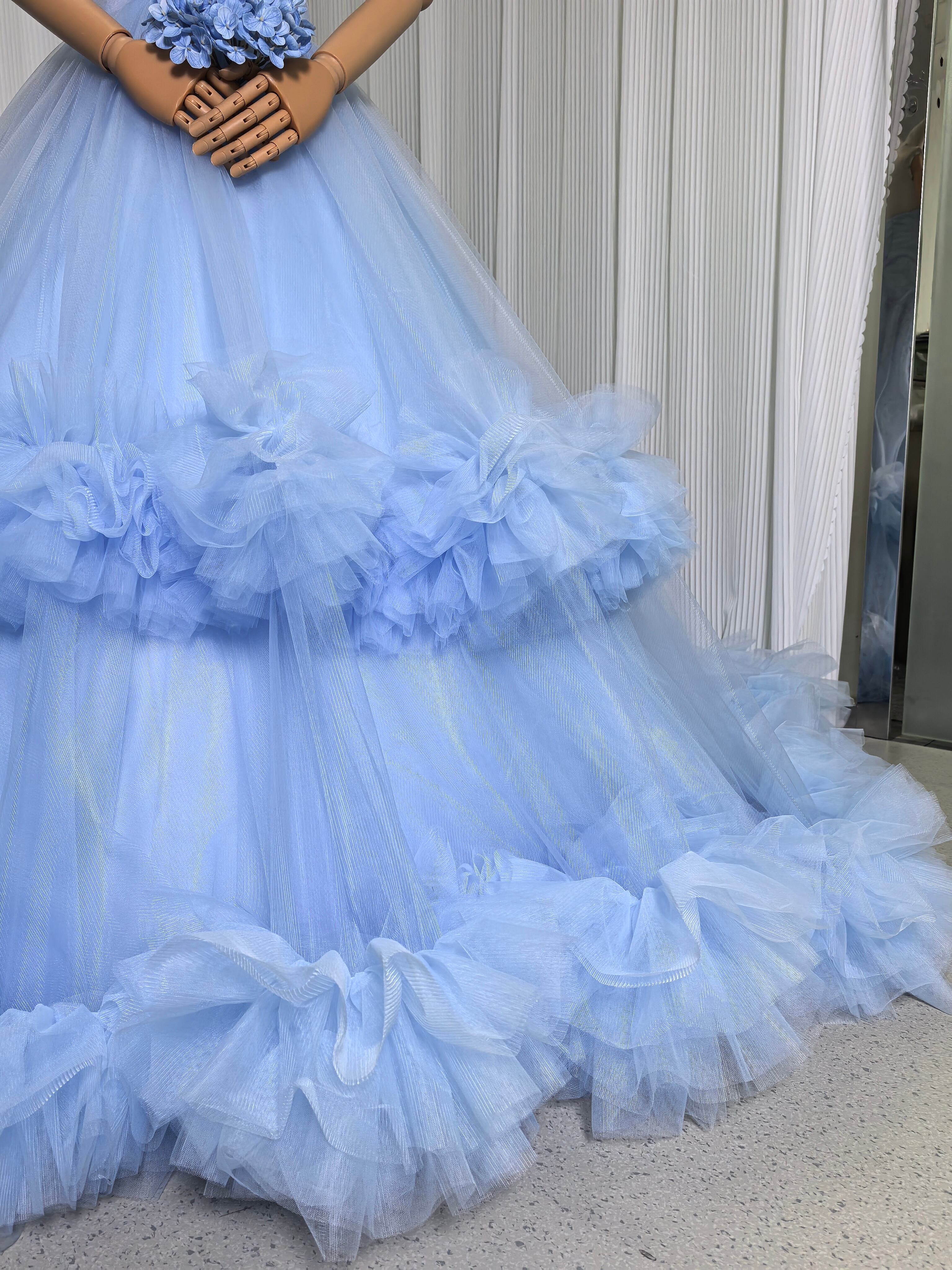 上品!カラードレス オフショルダーの2WAYドレス柔らかく重ねたチュールスカート ロングトレーン パーティードレス お色直し