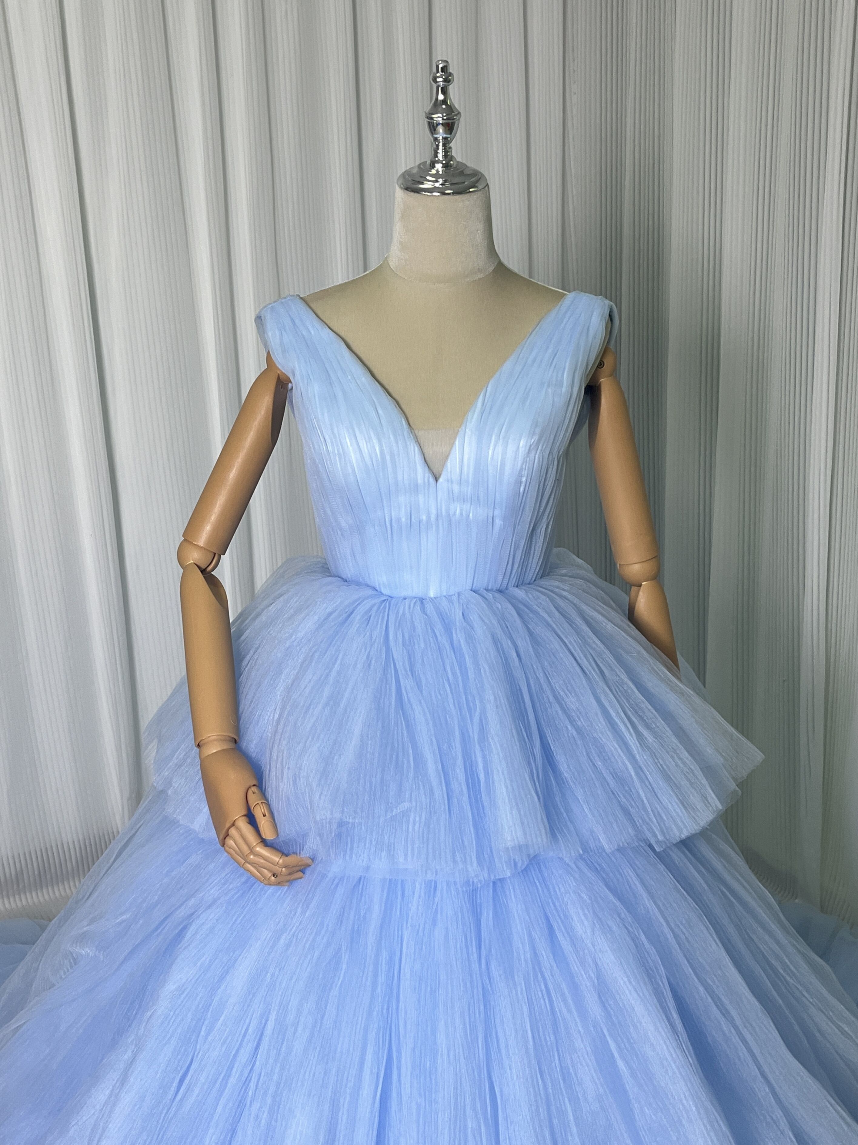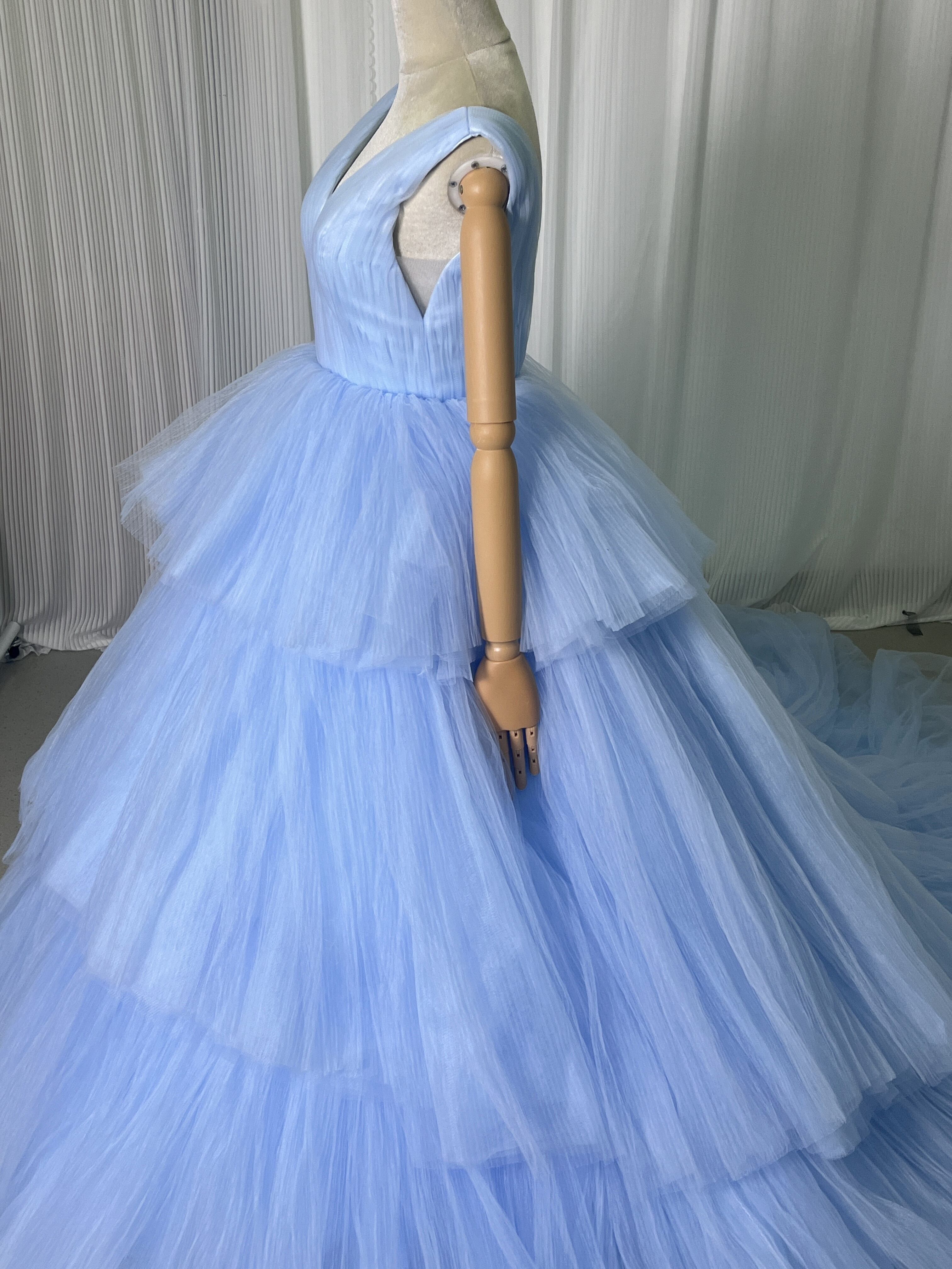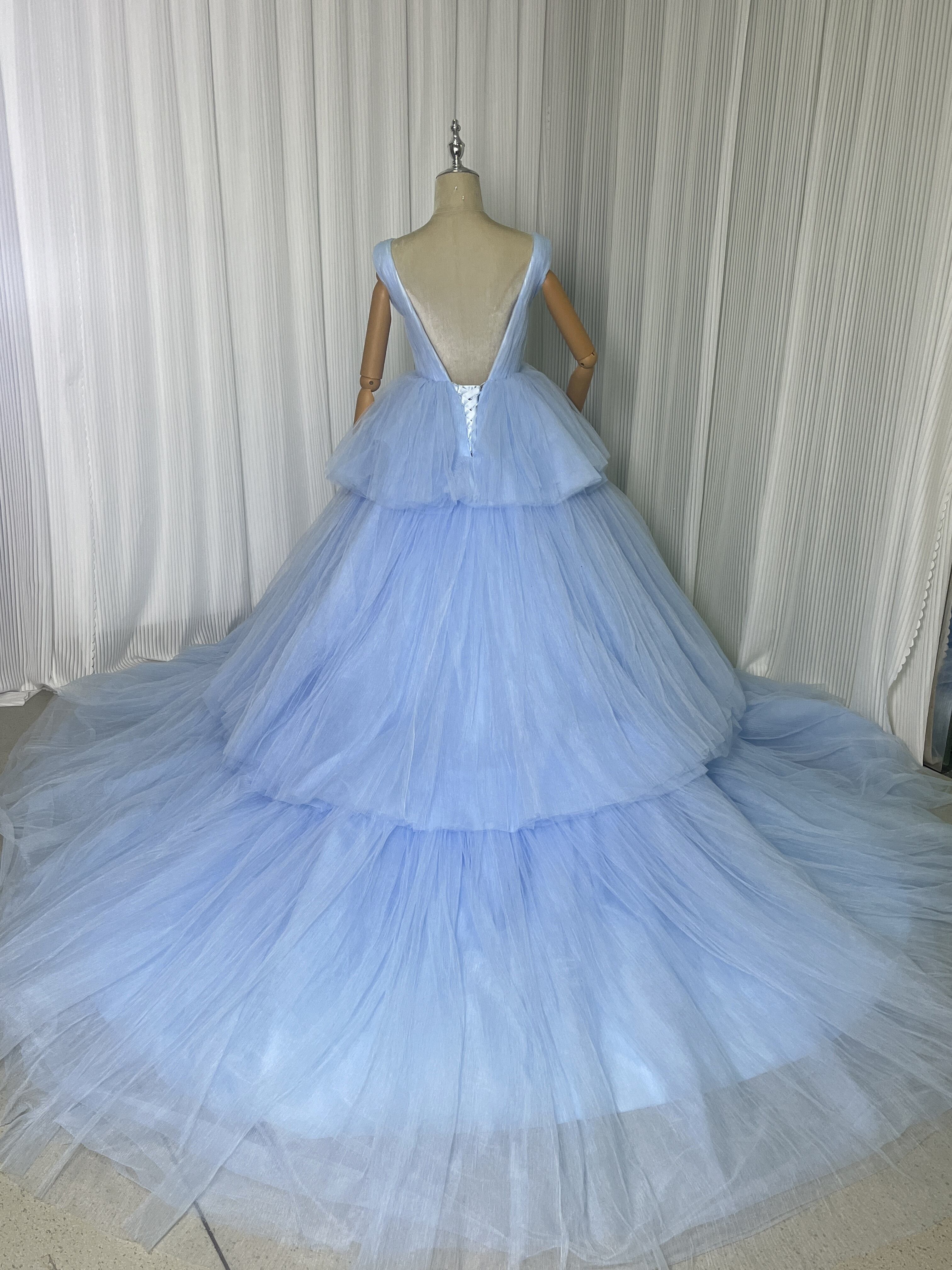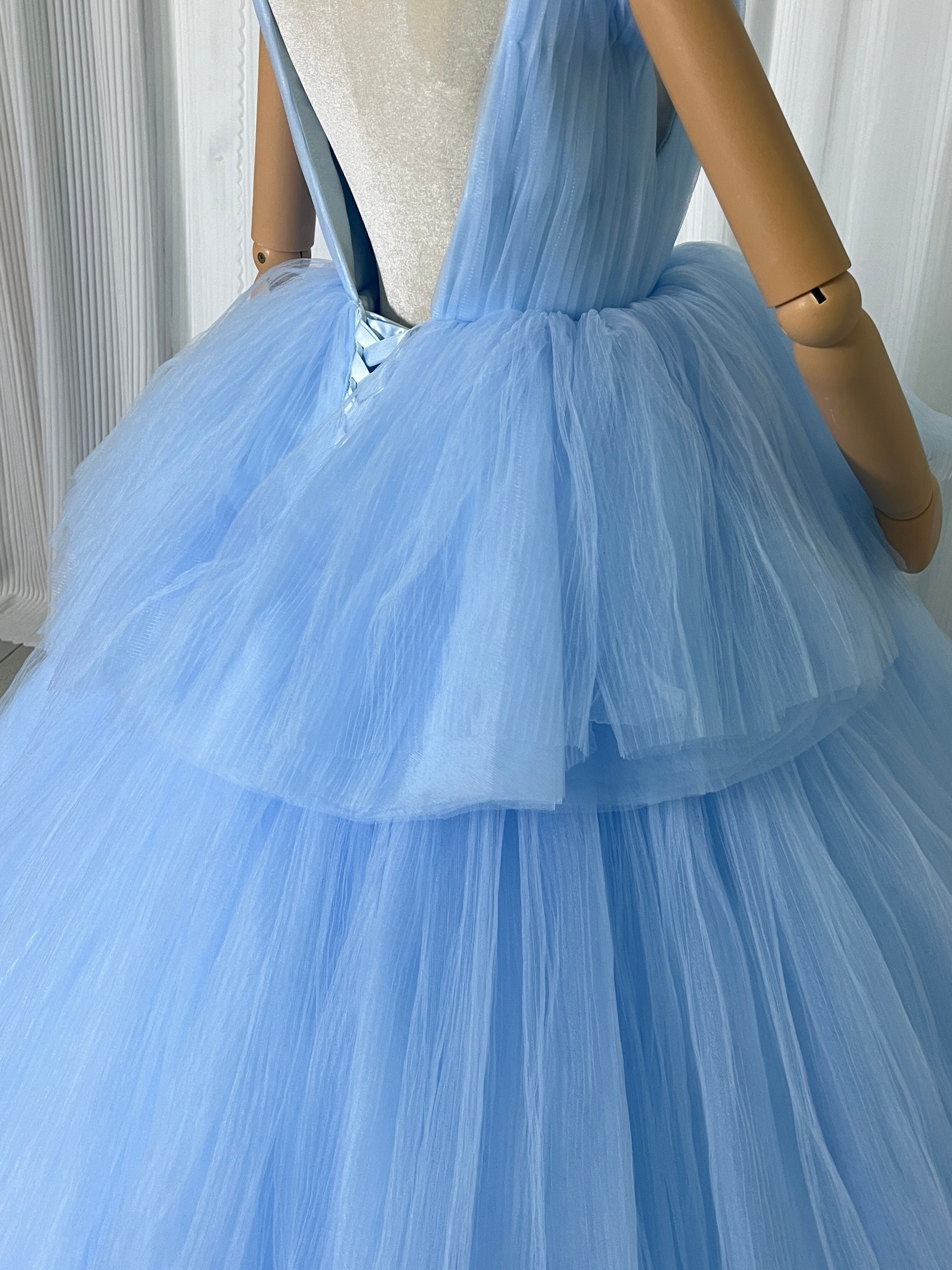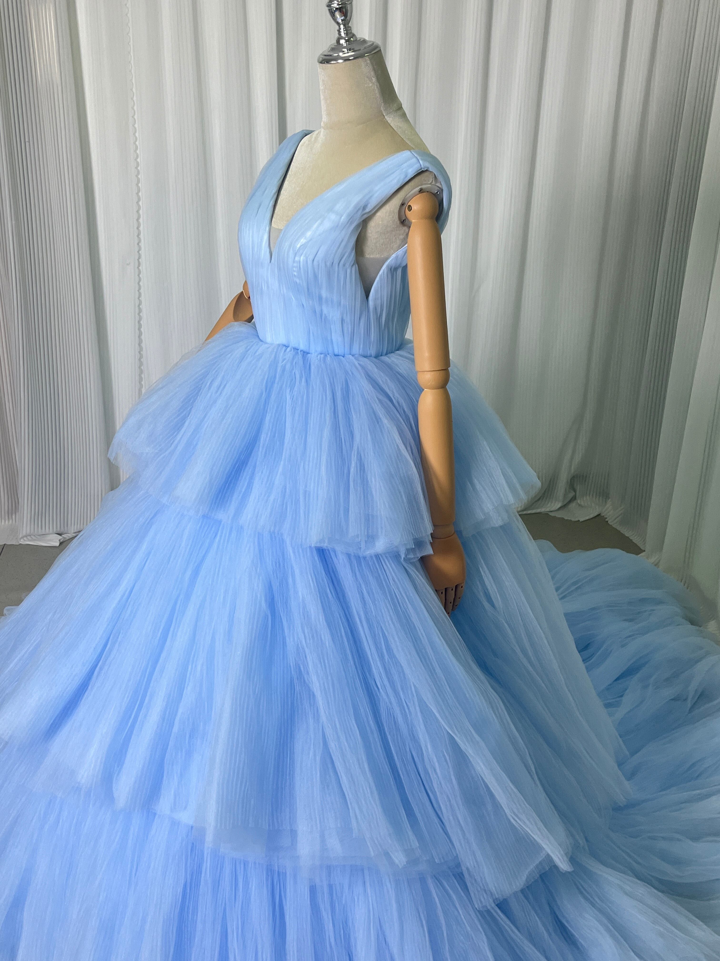 上品!青 Vネック カラードレス ス柔らかく重ねたチュールスカート ロングトレーン パーティードレス お色直し
