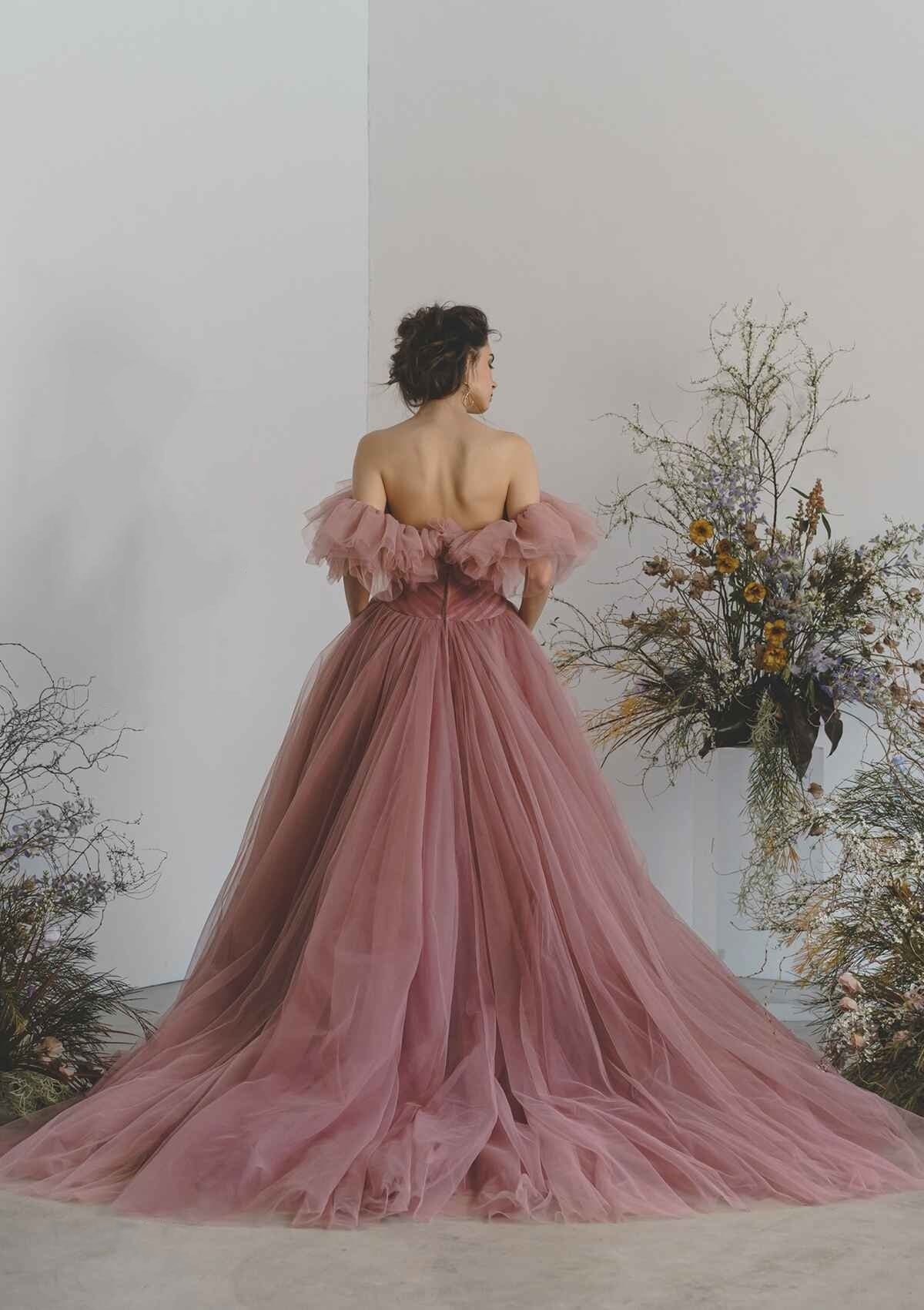 高品質!オーダーメイド!カラードレス くすみピンク あずき色 パーティードレス オフショルダー ソフトチュール Aライン エレガント コンサート ウェディング 花嫁/挙式/前撮り/結婚式 | David1021k Dress(ダヴィドレス)
