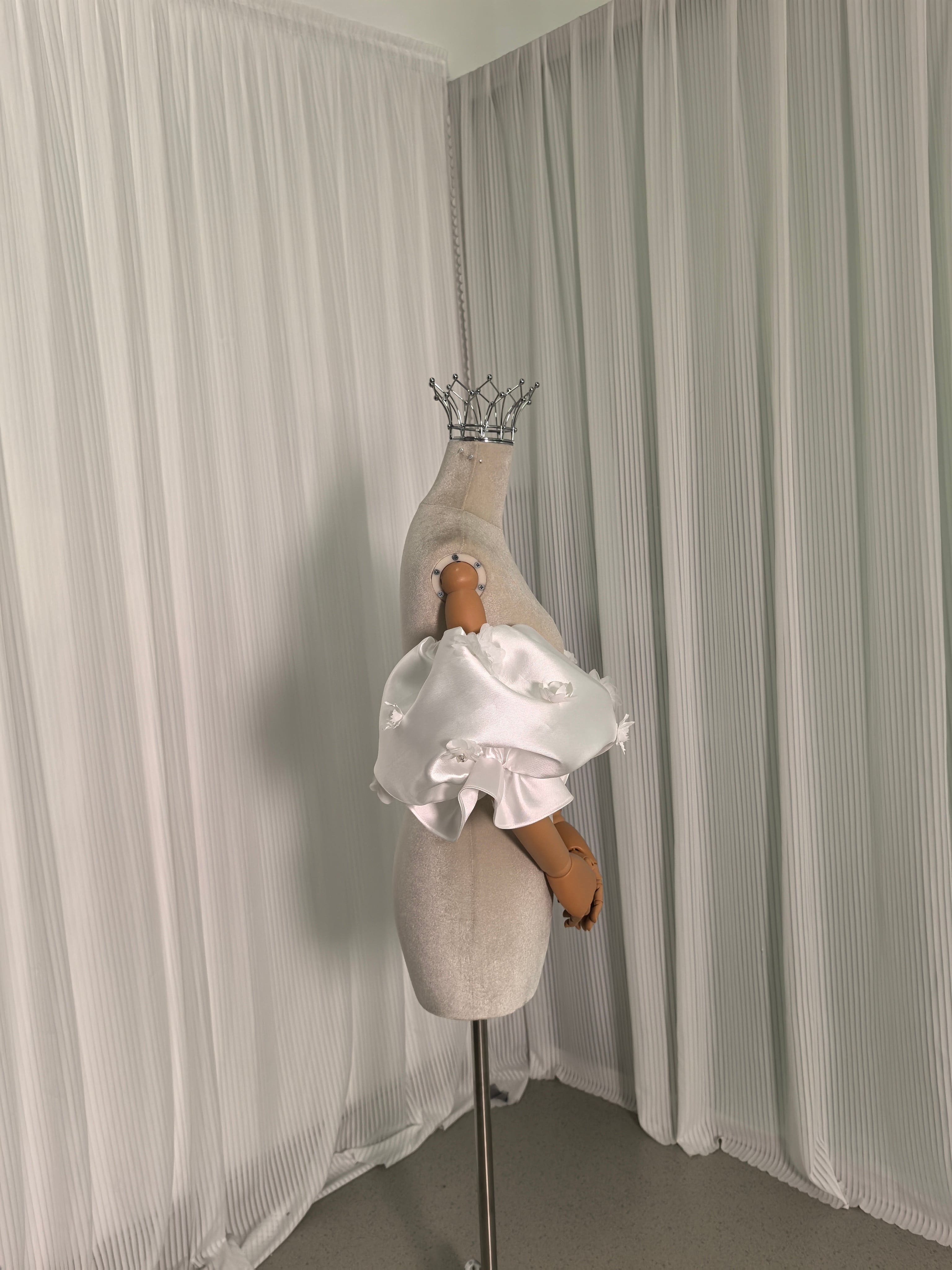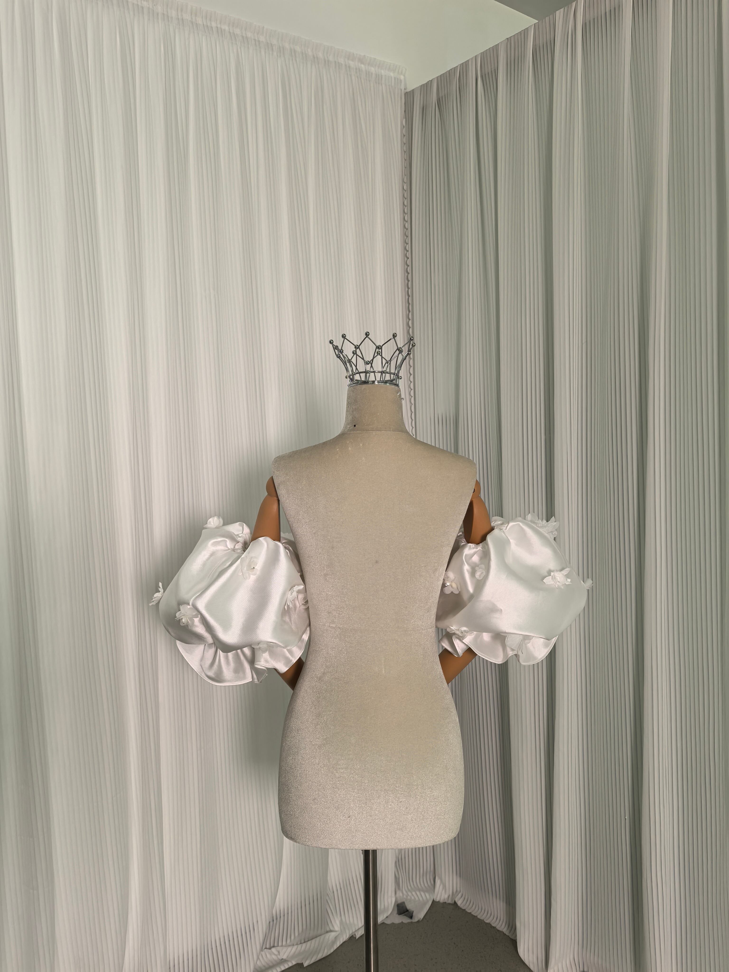 高級サテン ホワイト花モチーフ 取り外し袖 ショルダーの付け袖 パフスリーブ オーダー可能 二の腕を隠せるお袖