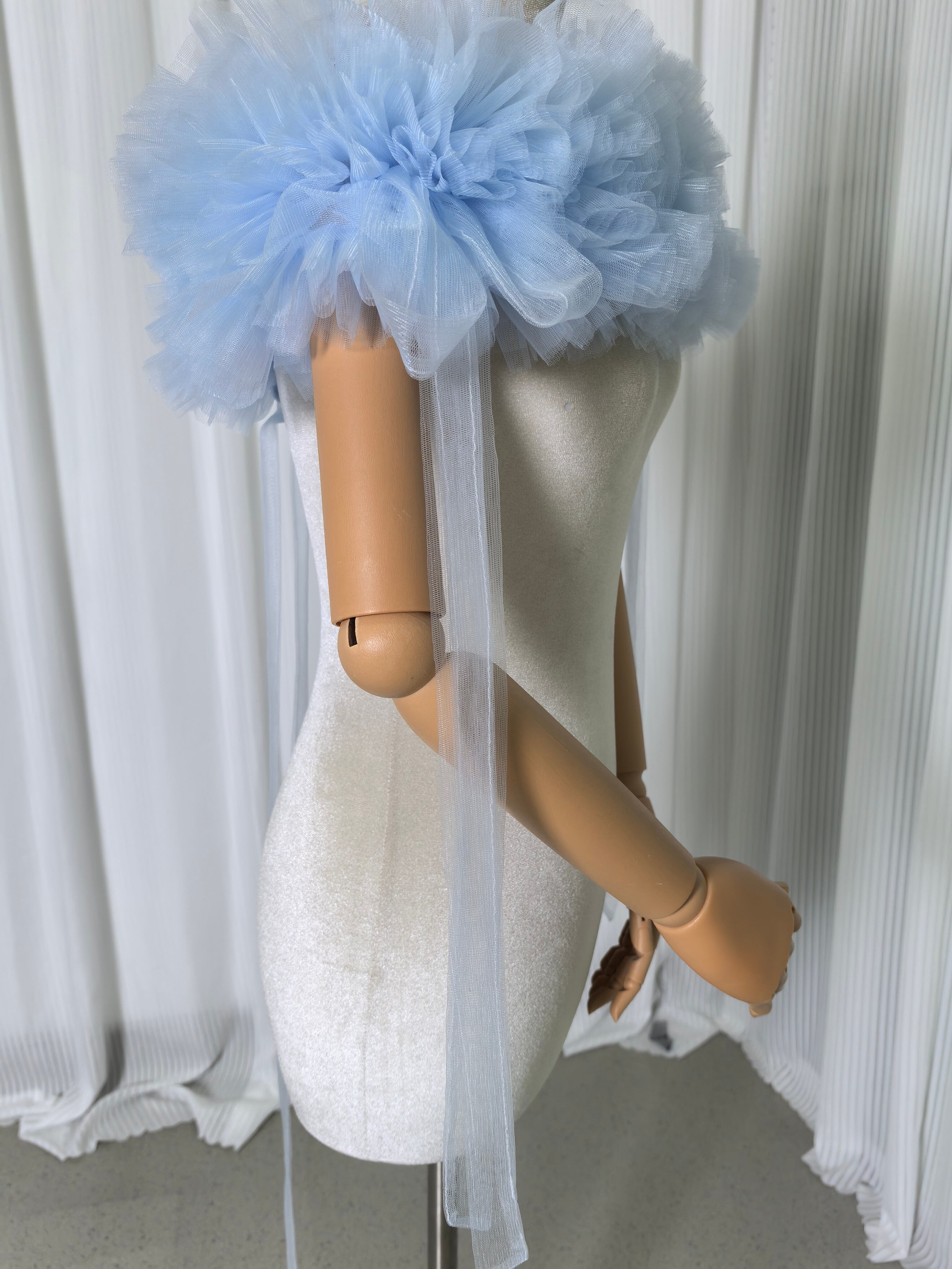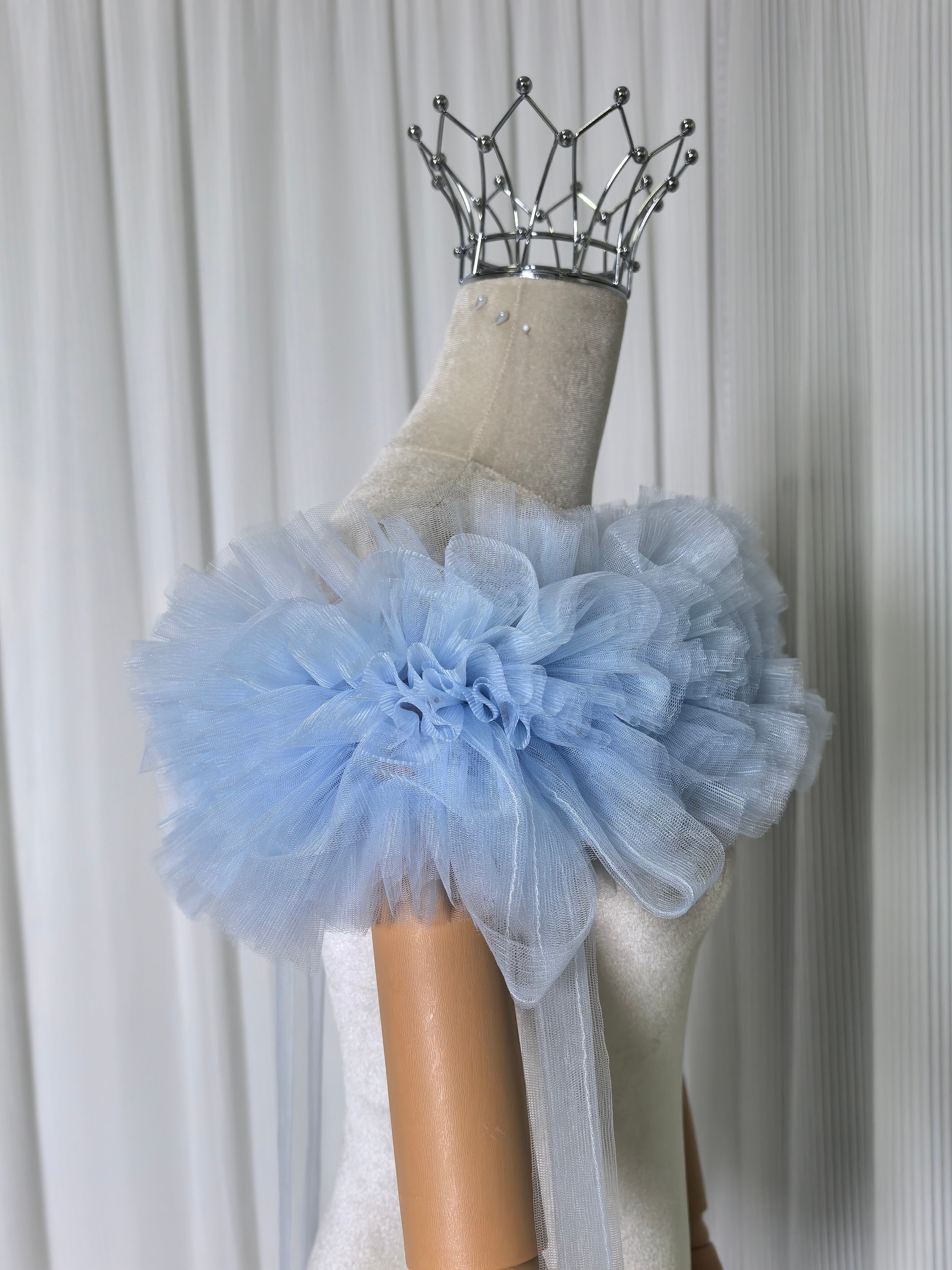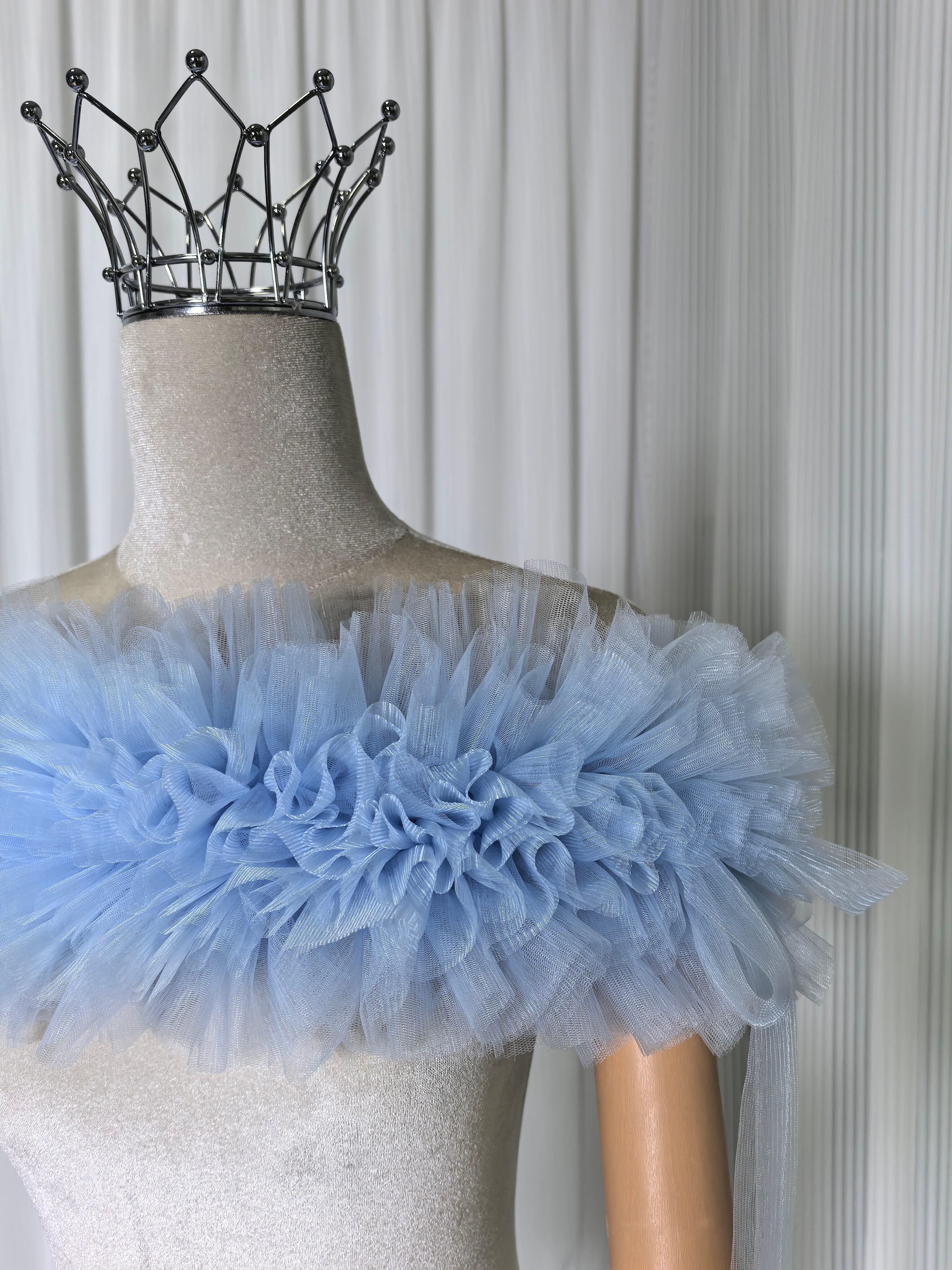高品質!青 ポンチョ ソフトチュール ラッフルフリル 取り外しオフショルダー