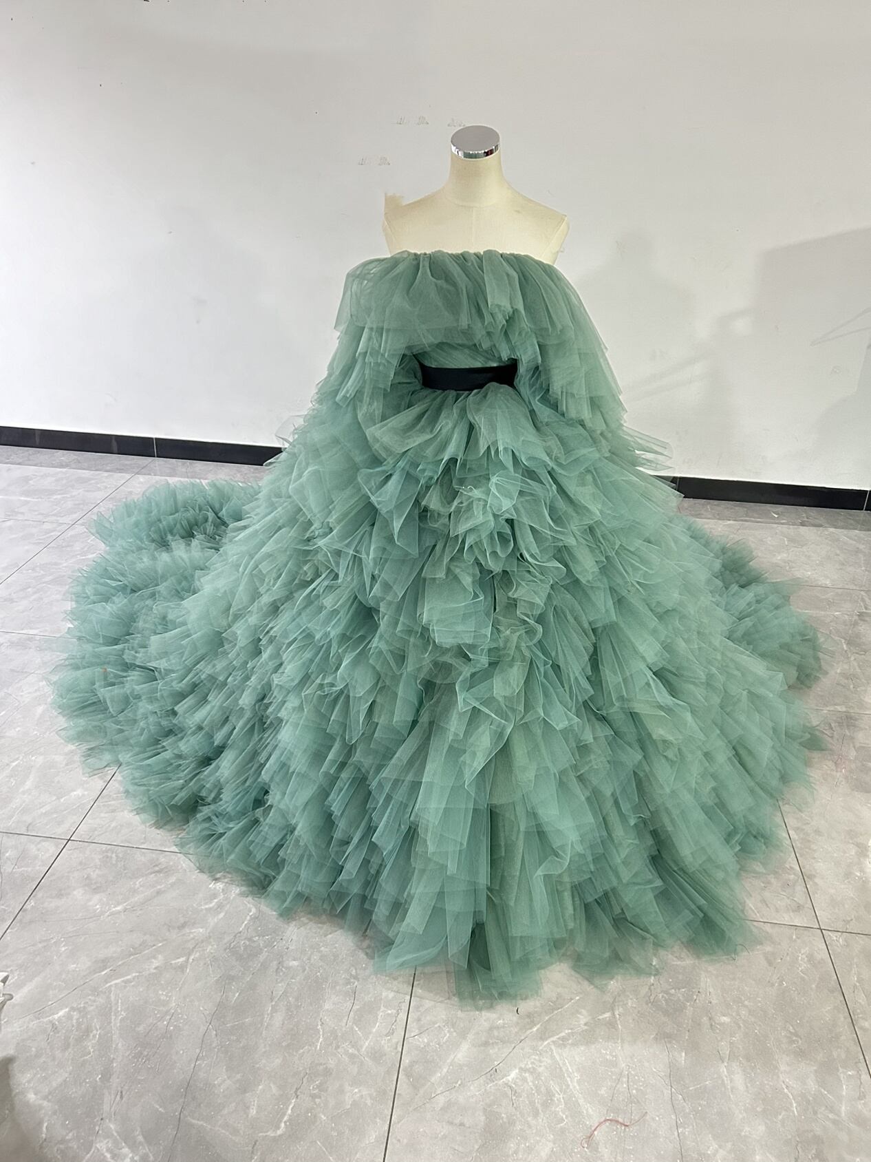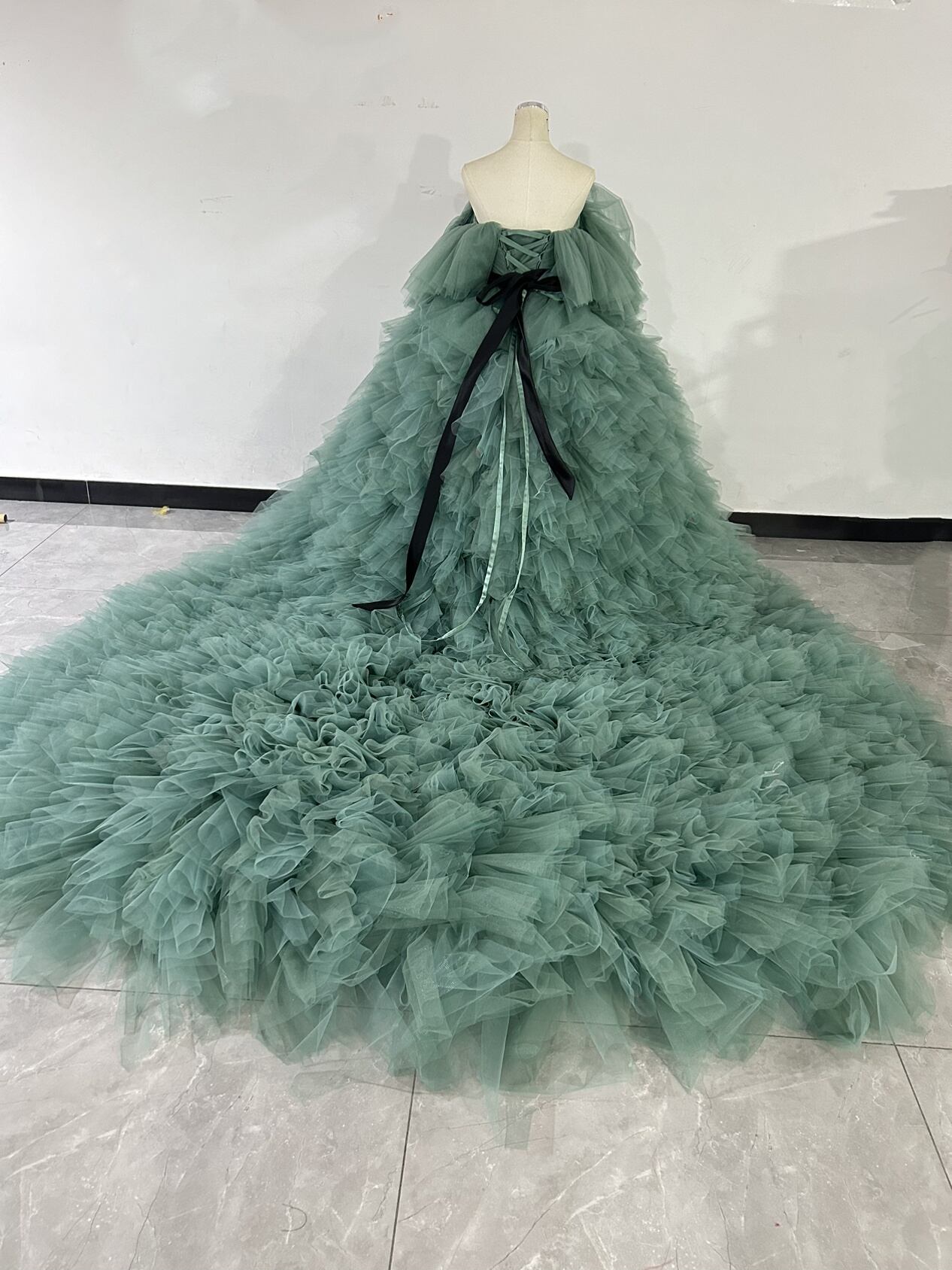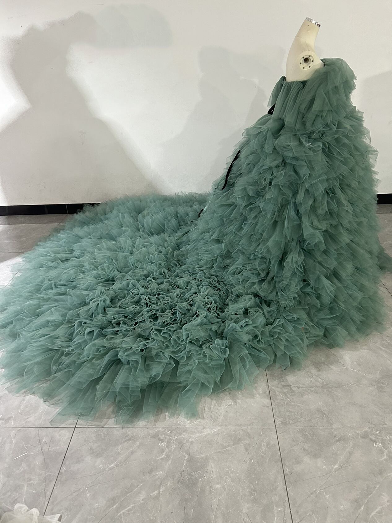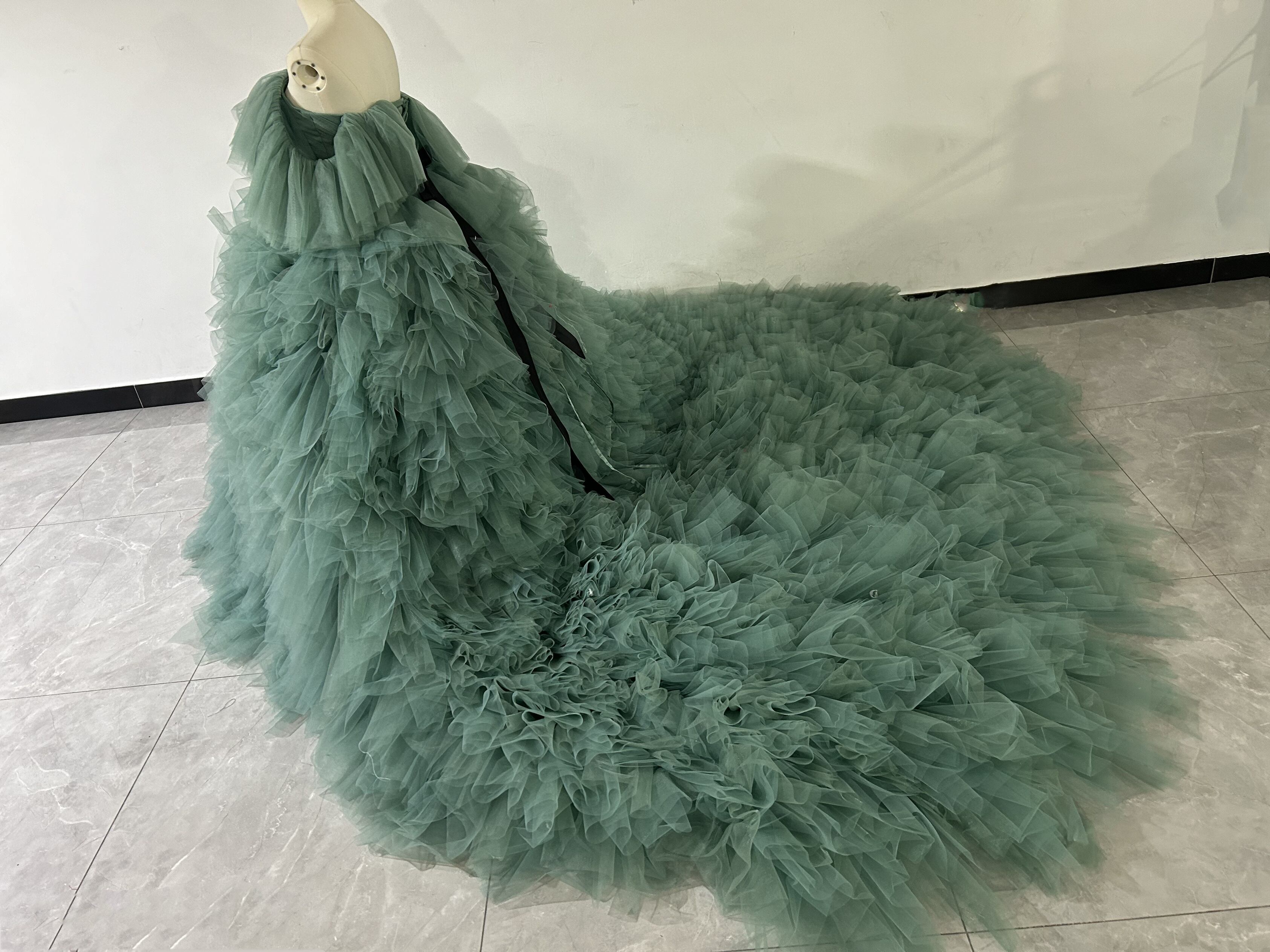 豪華!オフショルダー ミントグリーン カラードレス ソフトチュール もこもこドレス ボリュームたっぷり ロングトレーン 結婚式 花嫁/前撮り 披露宴