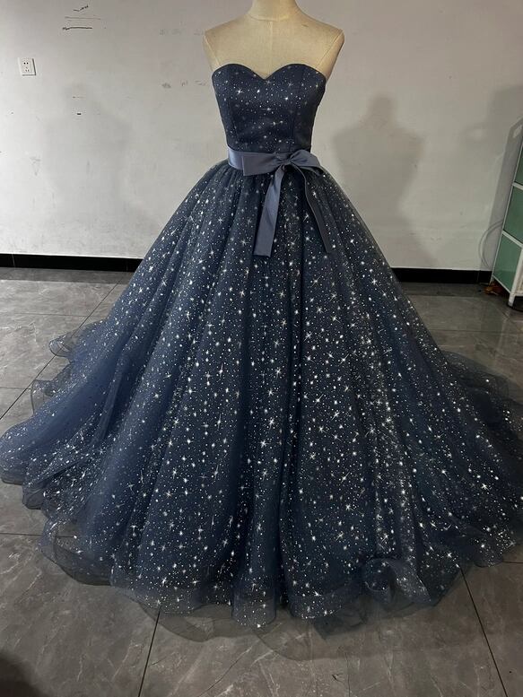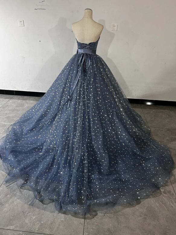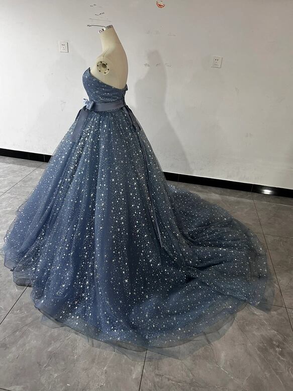 実例写真 Vネック 青 カラードレス キラキラチュール ソフトチュール ロングトレーン挙式/前撮り/花嫁/結婚式/披露宴/