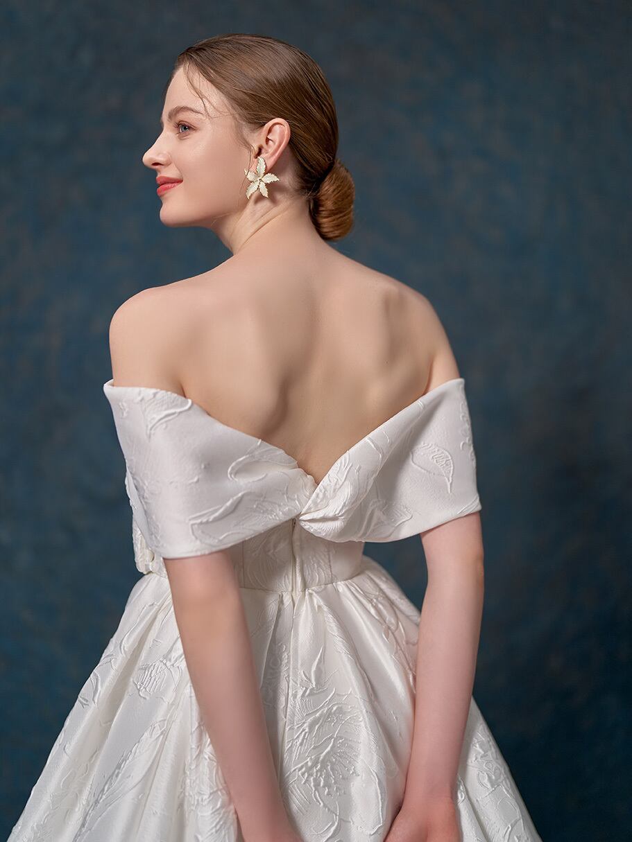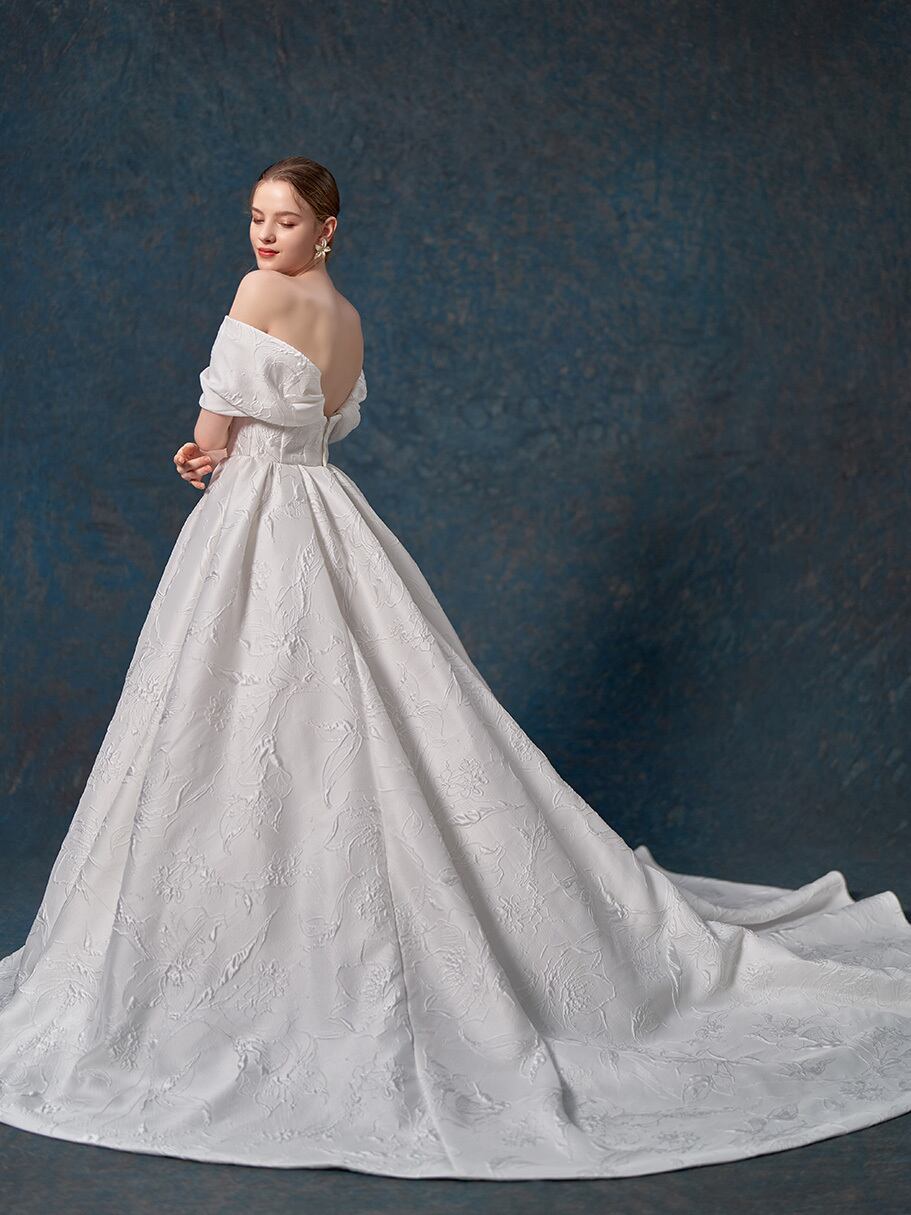 ゴージャス!美品!ウエディングドレス オフショルダー パーティードレス ジャカード生地 Aライン 花柄 エレガント 花嫁/海外挙式/前撮り/結婚式/披露宴