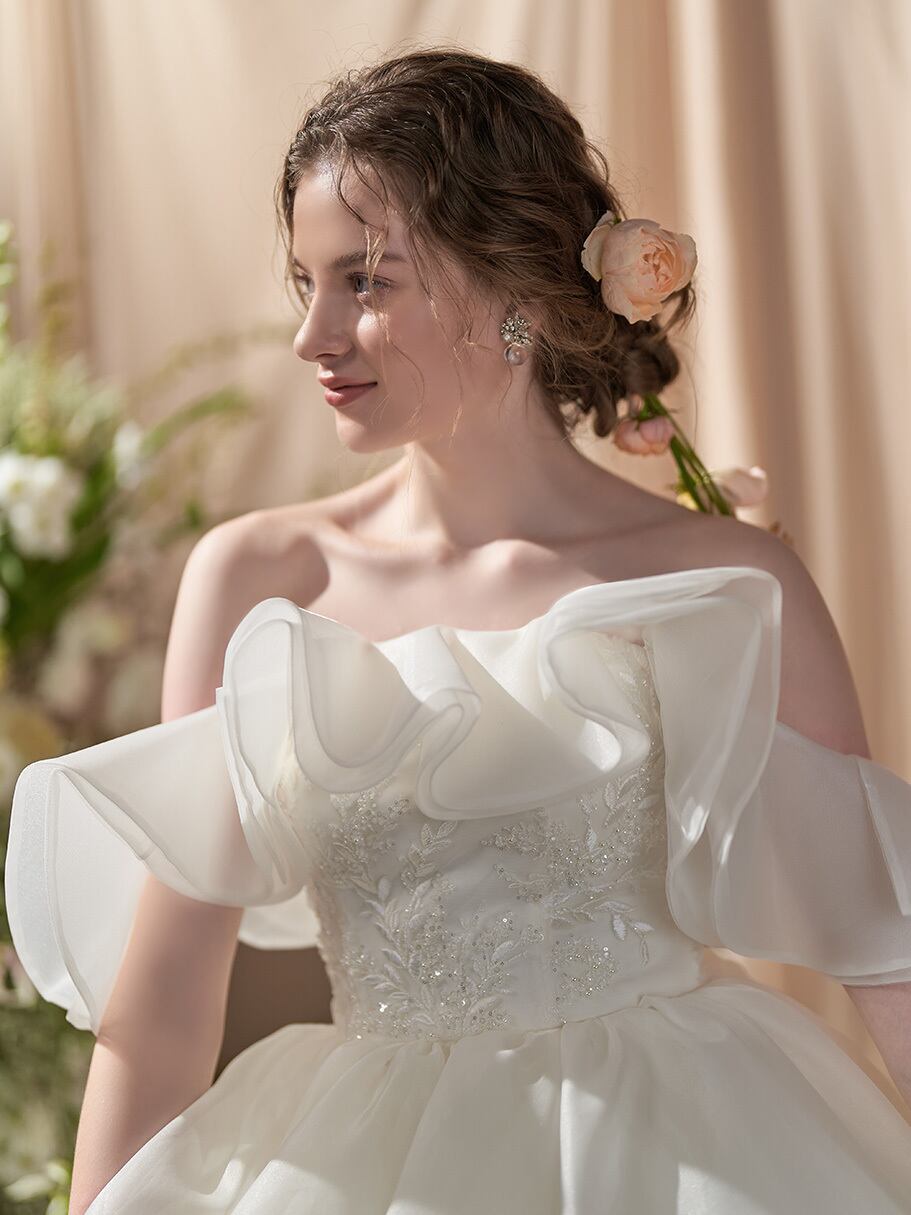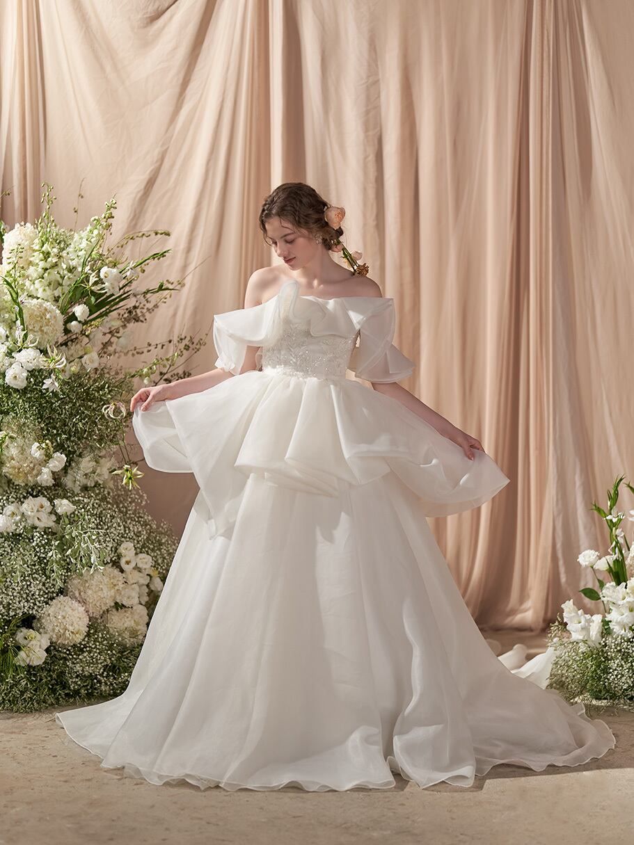 ゴージャス!美品!ウエディングドレス オフショルダー シルクドレス キラキラ刺繡 Aラインドレス フリル エレガント 花嫁/海外挙式/前撮り/結婚式/披露宴 | David1021k Dress(ダヴィドレス)