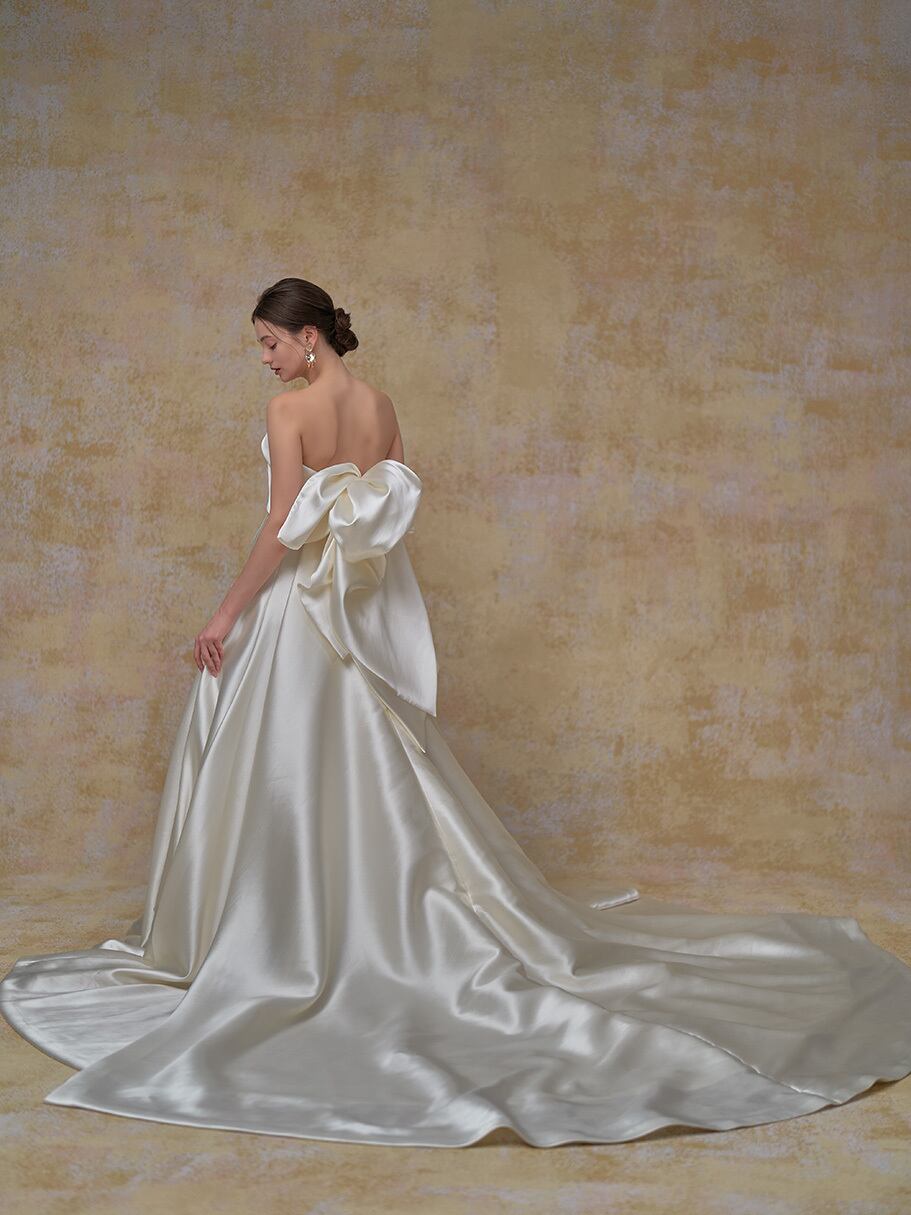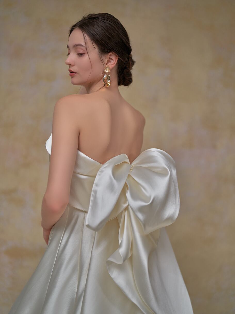 ゴージャス!美品!ウエディングドレス バックリボン 光沢サテン エンパイアライン 取り外しトレーン Aラインドレス エレガント 花嫁/海外挙式/前撮り/結婚式/披露宴