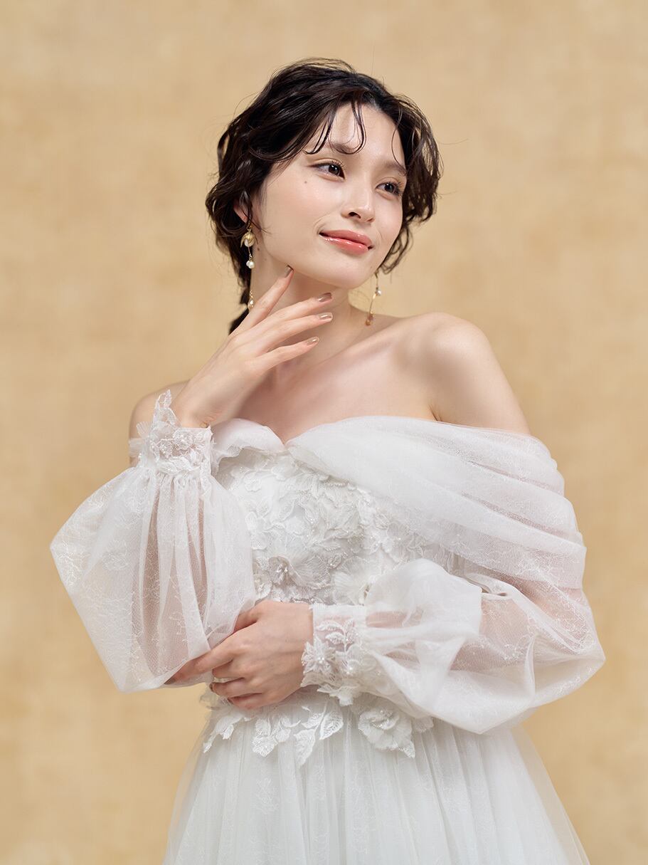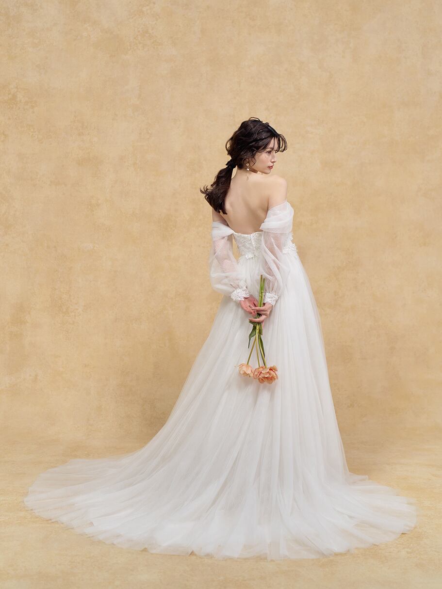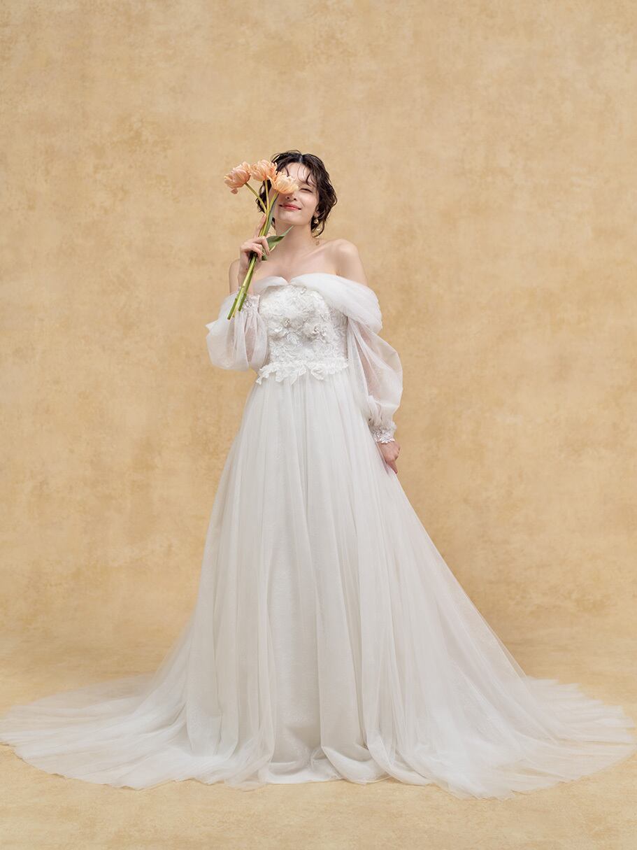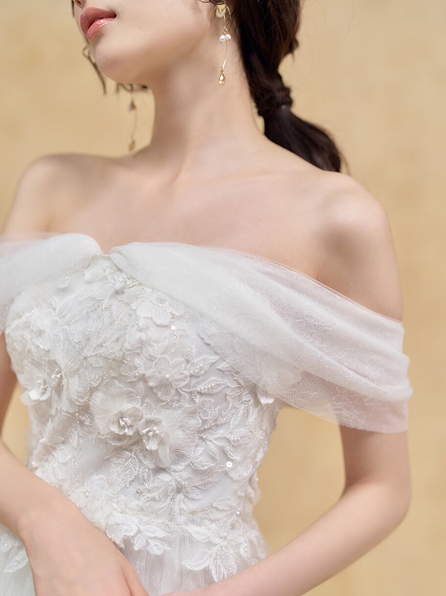 美品!3WAYウエディングドレス オフショルダー【ドレスオーダーメイド】付け袖 ストレートライン 繊細レースドレス 3D立体レース刺繍 チュールドレス エレガント ロングトレーン 花嫁/海外挙式/前撮り/結婚式/披露宴 | David1021k Dress(ダヴィドレス)