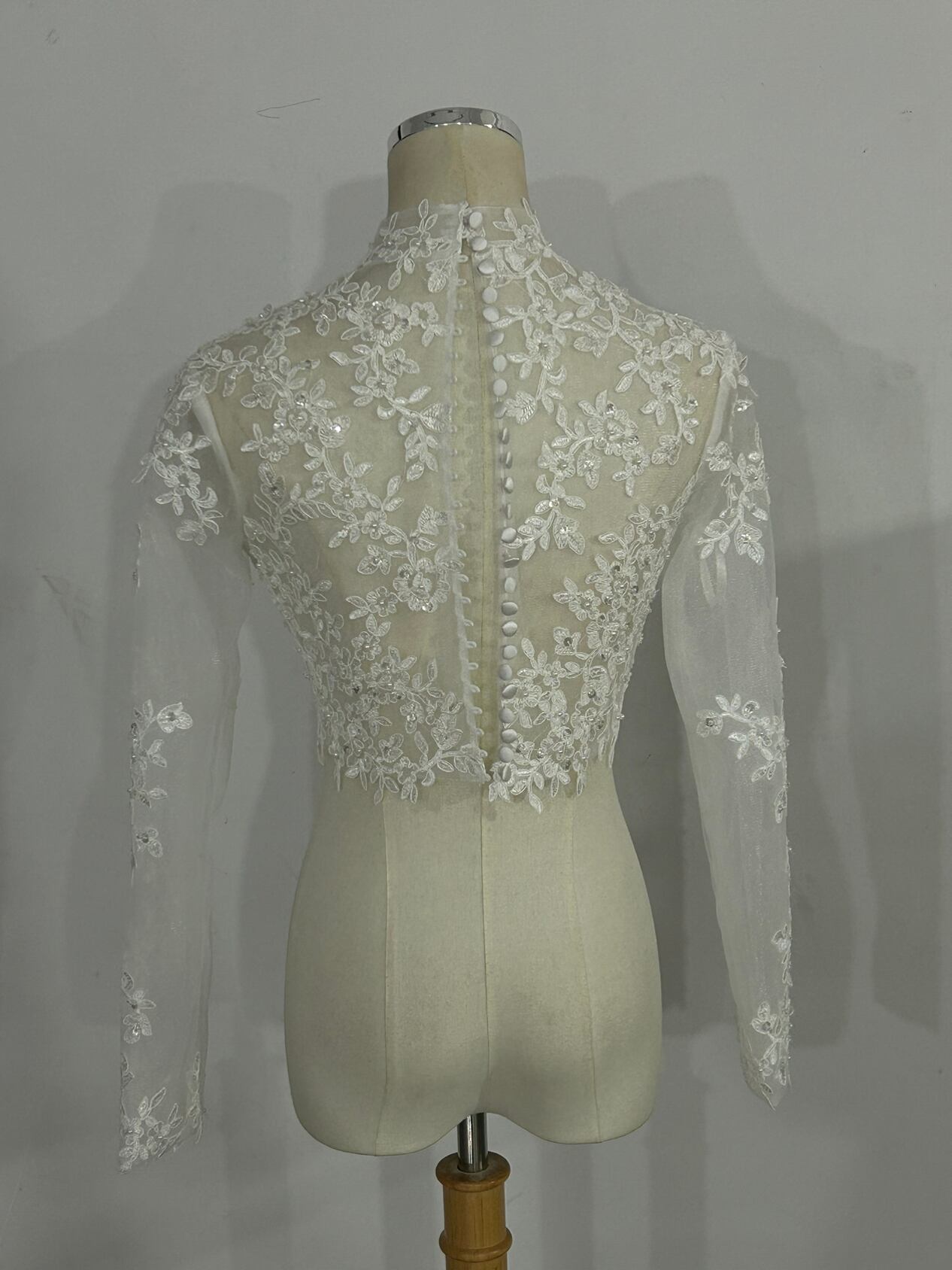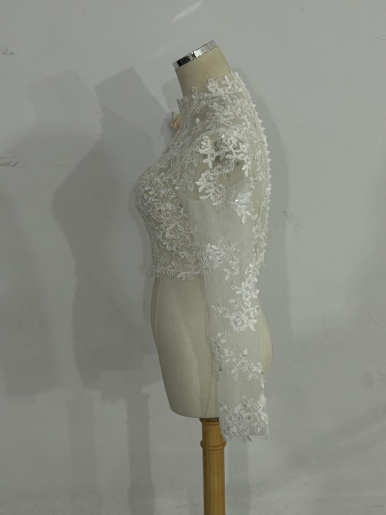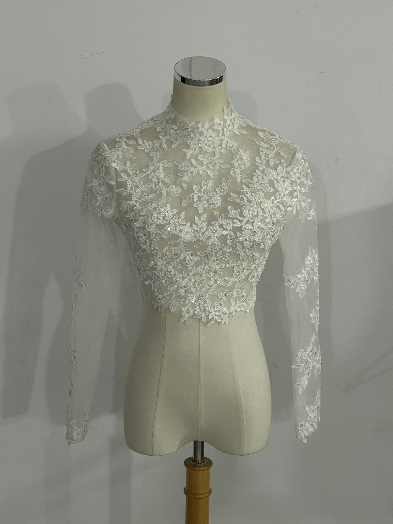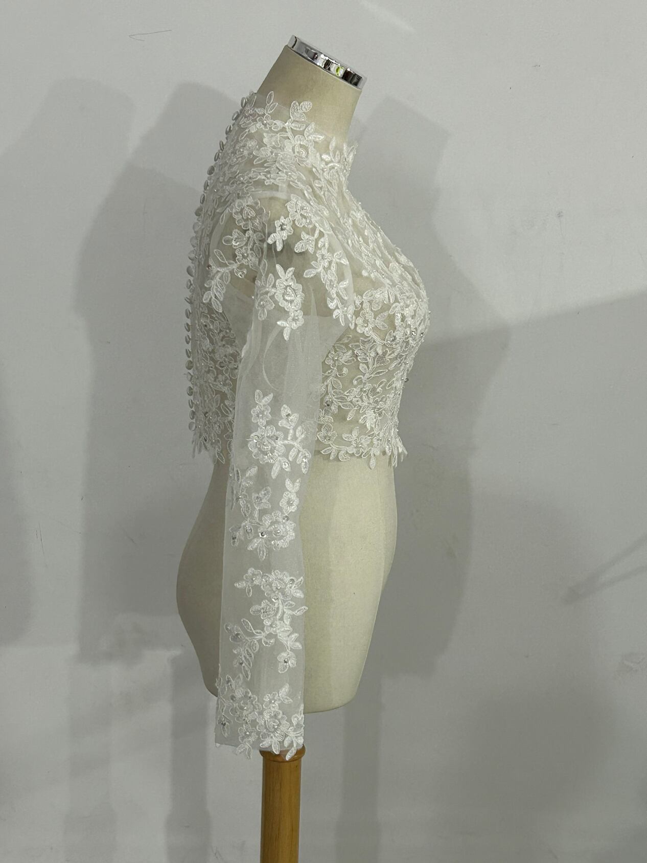 ハイネックボレロ トップス  ブラウス 上品透け袖 3D立体レース刺繍 くるみボタン 長袖