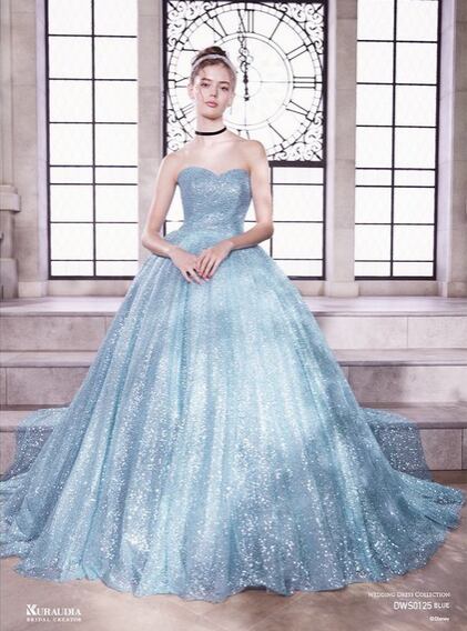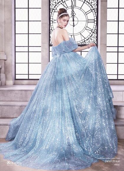 美品!【ドレスオーダーメイド】カラードレス ブルー/青 パフスリーブ キラキラグリッター プリンセスライン パーティードレス コンサート ダンスドレス 花嫁/前撮り | David1021k Dress(ダヴィドレス)