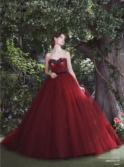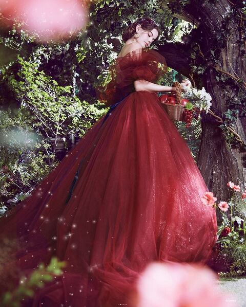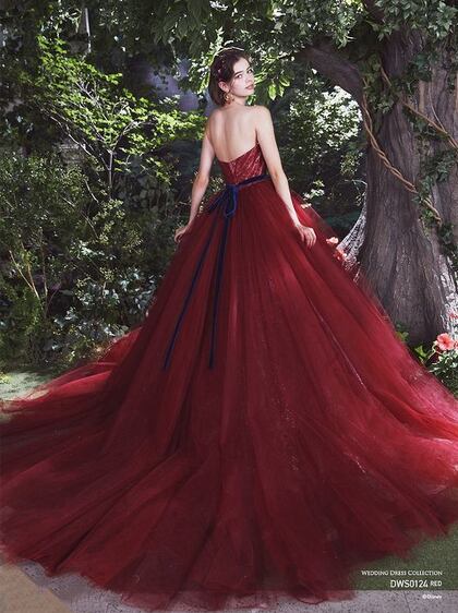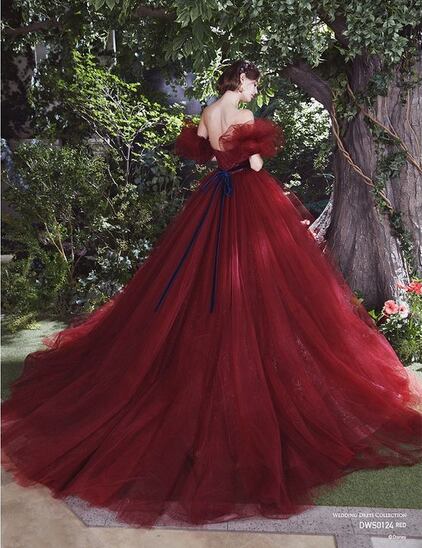 美品!【ドレスオーダーメイド】カラードレス ワイレッド ふわふわ付け袖 キラキラグリッターチュール プリンセスライン ロングトレーン パーティードレス コンサート 花嫁/前撮り/結婚式/披露宴 | David1021k Dress(ダヴィドレス)