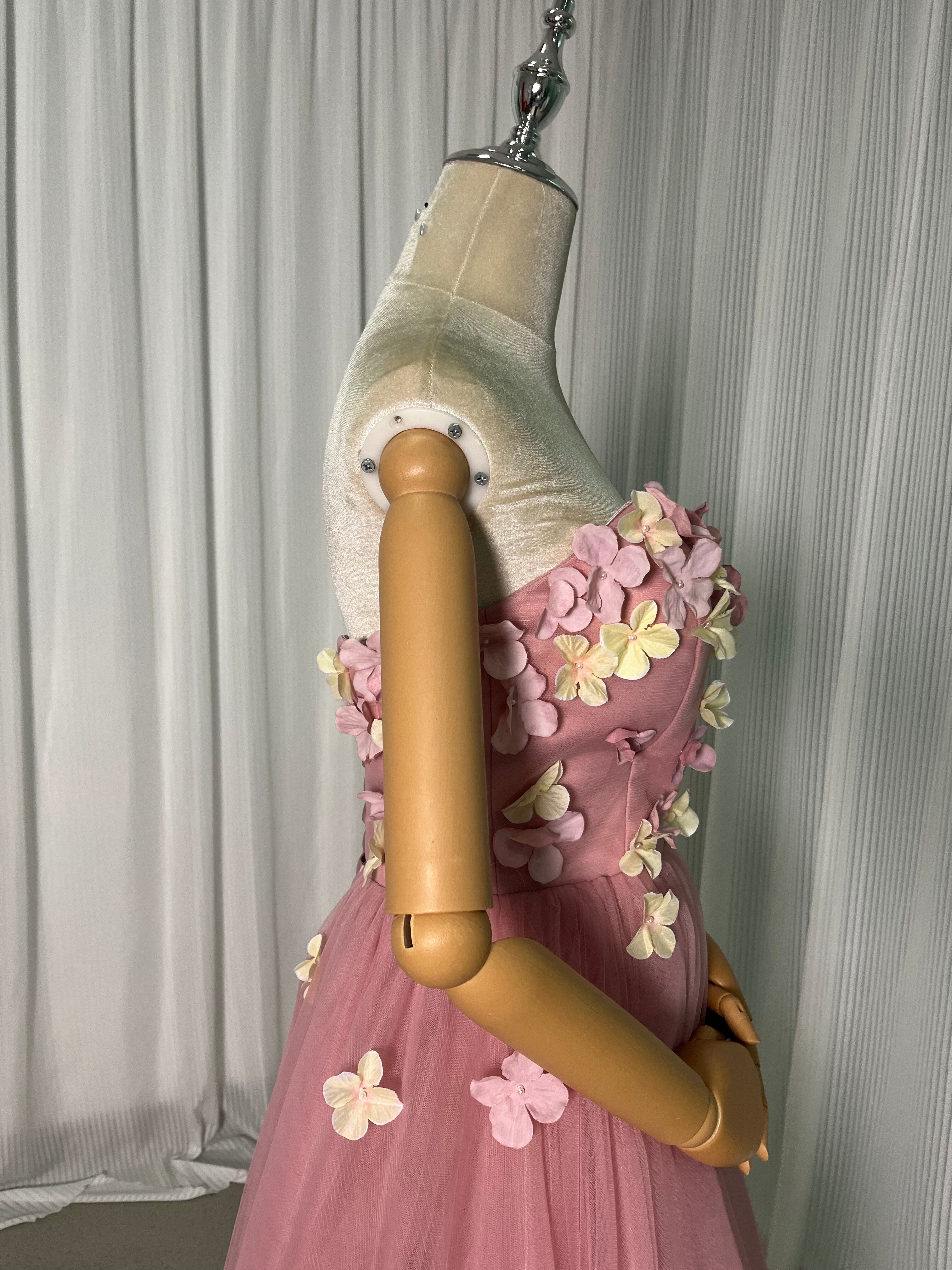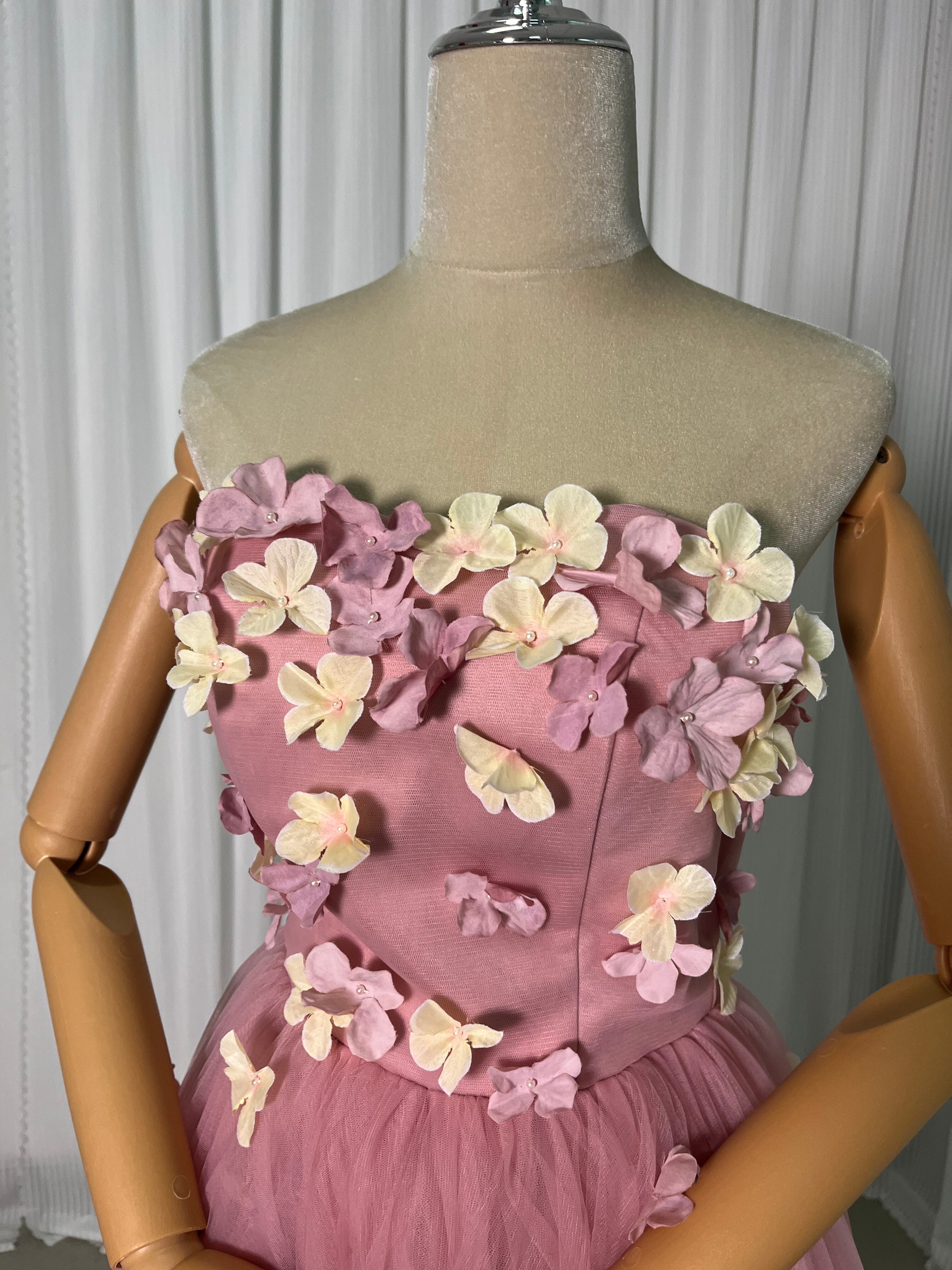 送料無料 ピンク ベアトップ カラードレス 花モチーフ ソフトチュール パーティードレス 花嫁/前撮り/演奏会/音楽