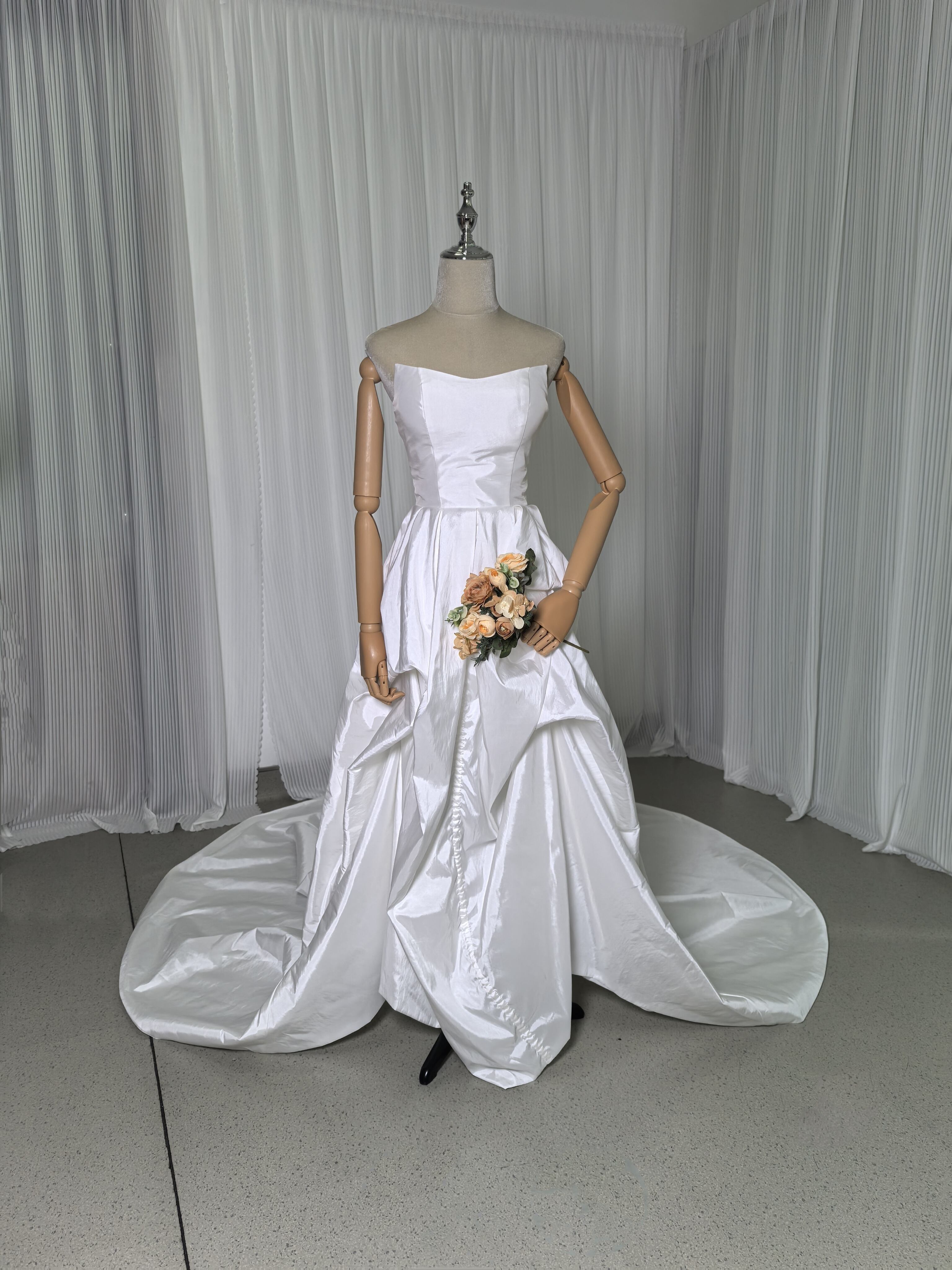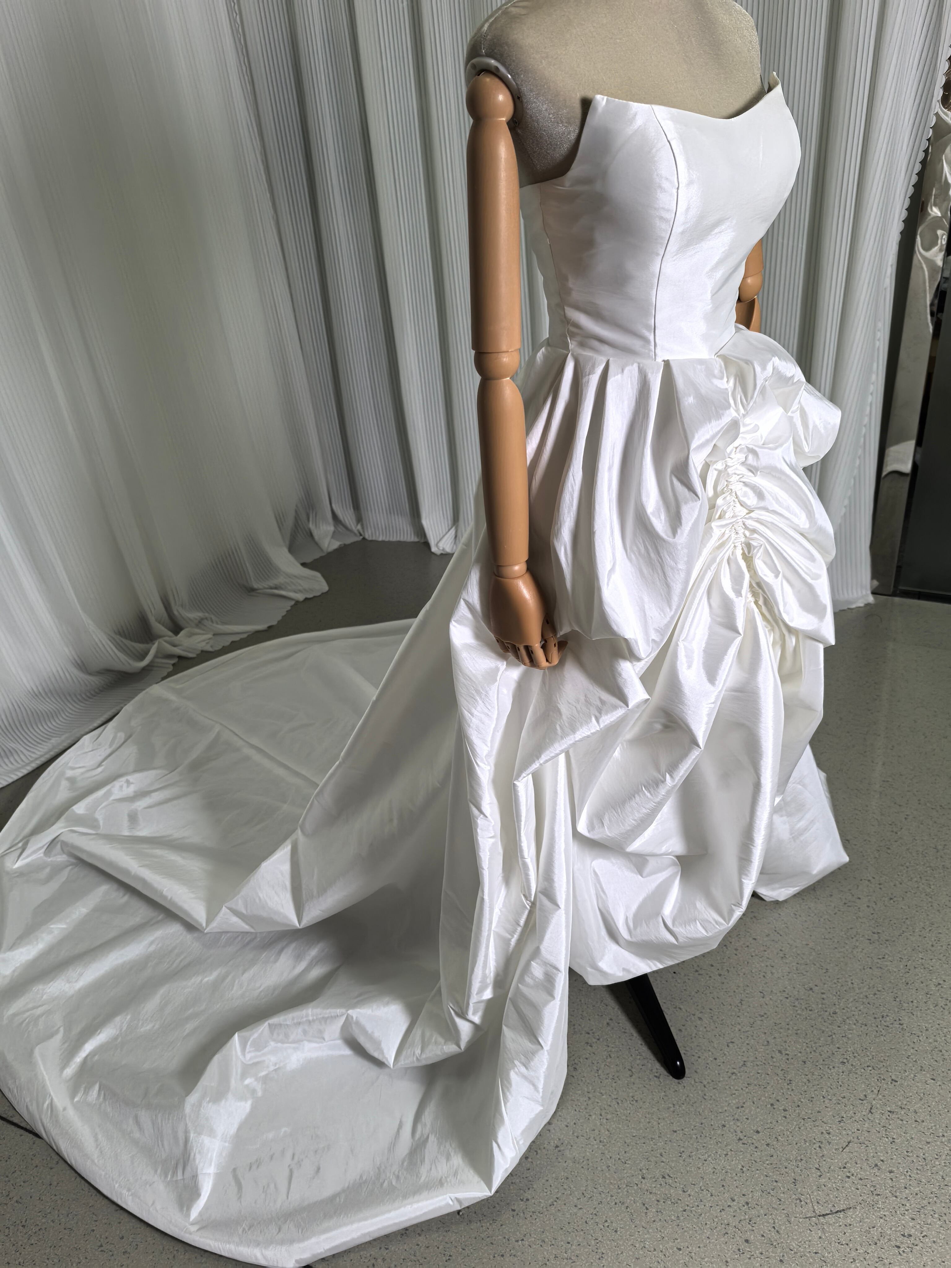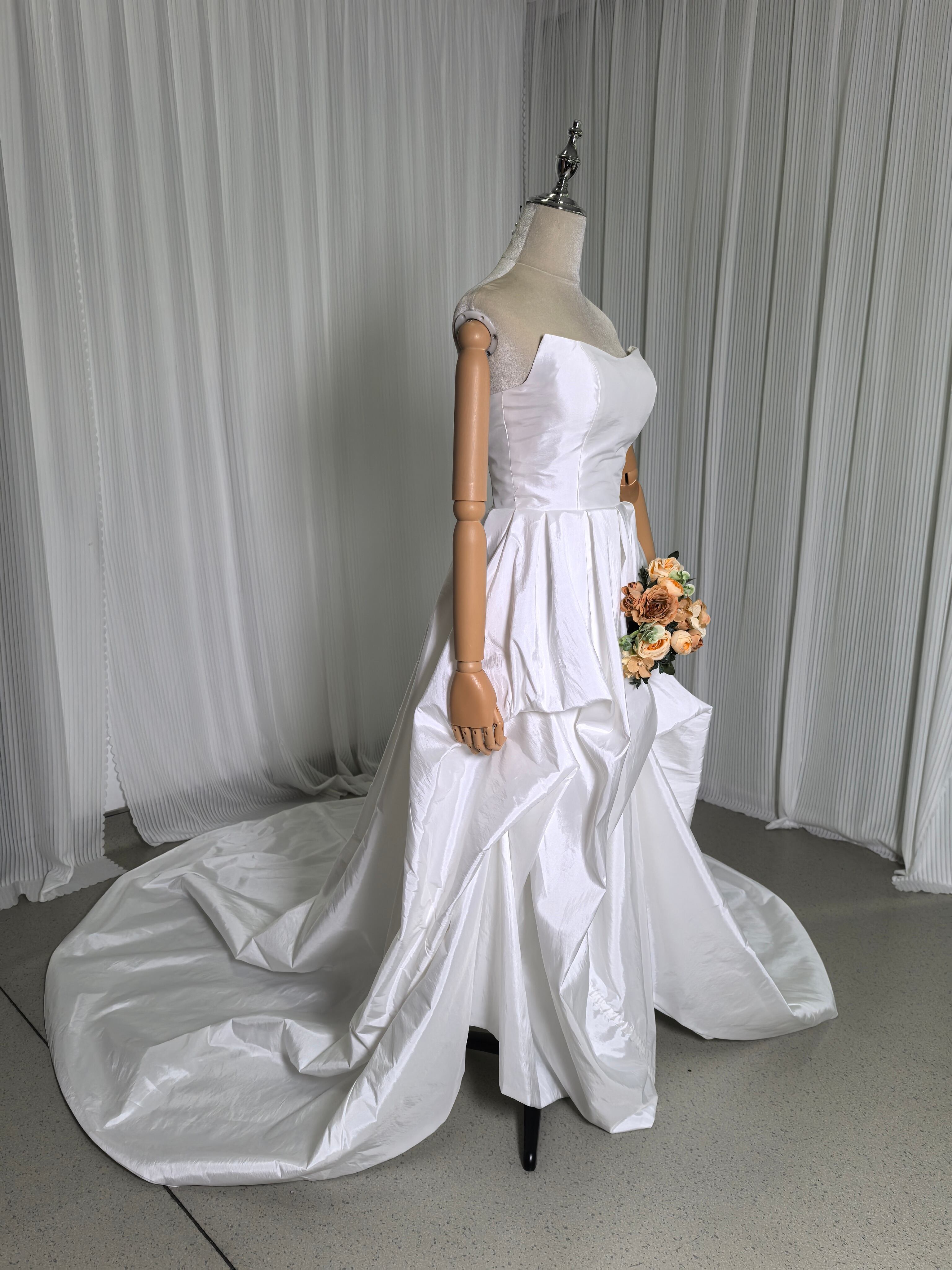 上品!ベアトップ オフホワイト シルクタフタ ウエディングドレス ショートインロングドレス 花嫁 結婚式/披露宴/前撮り