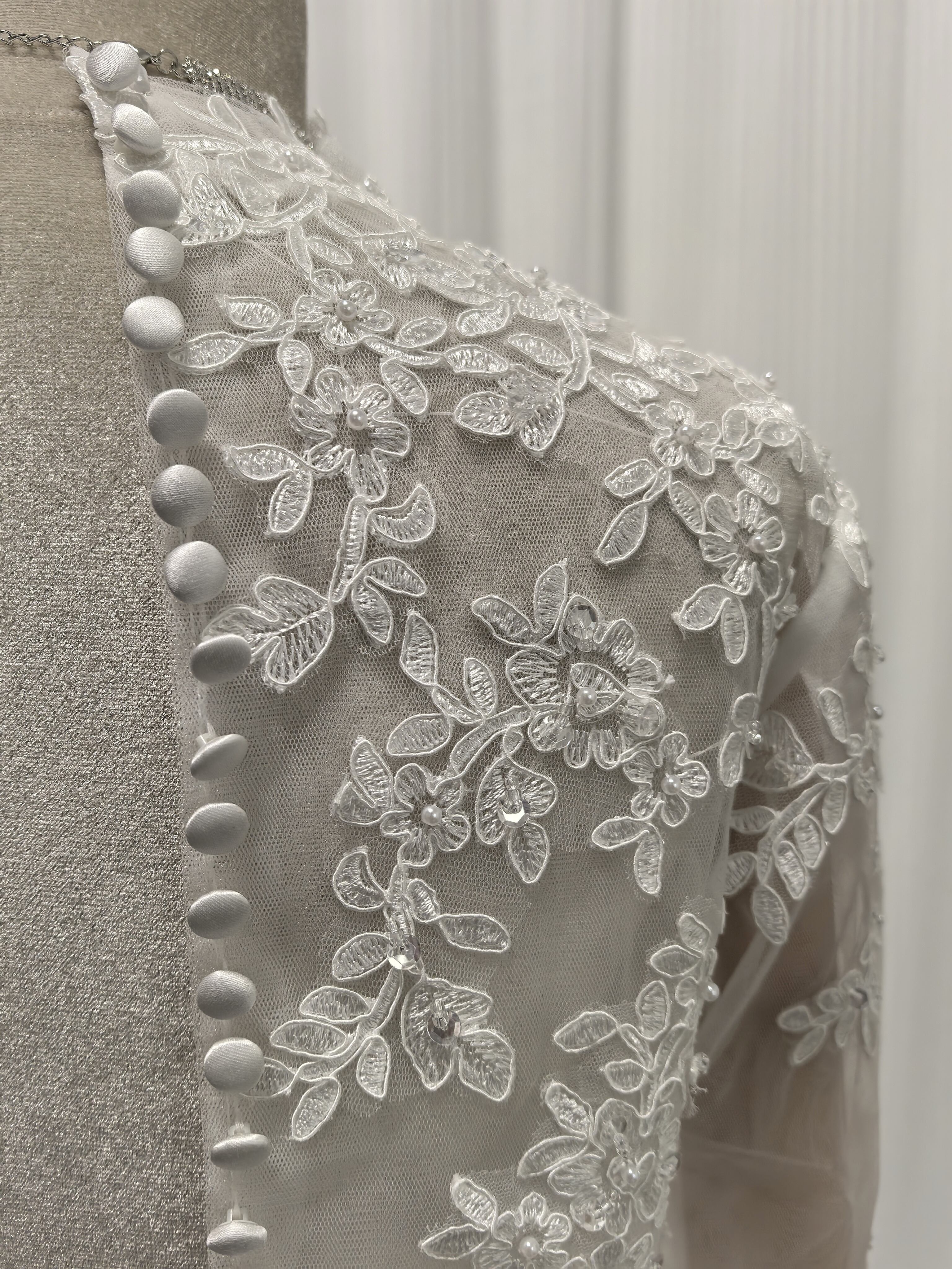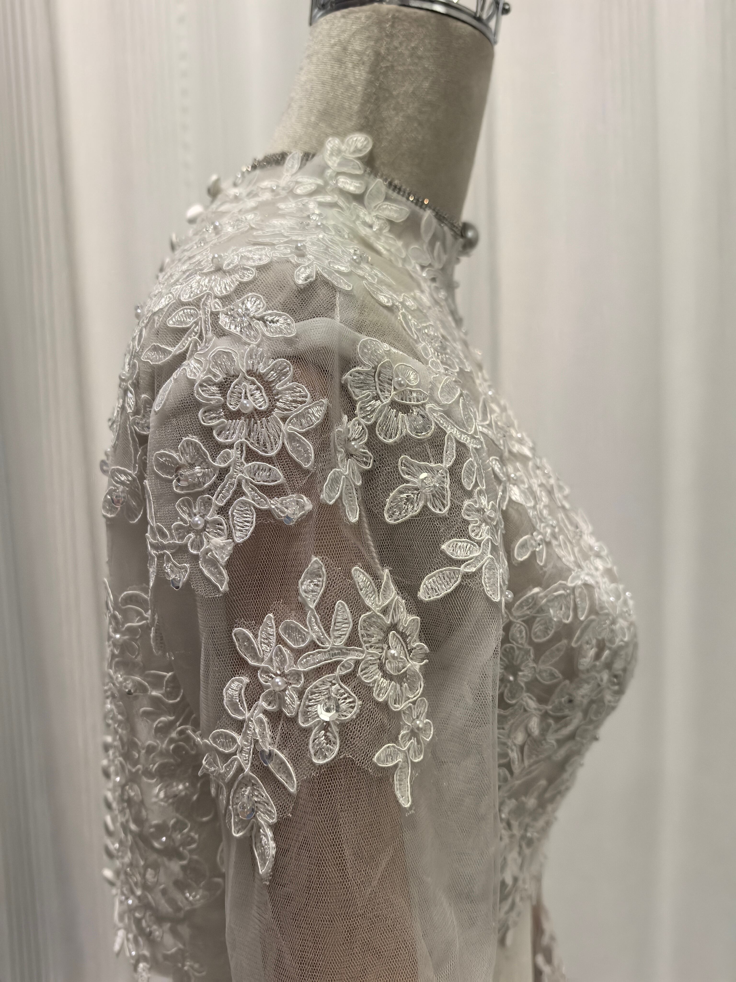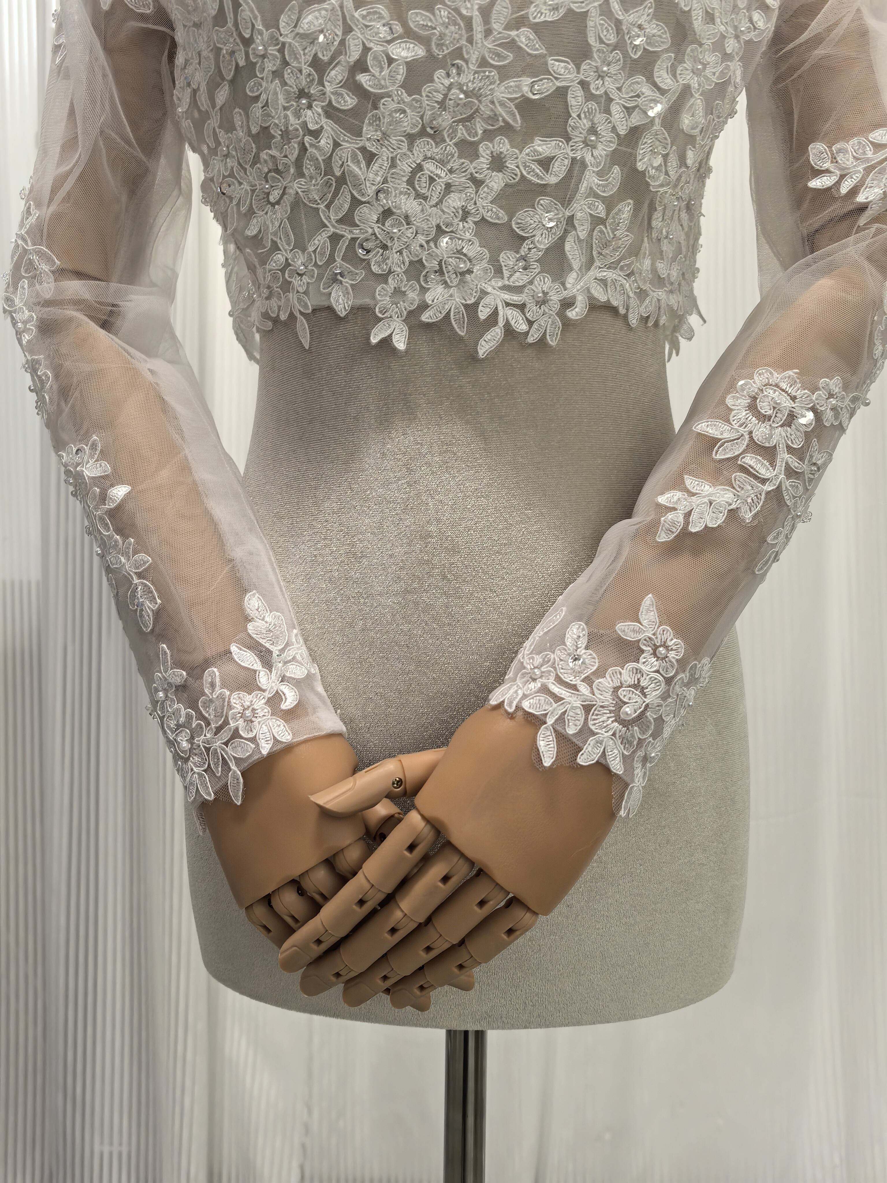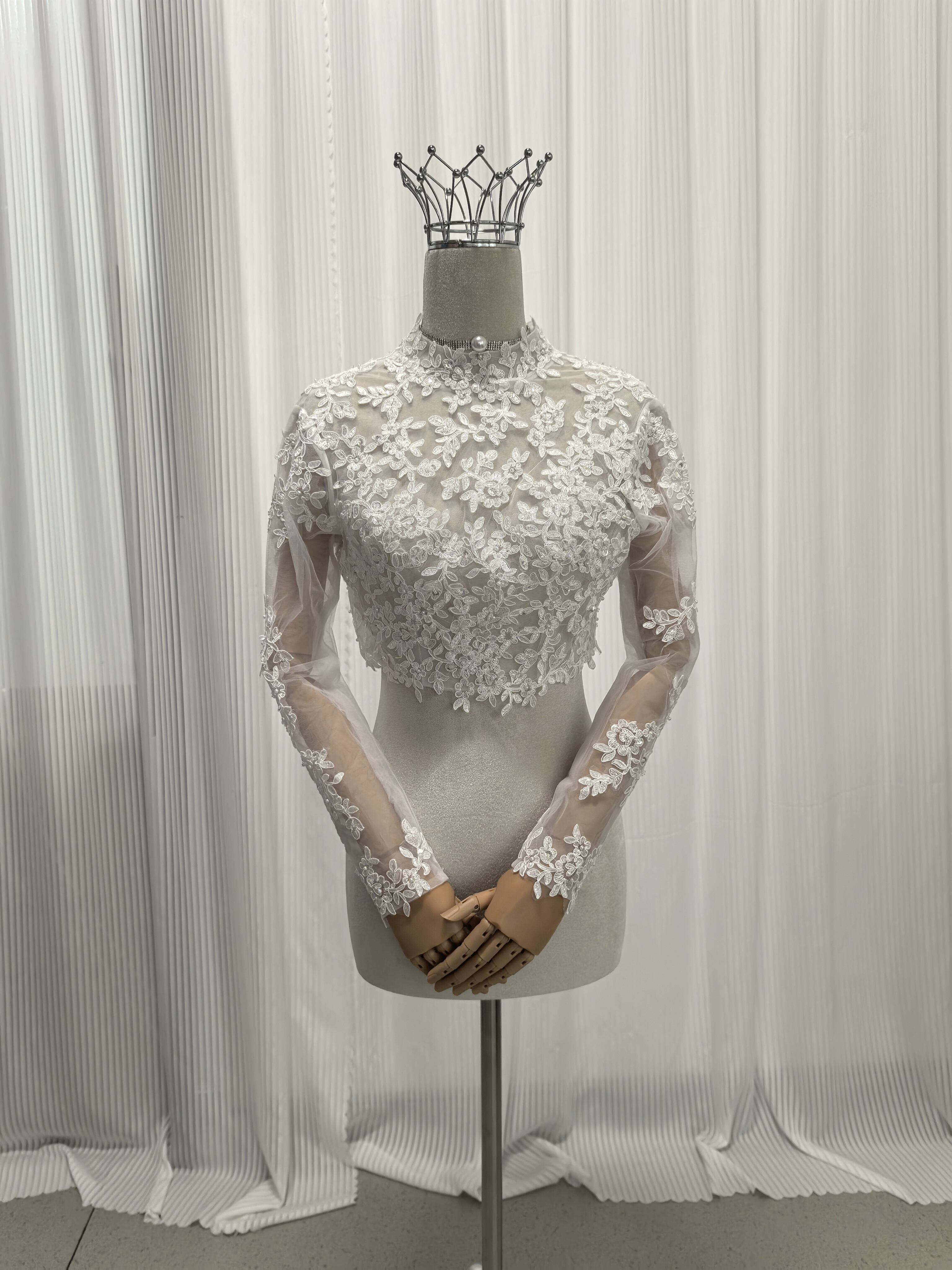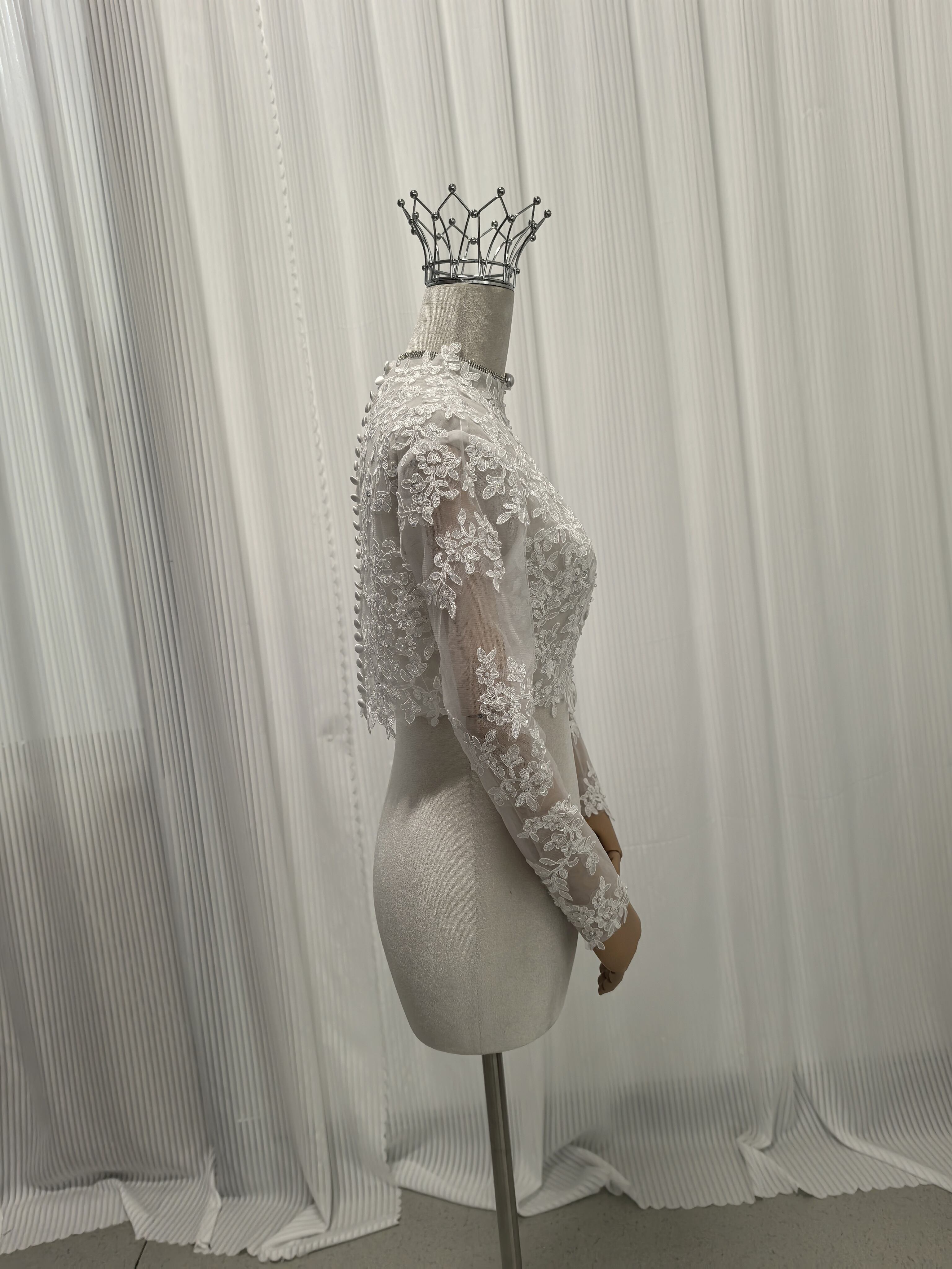 ハイネックボレロ トップス ブラウス 上品透け袖 3D立体レース刺繍 くるみボタン 長袖