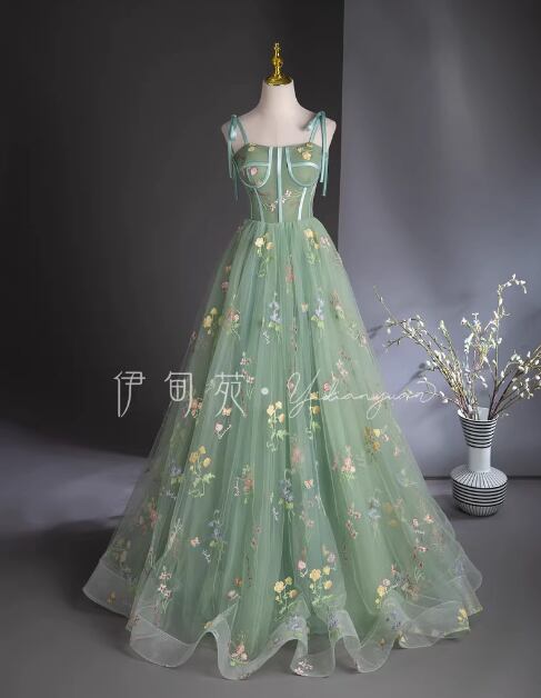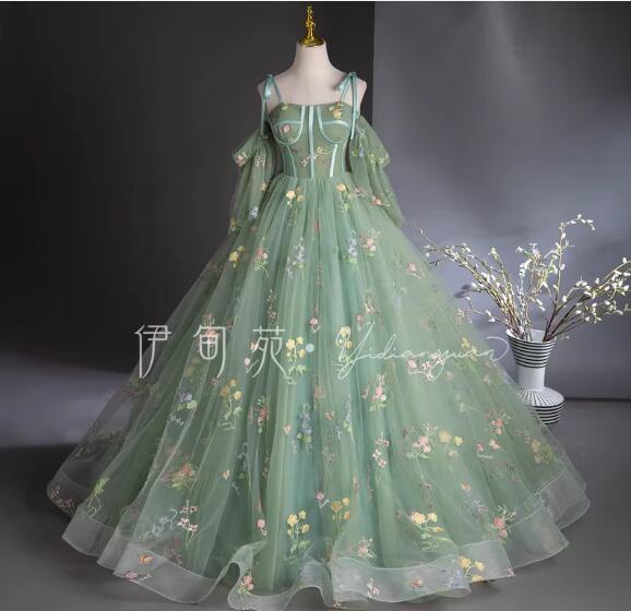 新品!美品!パーティードレス かわいい カラードレス グリーン/緑色 付け袖 花モチーフ刺繡 キャミソール Aラインドレス ロング ソフトチュール 写真撮影 コンサート 花嫁/前撮り/披露宴 | David1021k Dress(ダヴィドレス)