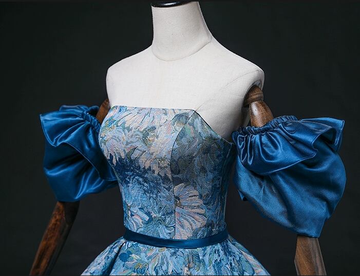 新品!美品!パーティードレス かわいい カラードレス ブルー/青 付け袖 ひまわりの花柄 ビスチェドレス Aラインドレス ロング ダンスドレス 写真撮影 コンサート 花嫁/前撮り/披露宴 | David1021k Dress(ダヴィドレス)