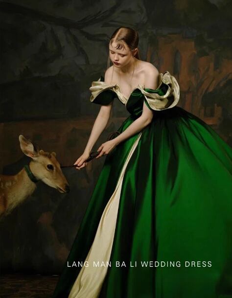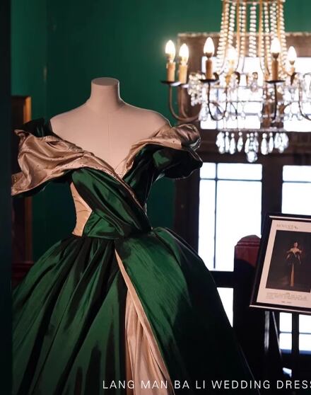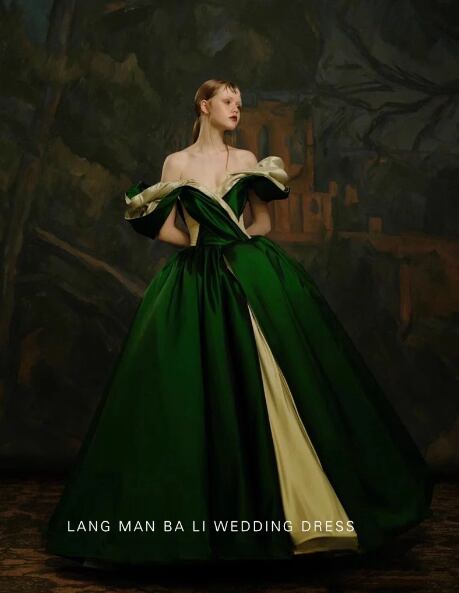 新品!美品!パーティードレス 2色カラードレス グリーン 深緑色 オフショルダー 高級サテン プリンセスライン ロング コンサート 司会者 写真撮影 ピアノ演奏ドレス 花嫁/前撮り/披露宴 | David1021k Dress(ダヴィドレス)