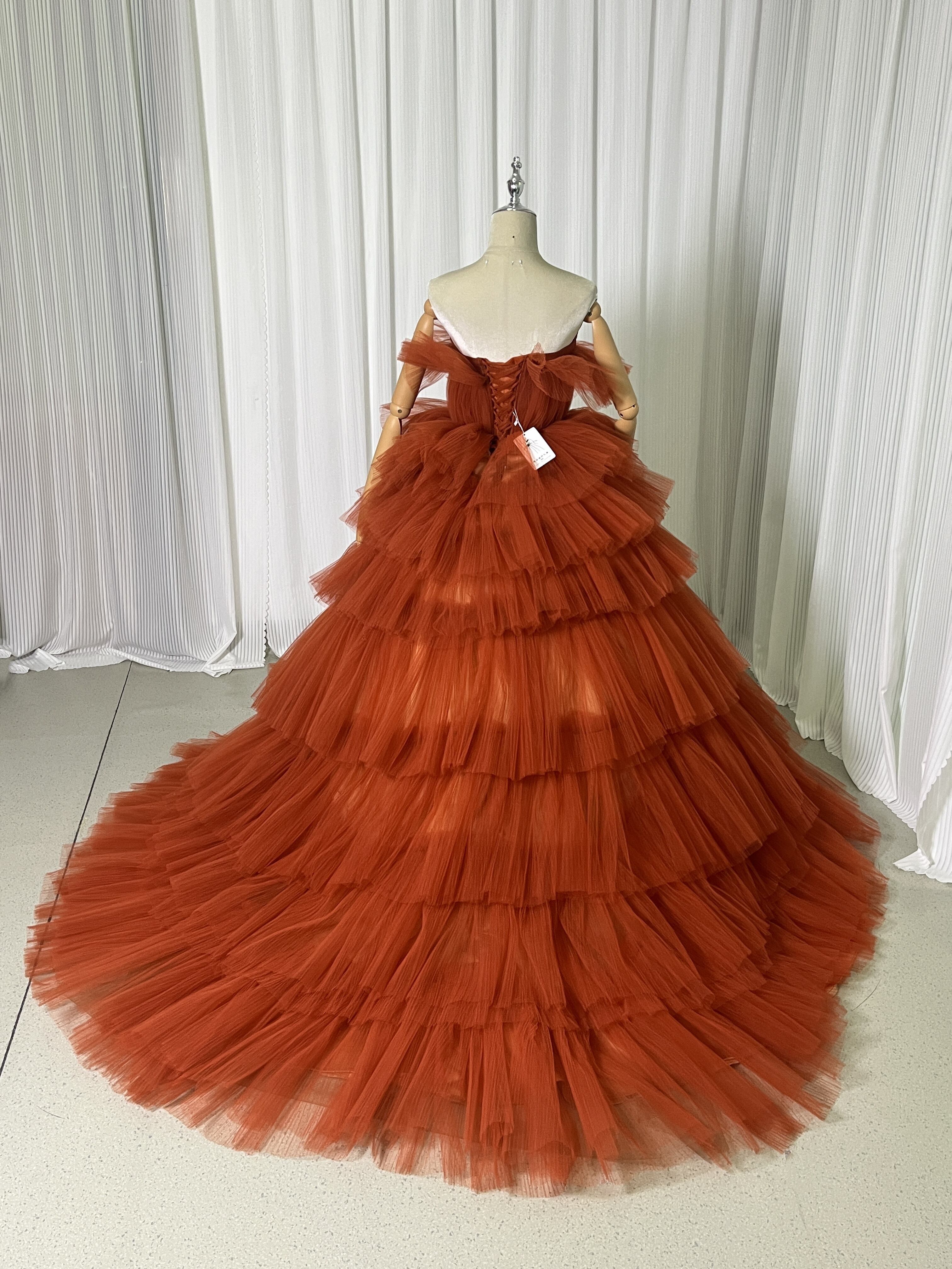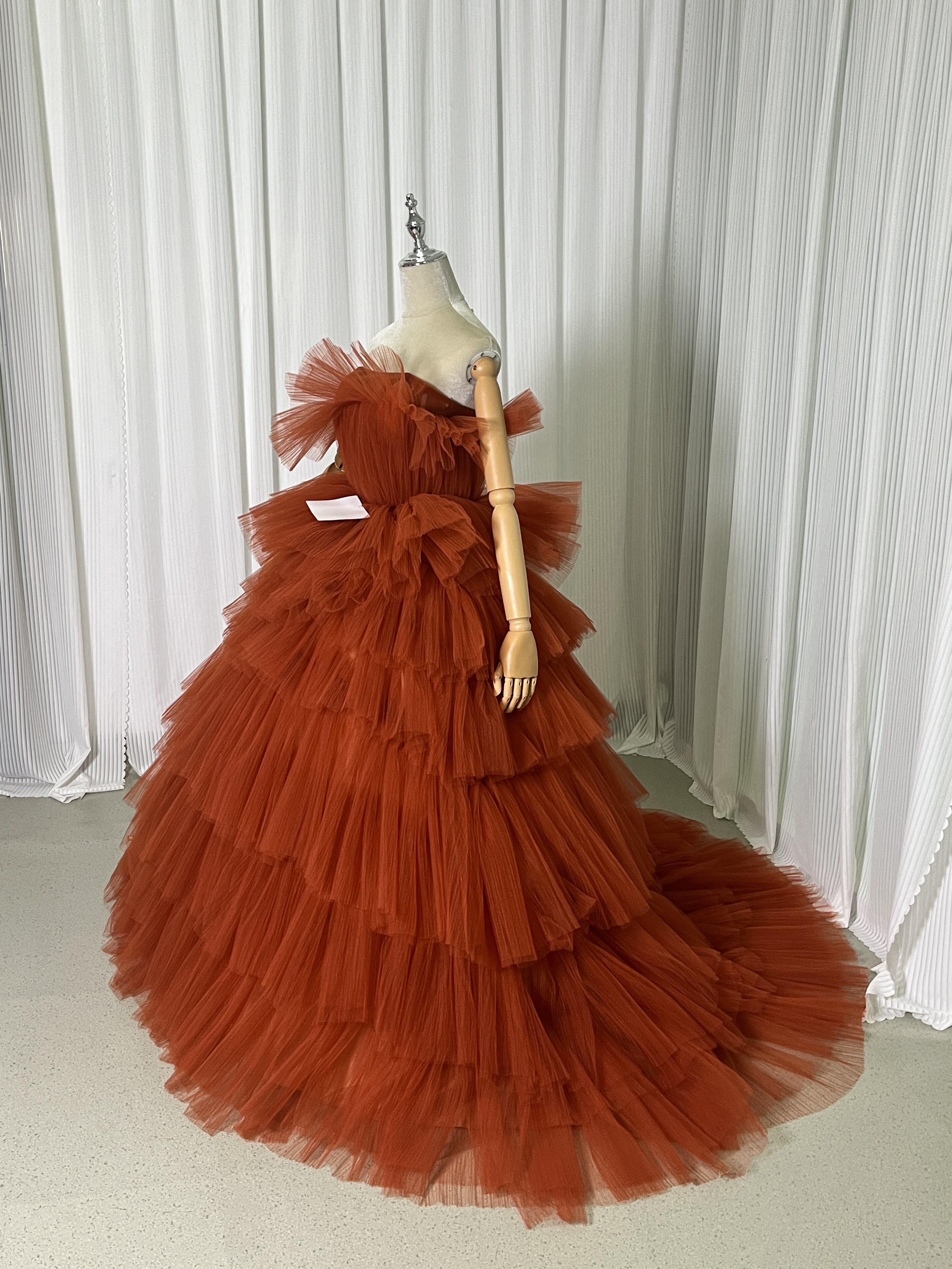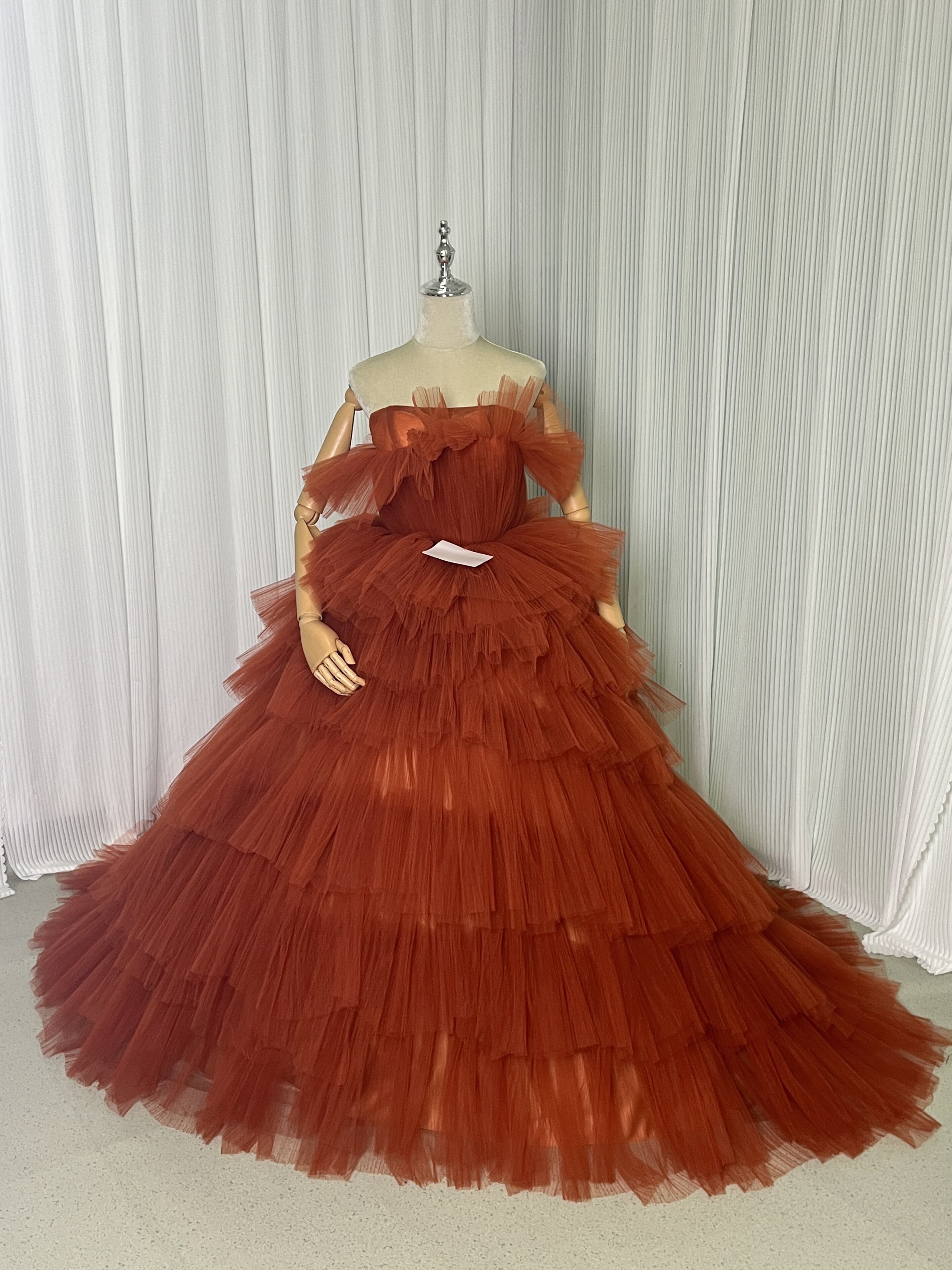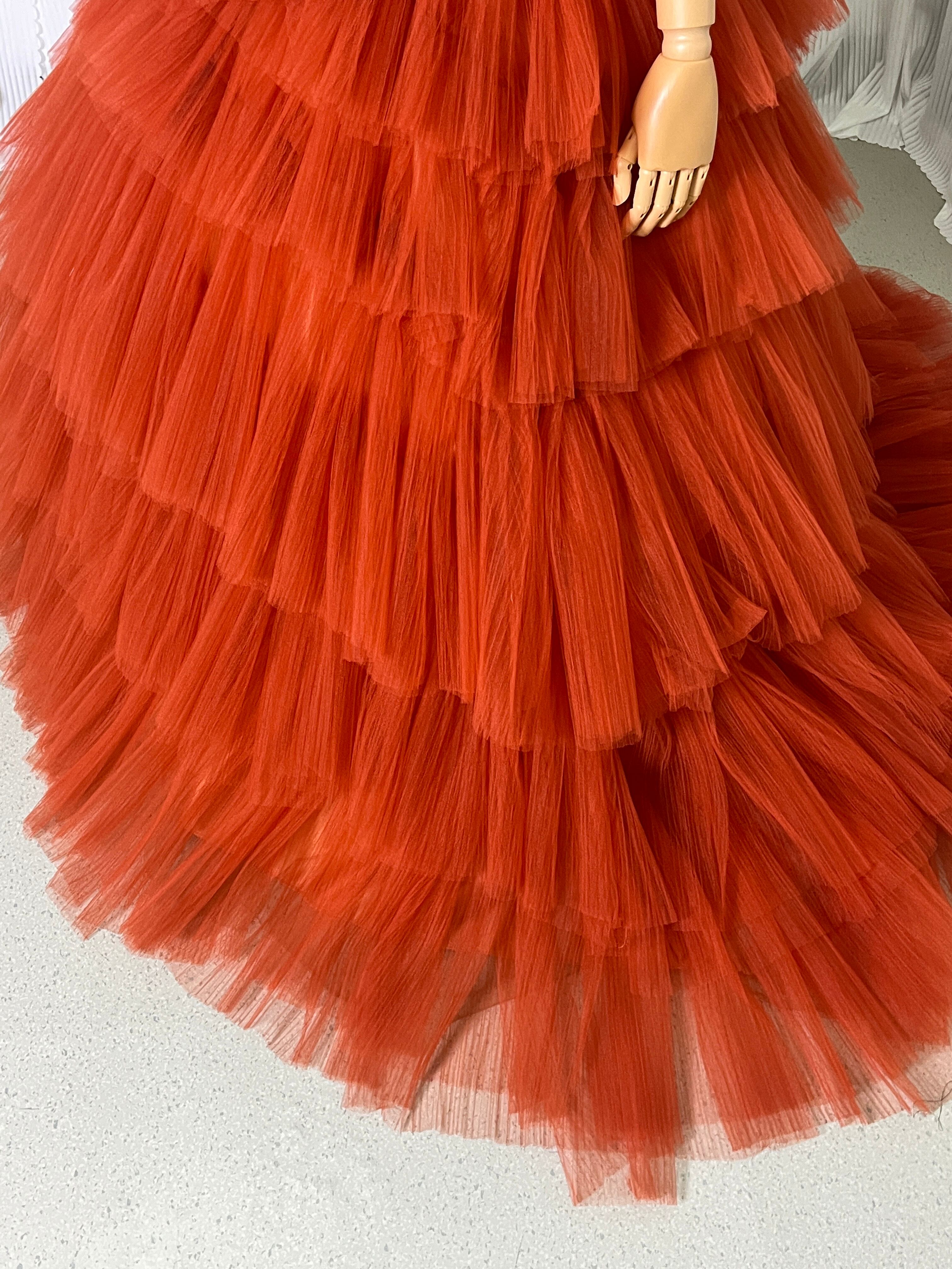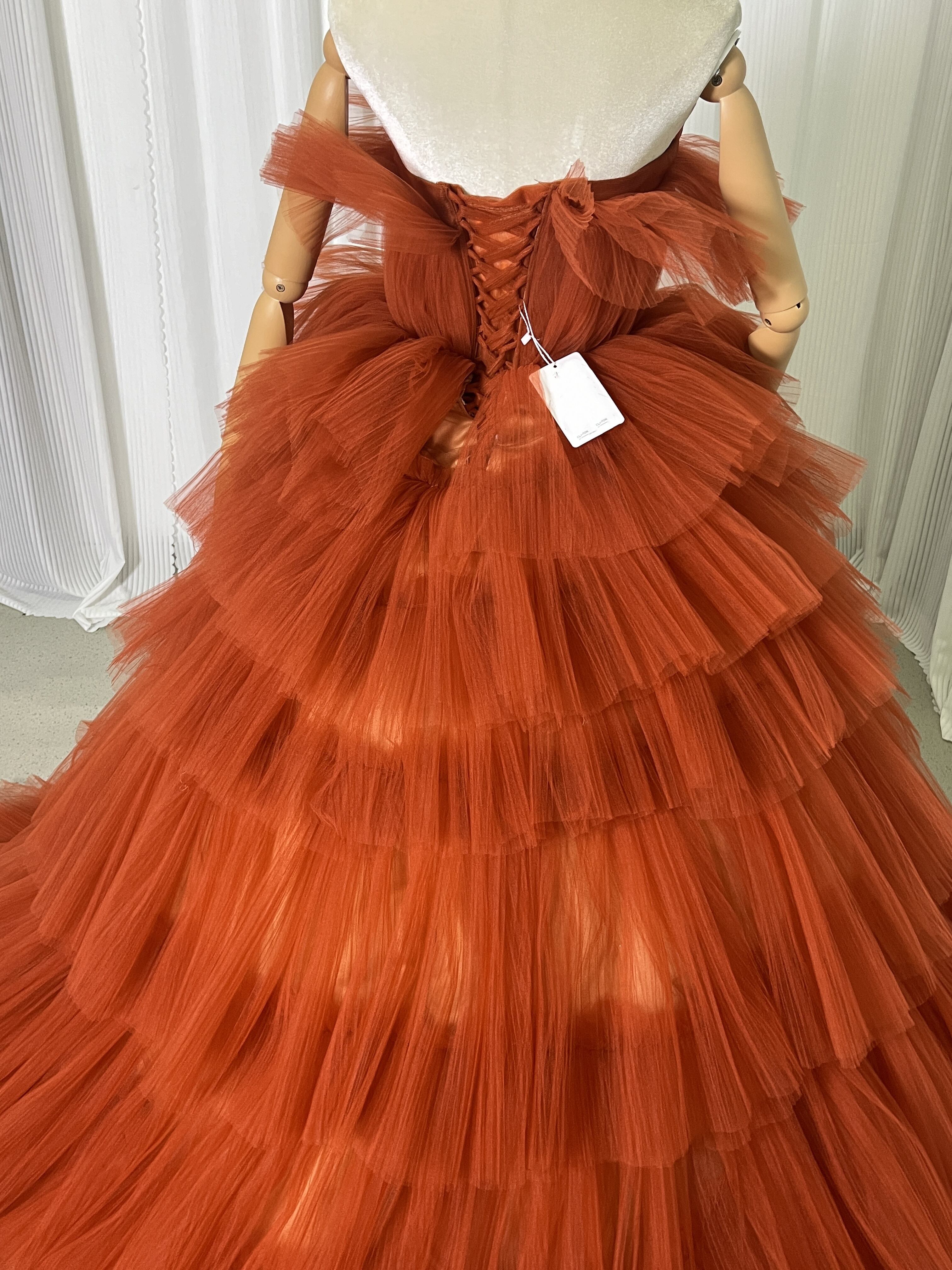 豪華!オレンジ ベアトップ カラードレス 柔らかく重ねたフリルドレス ロングトレーン もこもこドレス ボリュームたっぷり ふわふわドレス 花嫁/挙式/前撮り/結婚式/披露宴 | David1021k Dress(ダヴィドレス)