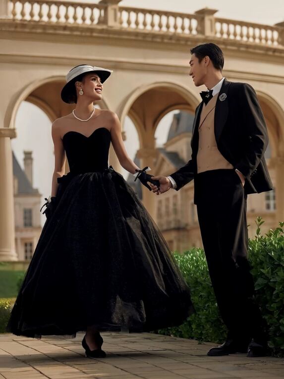 新品!美品!カラードレス パーティードレス ブラック/黒 ベアトップ ビスチェドレス ヘップバーン風 ロング Aラインドレス 写真撮影 コンサート ダンスドレス 海外挙式/花嫁/前撮り/披露宴 | David1021k Dress(ダヴィドレス)