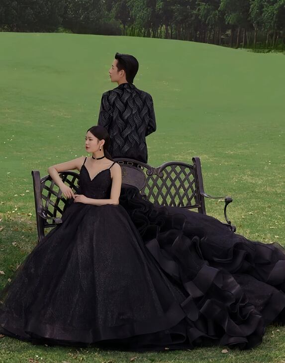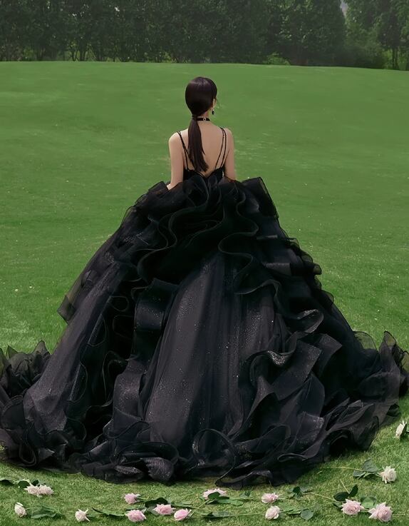 新品!美品!カラードレス ブラック/黒 フリルドレス 華やかなトレーン パーティードレス ヘップバーン風 大きいリボン プリンセスライン 写真撮影 コンサート 海外挙式/花嫁/前撮り/披露宴 | David1021k Dress(ダヴィドレス)