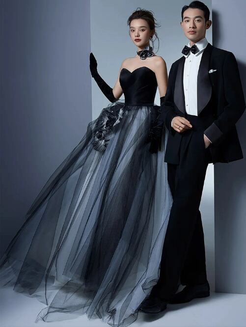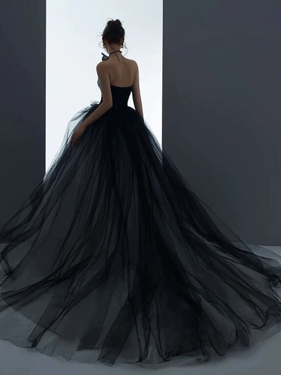 新品!美品!カラードレス ブラック/黒 ソフトチュール パーティードレス ロングトレーン ヘップバーン風 花リボン Aラインドレス スレンダーライン 写真撮影 コンサート 海外挙式/花嫁/前撮り/披露宴 | David1021k Dress(ダヴィドレス)