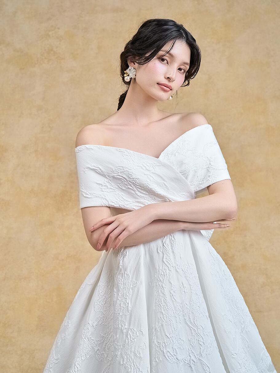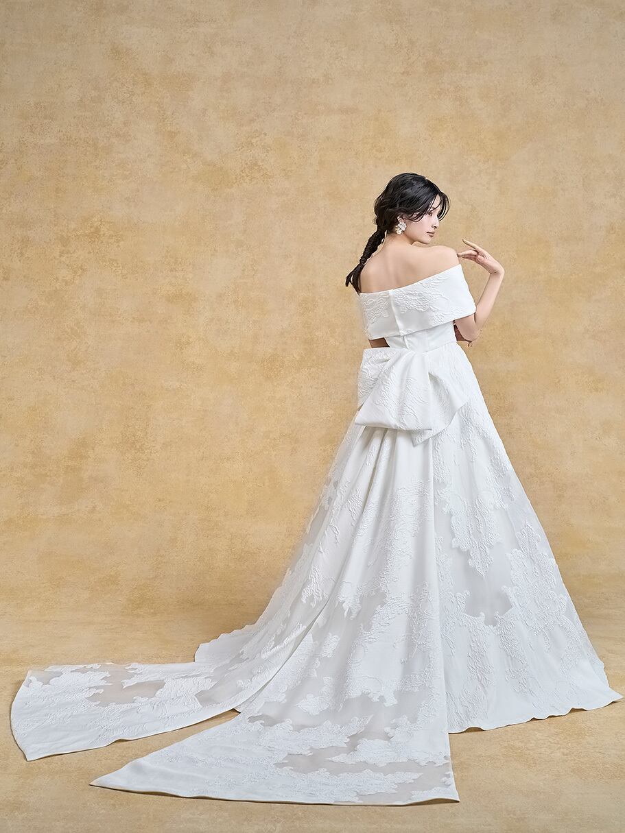 人気上昇!ウエディングドレス オフショルダー Aラインドレス 大きいリボン 繊細ジャカード生地 ロングトレーン エレガント 花嫁/挙式/前撮り/結婚式/披露宴