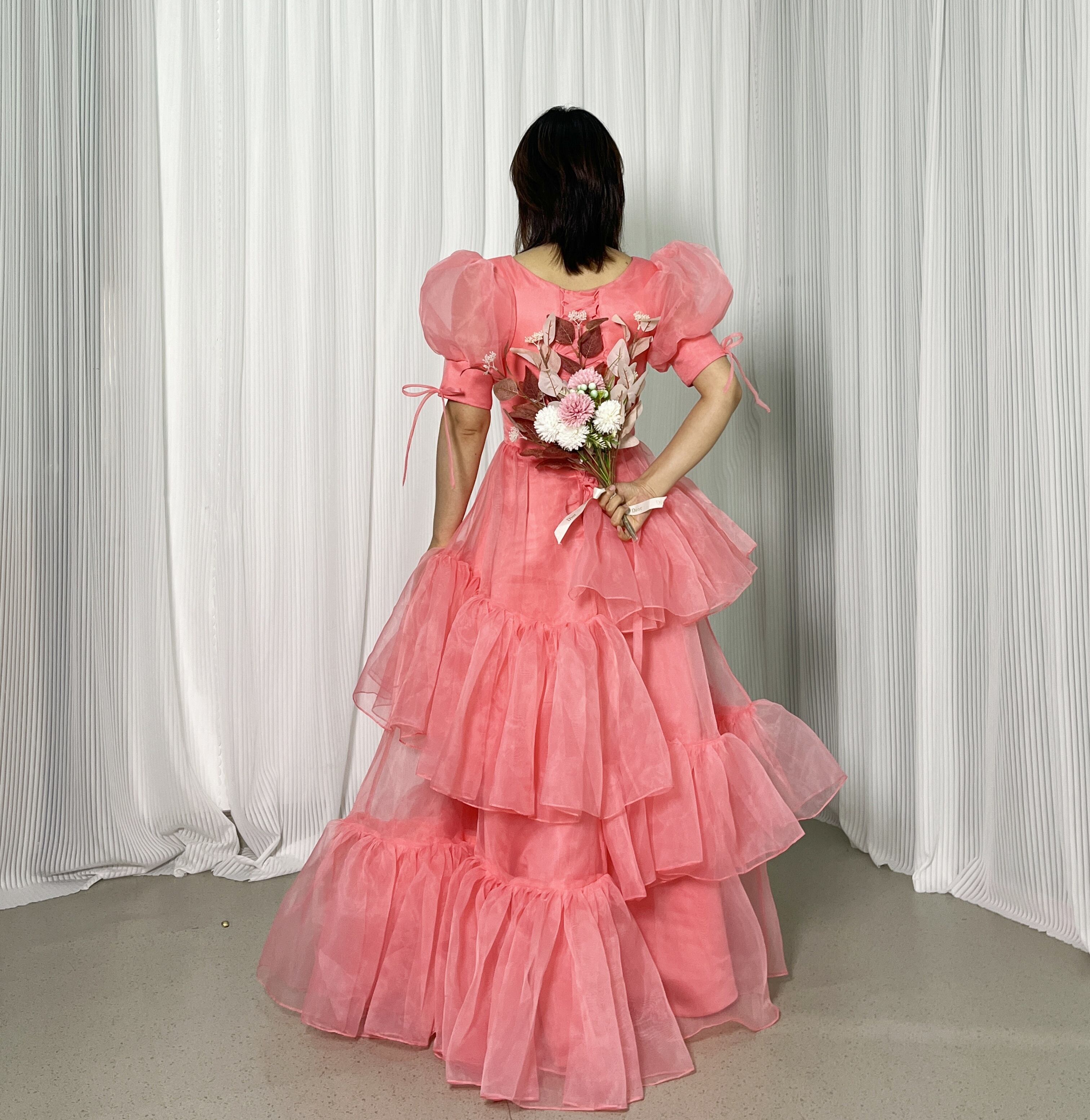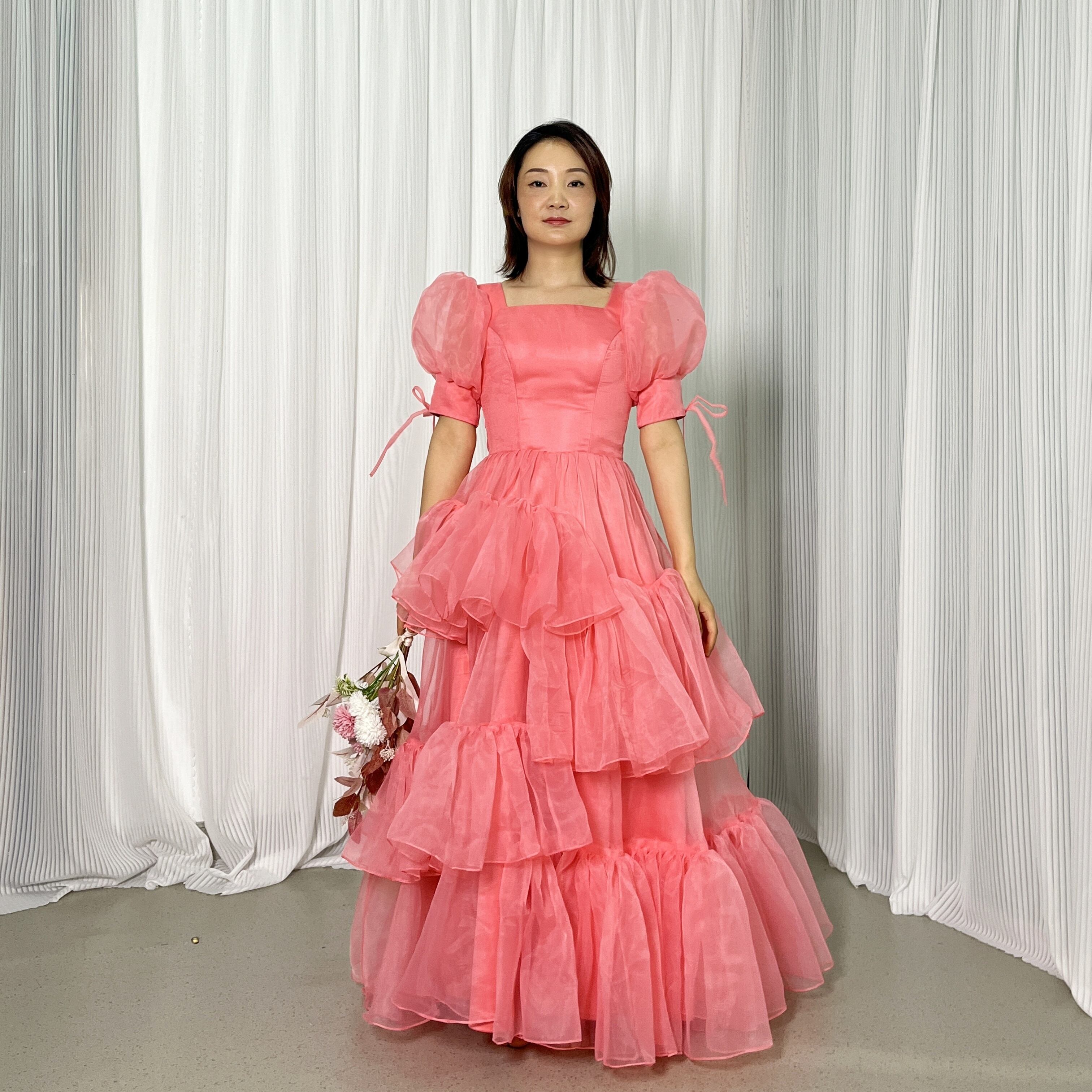 豪華! ピンク 上質オーガンジー カラードレス柔らかく重ねたチュールスカート 華やかなトレーン 花嫁/挙式/前撮り/結婚式/披露宴