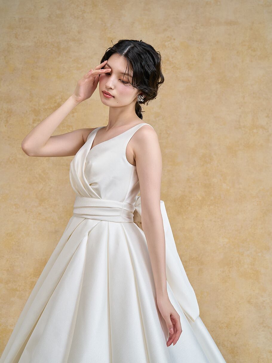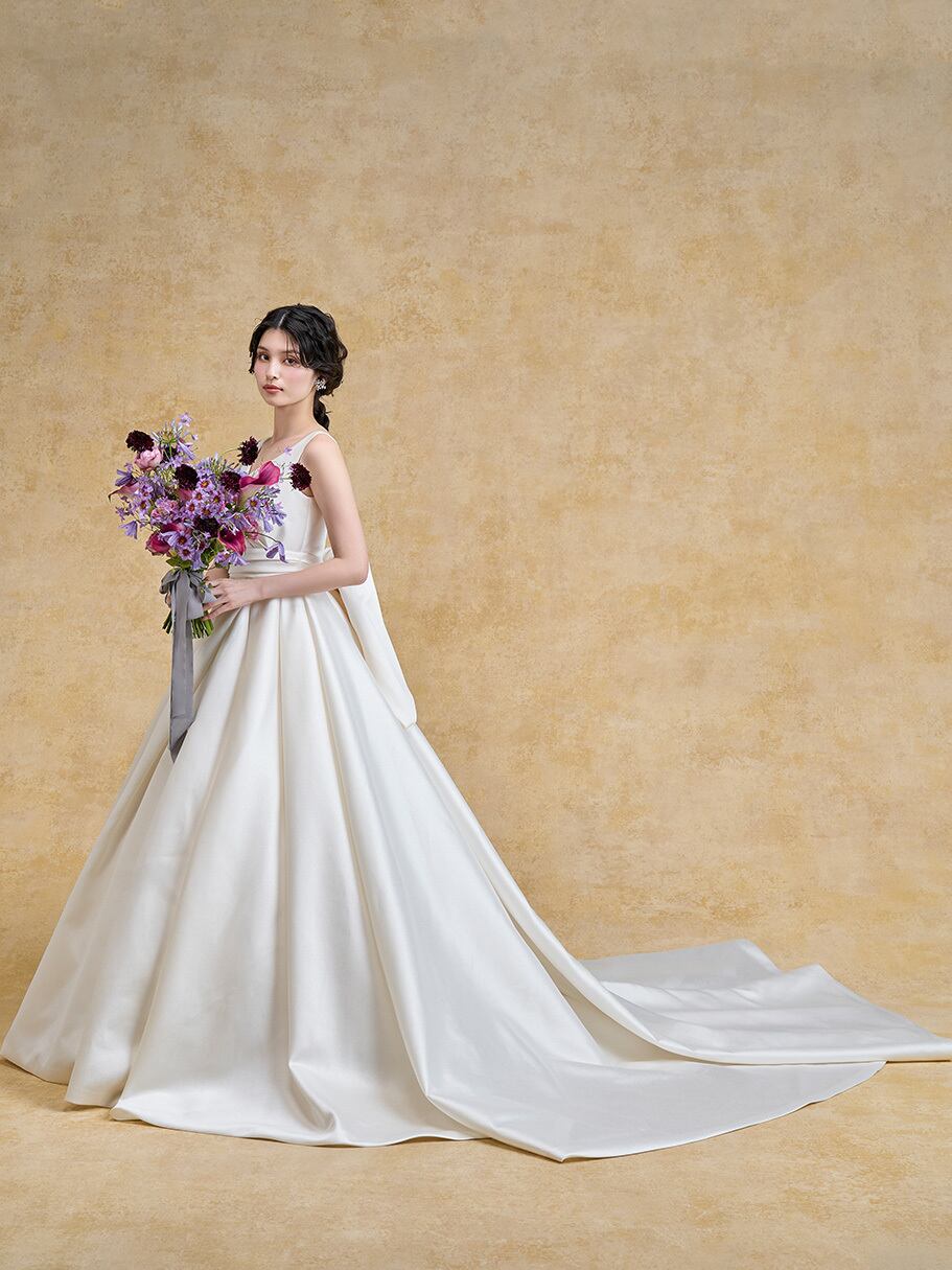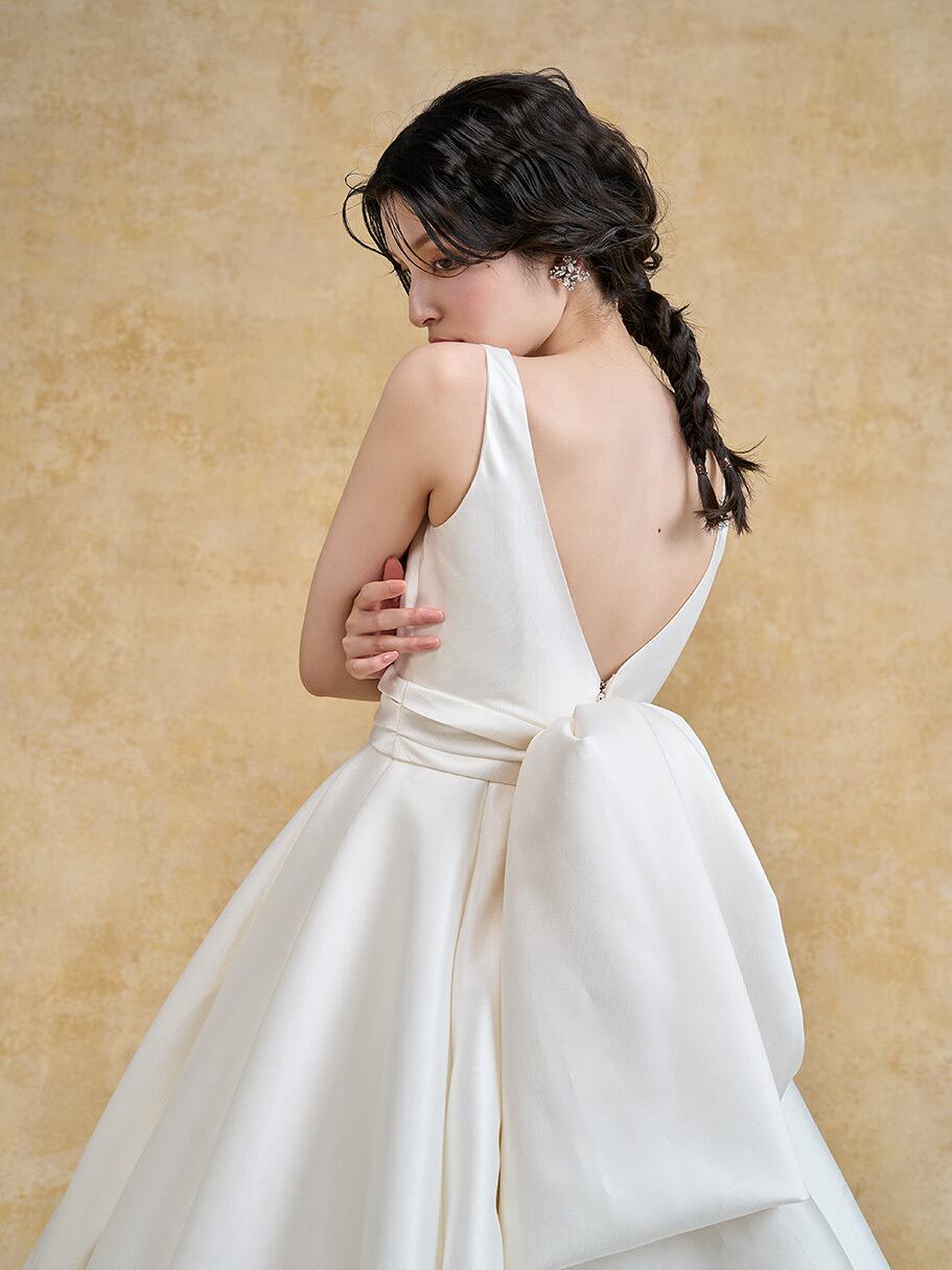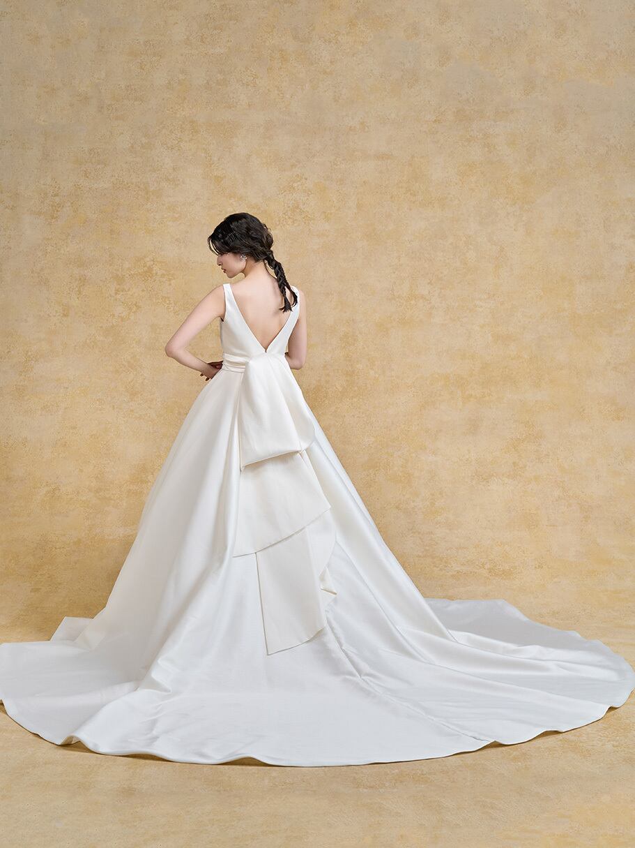 人気上昇!ウエディングドレス ノースリーブ シルクサテンドレス Aラインドレス ロングトレーン バックリボン エレガント 花嫁/挙式/前撮り/結婚式 | David1021k Dress(ダヴィドレス)