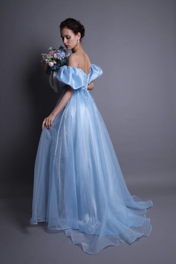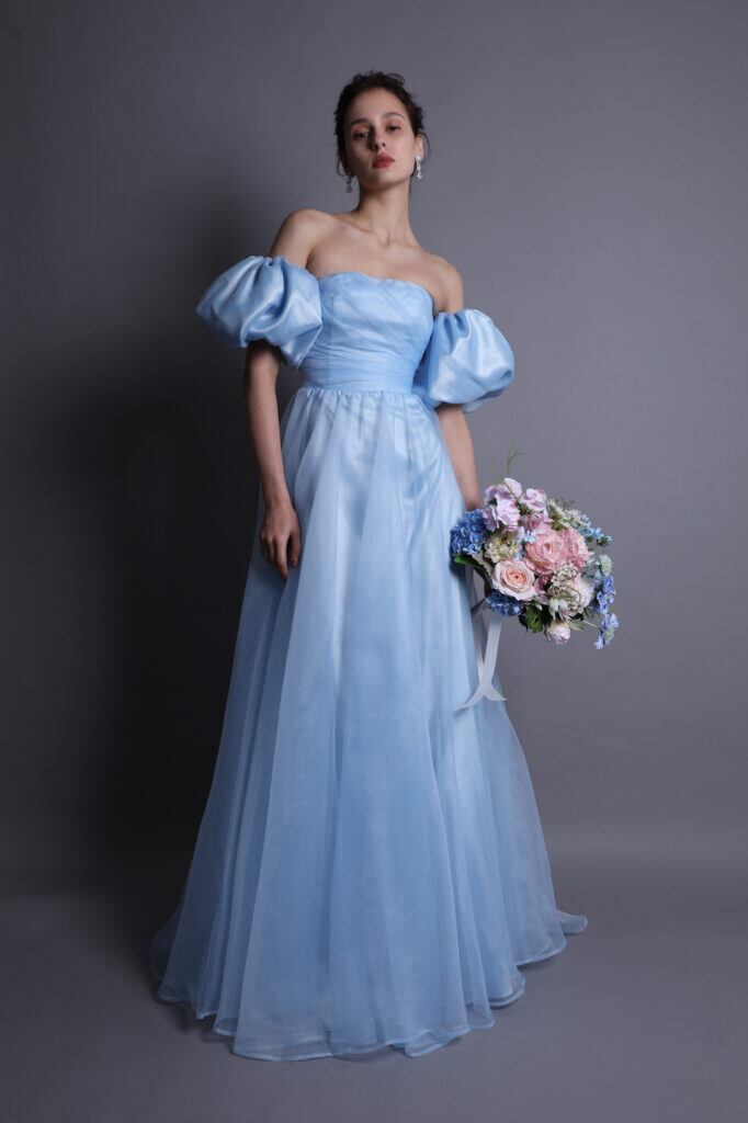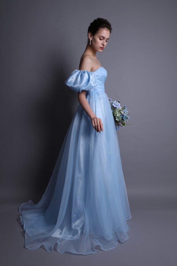 上品!美品!青色カラードレス ライトブルー パフスリーブ パーティードレス シルクサテンドレス エンパイアライン コンサート 挙式/花嫁/前撮り/披露宴 | David1021k Dress(ダヴィドレス)