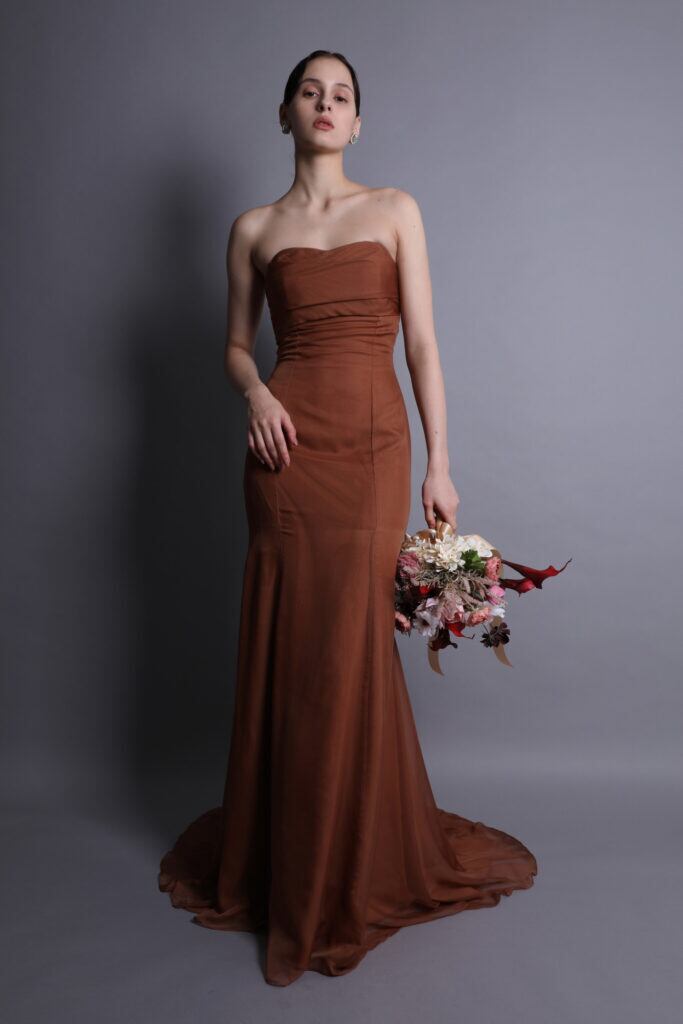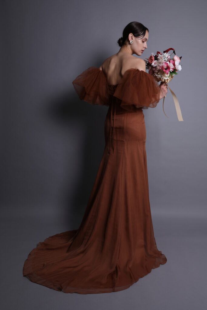 上品!美品!カラードレス テラコッタ色 チュール袖 パーティードレス マーメードドレス 二次会 コンサート 挙式/花嫁/前撮り/お色直し
