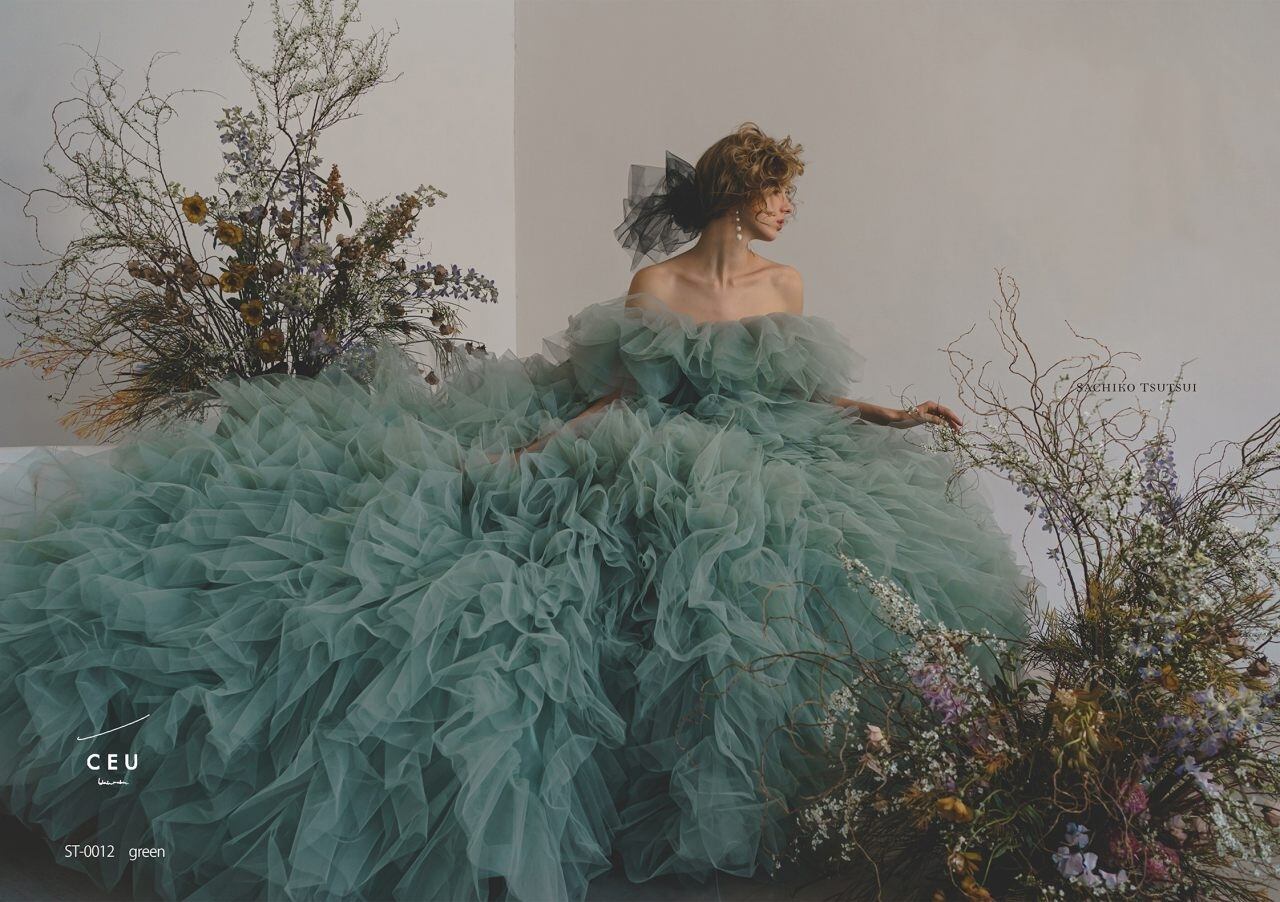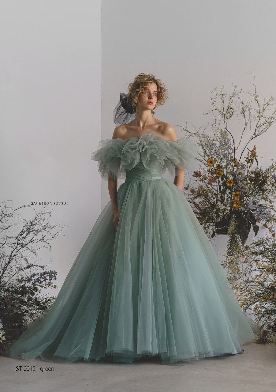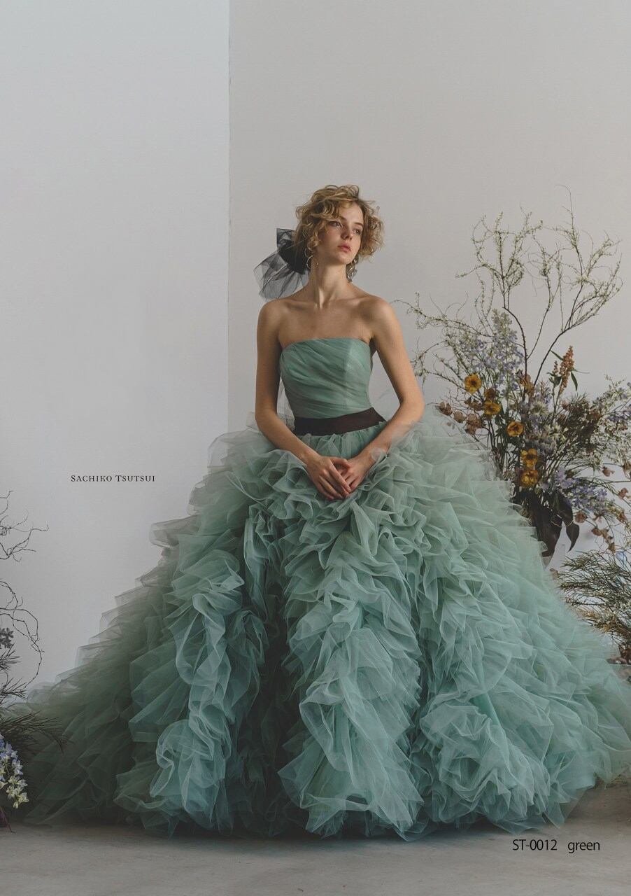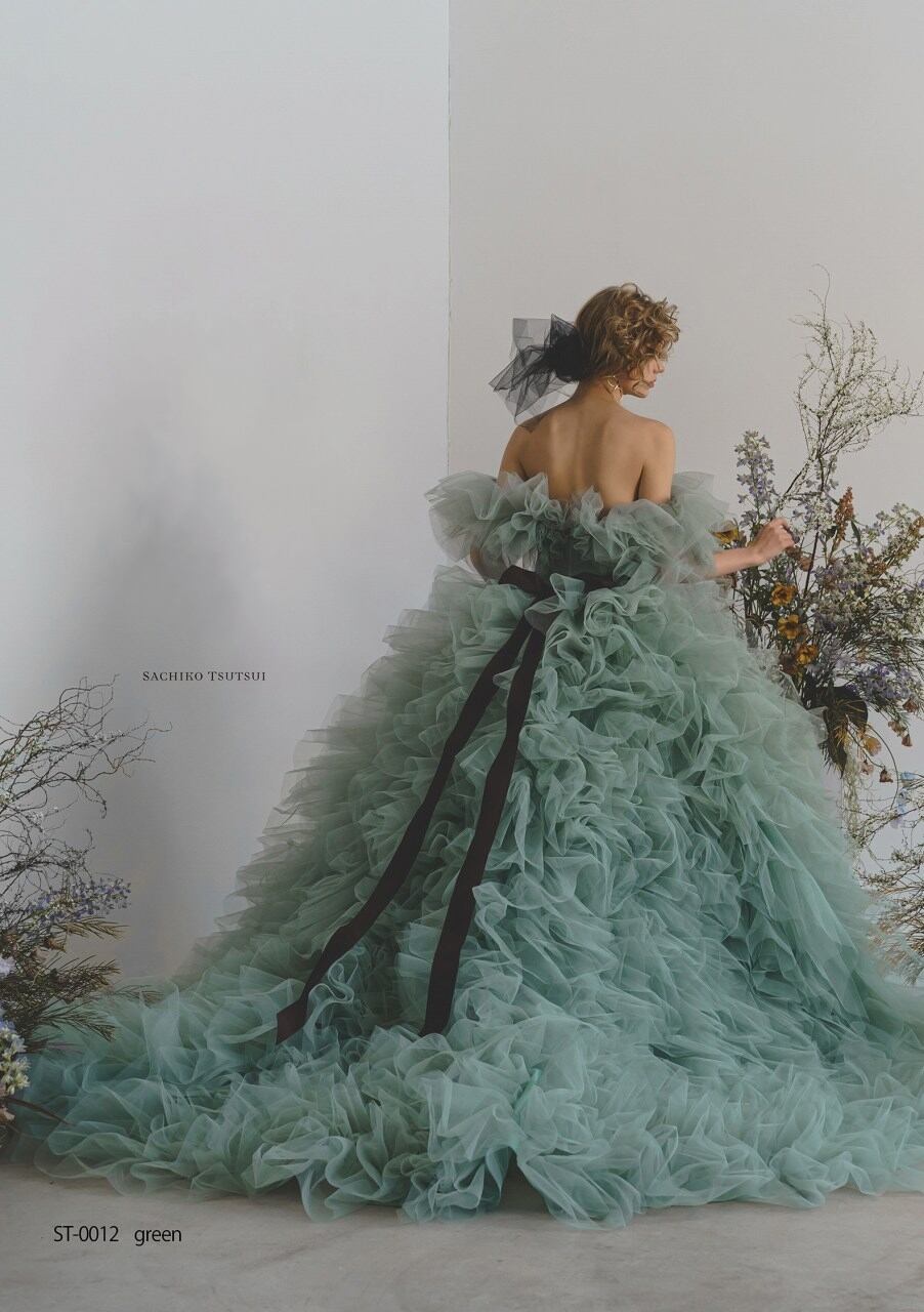 高品質!冬婚!4WAYもこもこカラードレス ミントグリーン ふわふわフリルドレス ボリュームたっぷりのチュールドレス 冬の結婚式 ロングトレーン お色直し フォトウエディング/前撮り【オーダーメイド】
