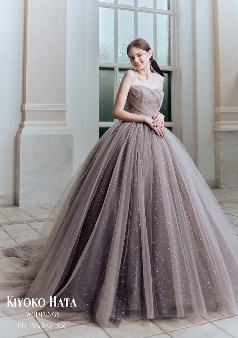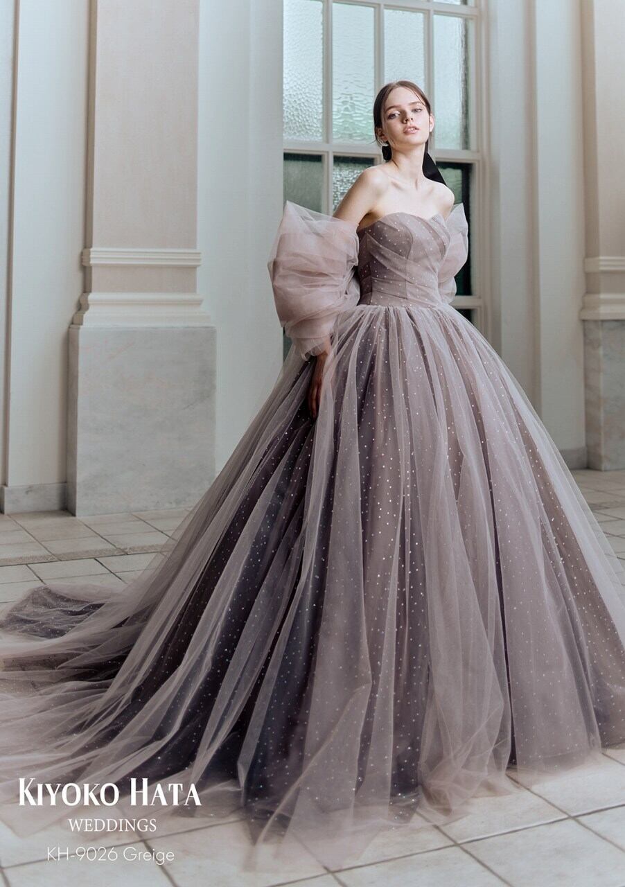 高品質!2WAYカラードレス ミルクティーベージュカラー キラキラパーティードレス 大きいなバックリボン ふわふわチュール袖 ロングトレーン お色直し フォトウエディング/前撮り【オーダーメイド】 | David1021k Dress(ダヴィドレス)