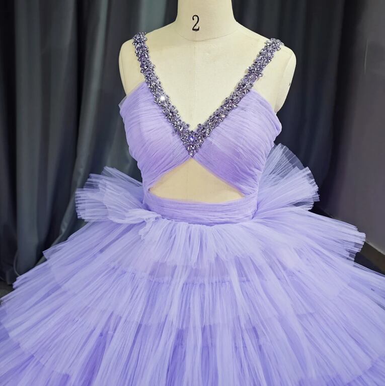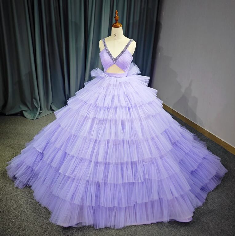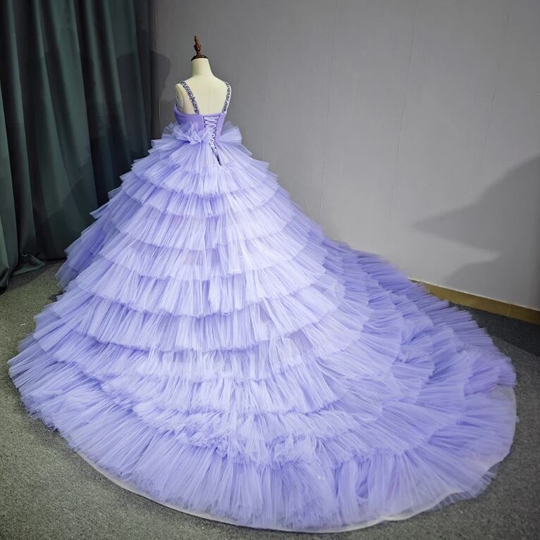 高品質!ビジュー もこもこカラードレス パープル/紫 ティアードスカート ボリューミーのチュールドレス ロングトレーン ダンスドレス お色直し 前撮り/フォトウエディング